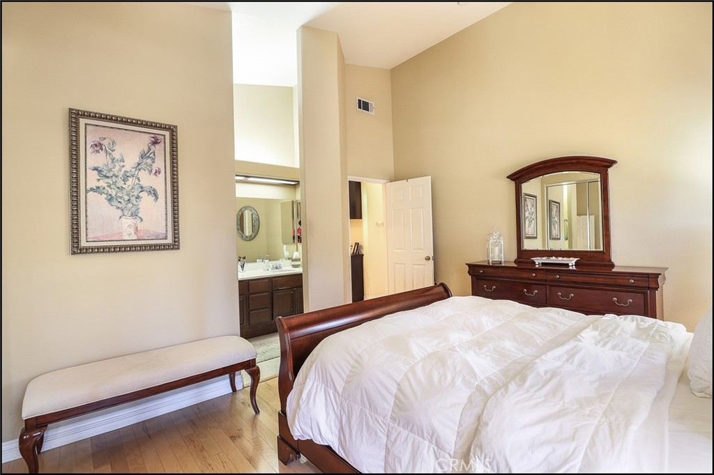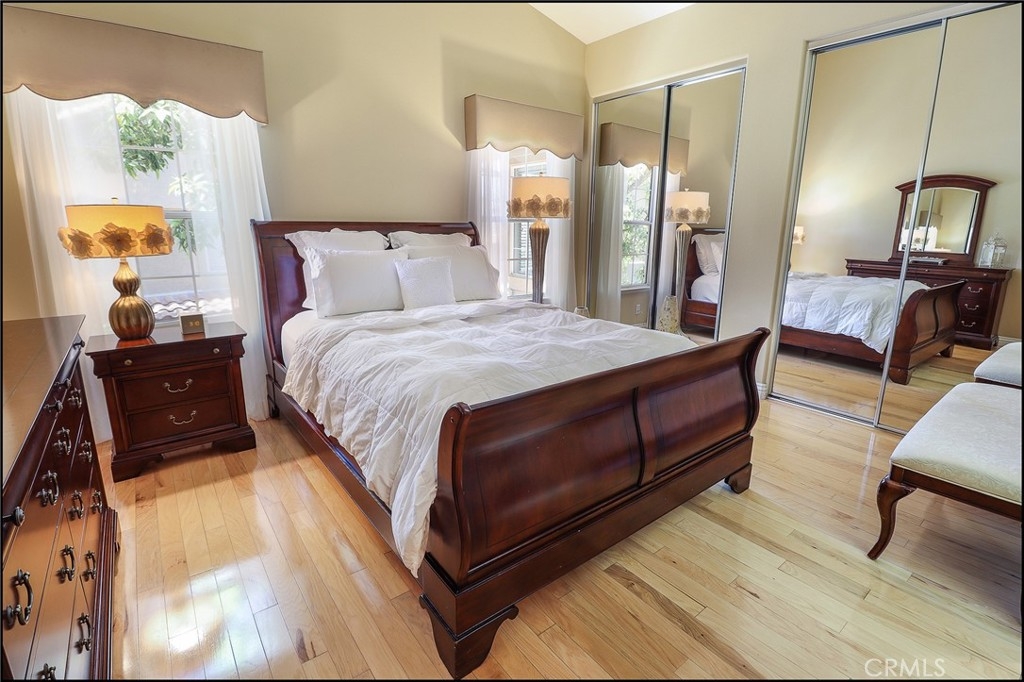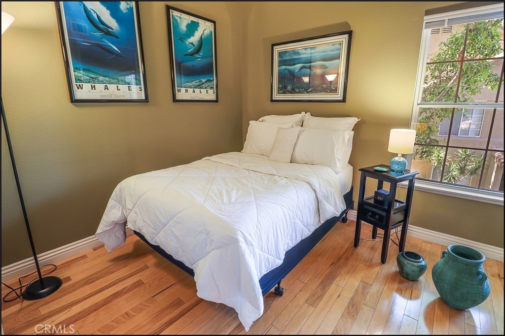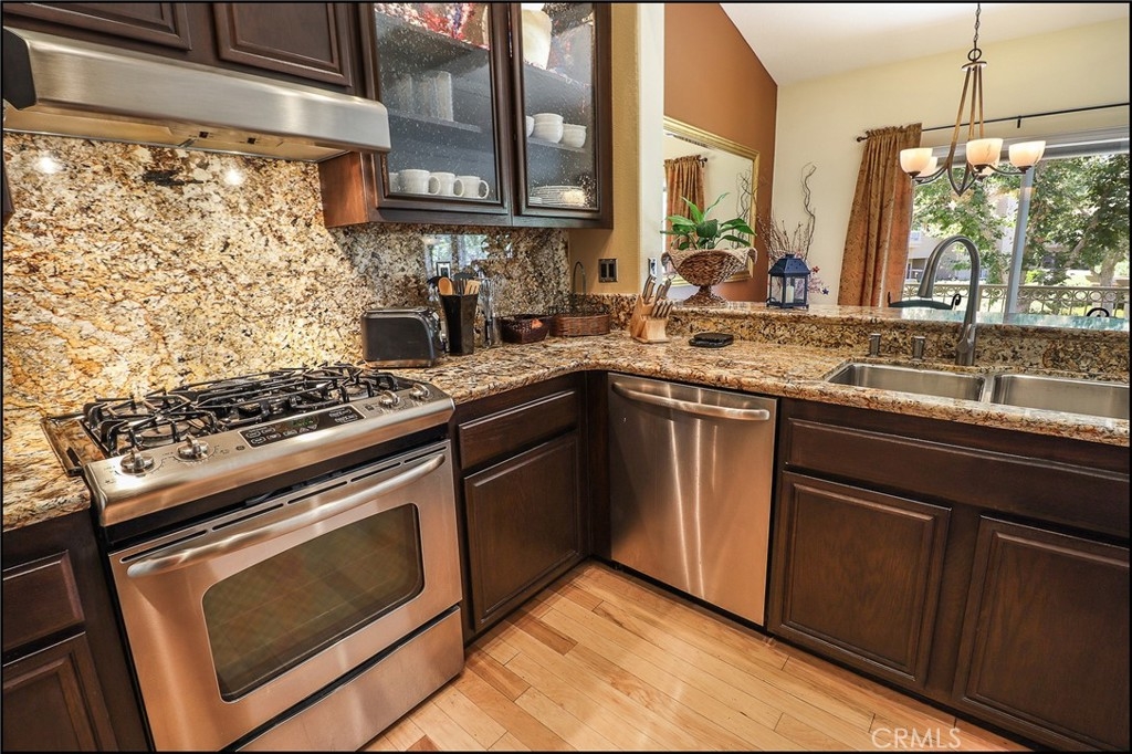 EXCEPTIONAL END UNIT LOCATION AND UPGRADES THROUGHOUT! Light, bright & airy floor plan offering a spacious living and dining room with engineered Mannington hickory hardwood floors, 5" custom baseboards throughout, designer two tone interior paint & stone accented fireplace, large windows allowing for plenty of natural light, and sliding glass door to lovely outside balcony perfect to enjoy your morning coffee. Spacious kitchen boasts recessed lighting, Brazilian granite countertops with full backsplash, stainless steel appliances, Kohler sink and designer faucet, custom stained cabinets & glass front cabinets with lighting. Large master suite with mirrored closet doors, and plenty of windows, and master bathroom featuring a large vanity with dual sinks, upgraded fixtures, custom stained cabinets and tile/marble flooring. Second bedroom offers mirrored closet doors, large windows, and custom two tone paint, and full hall bathroom with custom stained cabinet, upgraded fixtures and tile/marble flooring. Large hall closet and linen cabinets, full size inside laundry room with lots of cabinet space and tile/marble flooring, newer water heater, direct garage access and new repiping as of 2018 top off the highlights of this fantastic property. Amazing end unit location with views of mature trees and greenbelts. All this plus excellent proximity to Aliso Viejo Town Center with shopping and entertainment, easy toll road (73)and beach access (via 133), highly sought after schools and nearby hiking, biking and nature trails!