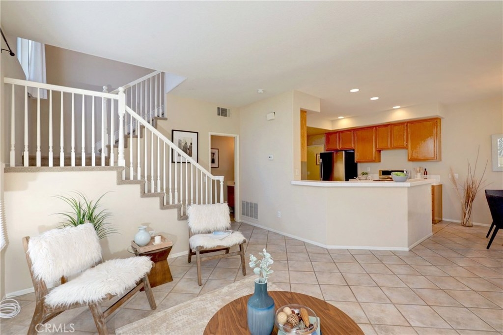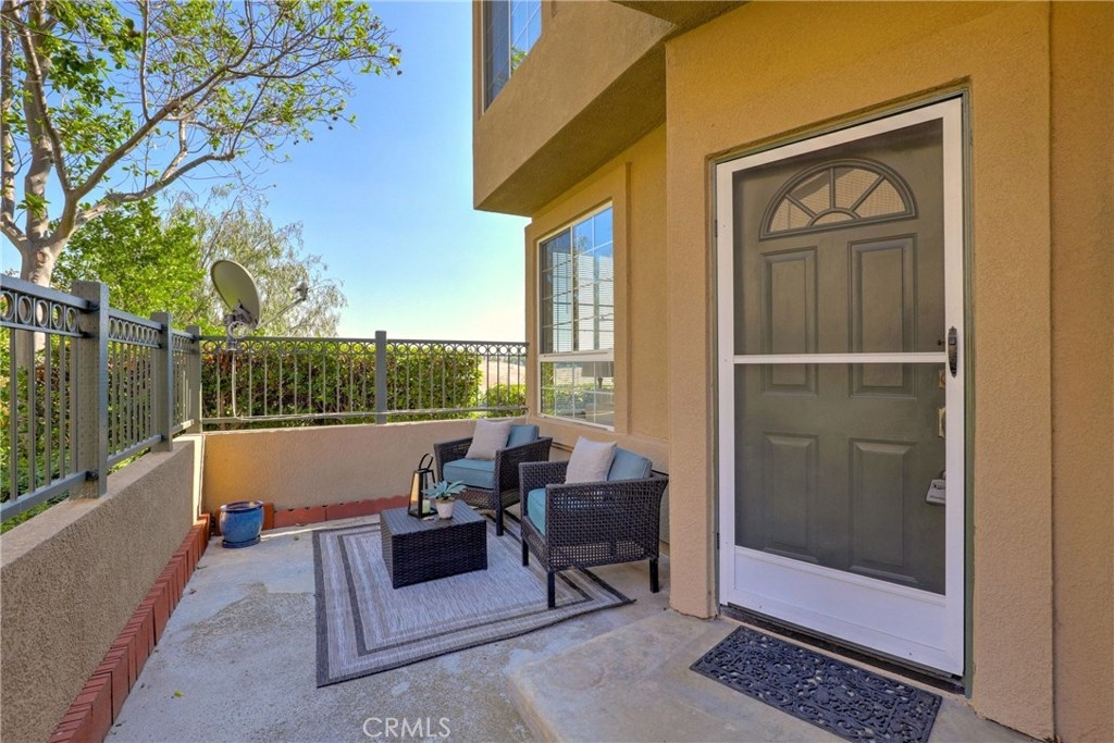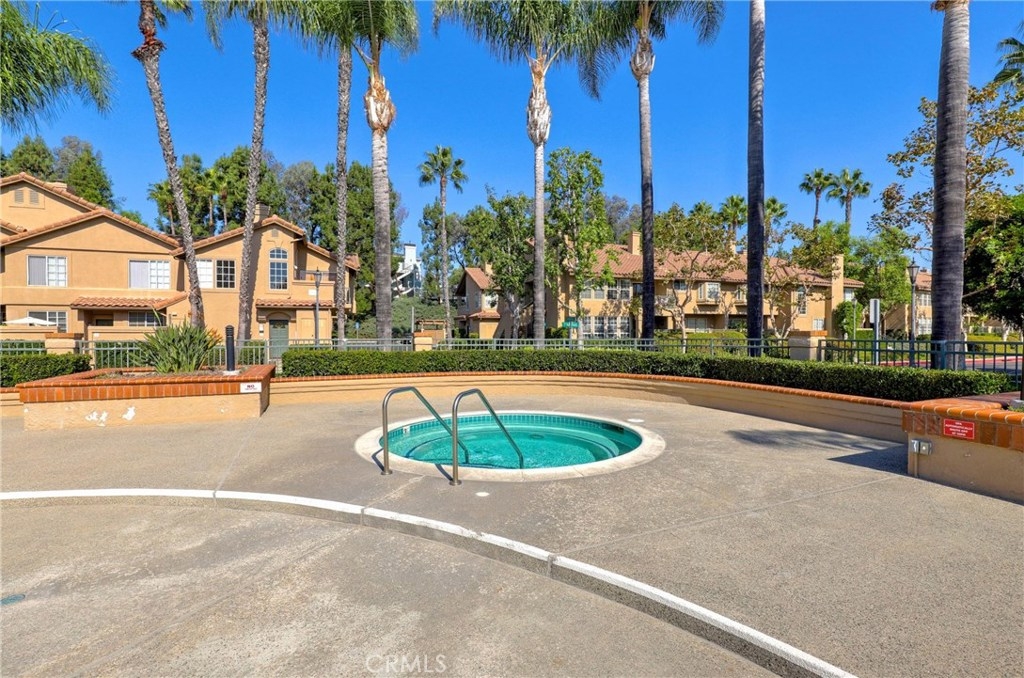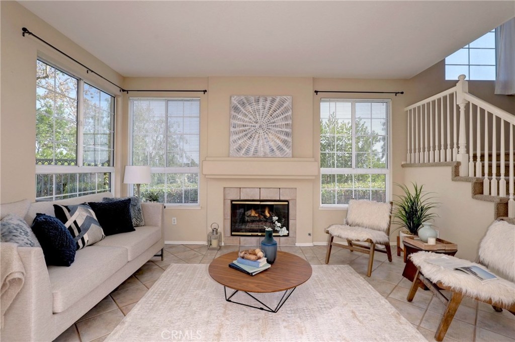 LIGHT, BRIGHT AND AIRY END UNIT WITH SWEEPING SOUTH COUNTY VIEWS IN THE SOUGHT AFTER CALABRIA TRACT. Enter to a welcoming courtyard/patio and inside find a great room space with a large living room, dining room and kitchen all situated together. With large view windows flanking a central fireplace, and another looking out to the entry patio, the living room is bathed in light and is so cheery! Opposite is the dining room and kitchen with a counter peninsula. Featuring an abundance of prep and storage space, recessed lighting and updated stainless appliances, the kitchen, together with the dining room, will be the heart of the home, where everyone will gather. Beyond the kitchen is a spacious laundry room that offers direct access to a one car garage which is large in size. Adjacent to the stairs on the lower level is a guest bath. Upstairs there are two bedrooms and a guest bathroom. The spacious and inviting master suite provides great light from a north facing wall of windows and the en-suite bath features dual vanities and a walk-in closet. The second bedroom is also spacious and light and bright and with the guest bath, completes the upper level. There is plenty of parking for guests AND the entire complex was re-piped with PEX in 2018. Enjoy access to great pool and spa facilities, lush greenbelts and close proximity to shopping, dining, award winning schools and easy commuting options. This end unit view opportunity will not last!