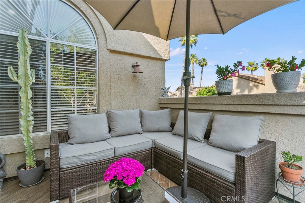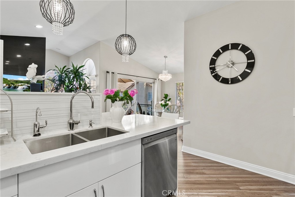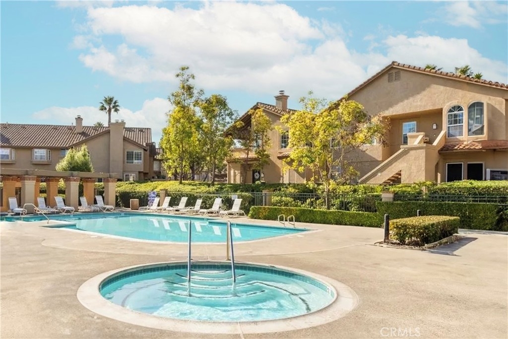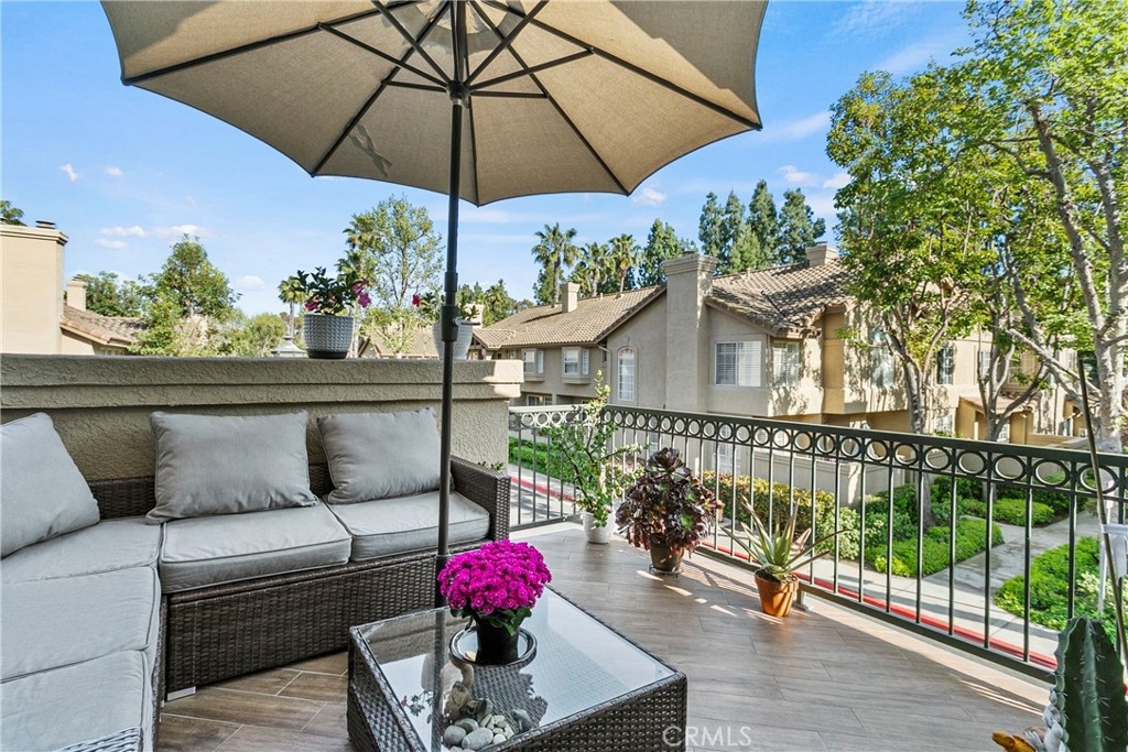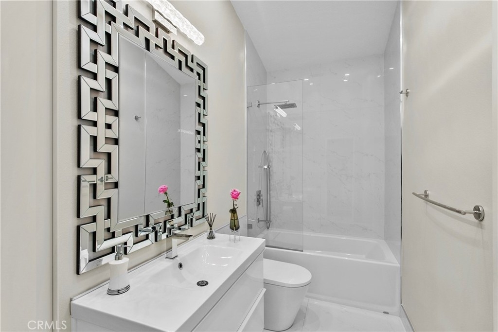 Stunning One of a Kind Townhome in the highly desirable Calabria community of Aliso Viejo! This beautifully remodeled impressive carriage corner unit with no one above or below offers an open concept layout with distinctive elegant accents and designer-inspired finishes. Corner location with large windows gets an abundance of natural sunlight throughout the entire day. Gourmet thoughtfully designed Kitchen boasts luxe quartz counters and island, custom white cabinets with soft closing drawers, recessed lights, newer quality stainless steel appliances, water filtration system. Spacious Living Room features dramatic vaulted ceilings, recessed lights and a stylish modern fireplace. The Dining Room opens to a generous size balcony providing a wonderful outdoor retreat perfect for dining al fresco and entertaining. Just down the hall you have a Bedroom with mirrored closet doors and vaulted ceilings. Full Hallway Bathroom is located across the way with a shower over the new tub. Elegant Primary Suite features high ceilings, walk-in closet with a built-in organizer, luxurious spa-like Bathroom with walk-in shower, lots of cabinet space. Both bathrooms are fully remodeled with tiled porcelain tub/shower walls, high quality faucets and plumbing fixtures, white high gloss custom vanities with plenty of storage space. Other distinctive highlights include designer paint, hardwood flooring throughout, recessed lights, gorgeous light fixtures, high ceilings throughout, central A/C, one-car direct access garage with laundry area and ample storage space. This entire property is in immaculate move-in condition and gives a sense of comfort, style and elegance you will be proud to own. Enjoy a wonderful resort-like Calabria community with a large pool and spa amenities, surrounded by parks and hiking trails. Ideally located only a few minutes down the road to the Aliso Viejo Town Center, this home provides easy access to a variety of amenities, including shops, dining, a movie theater, Costco, and nearby high-ranking schools. Fabulous beaches and luxury resorts are only a short drive away! Convenient access to freeways and toll roads. Truly a rare find! NO MELLO ROOS! Welcome Home!