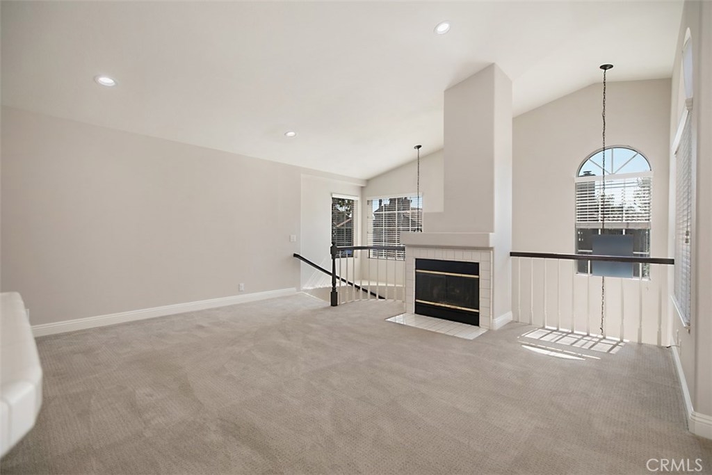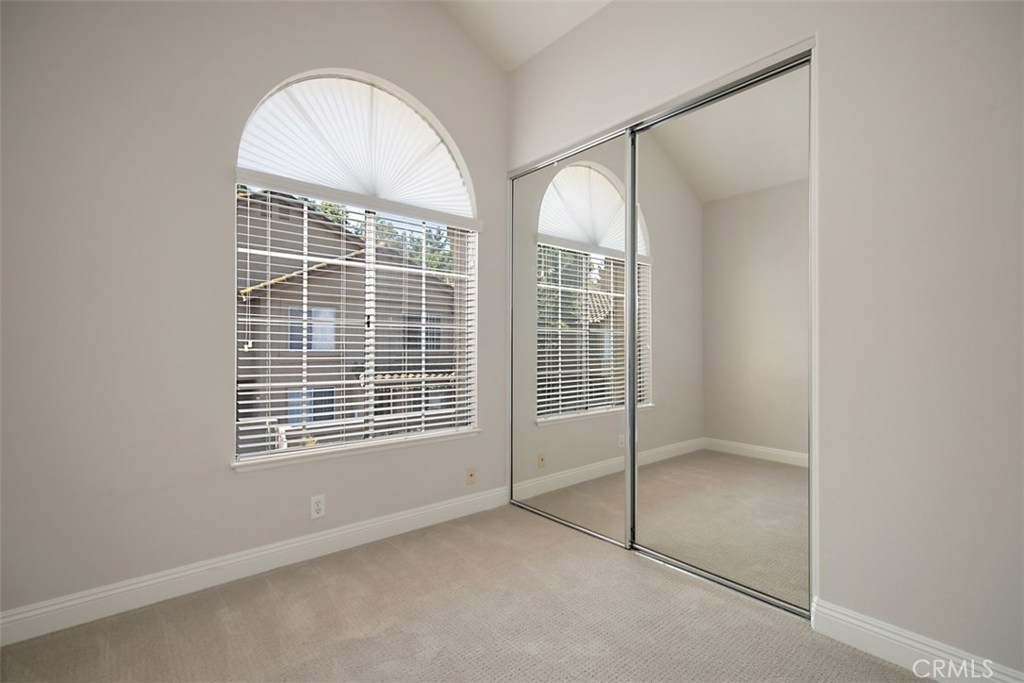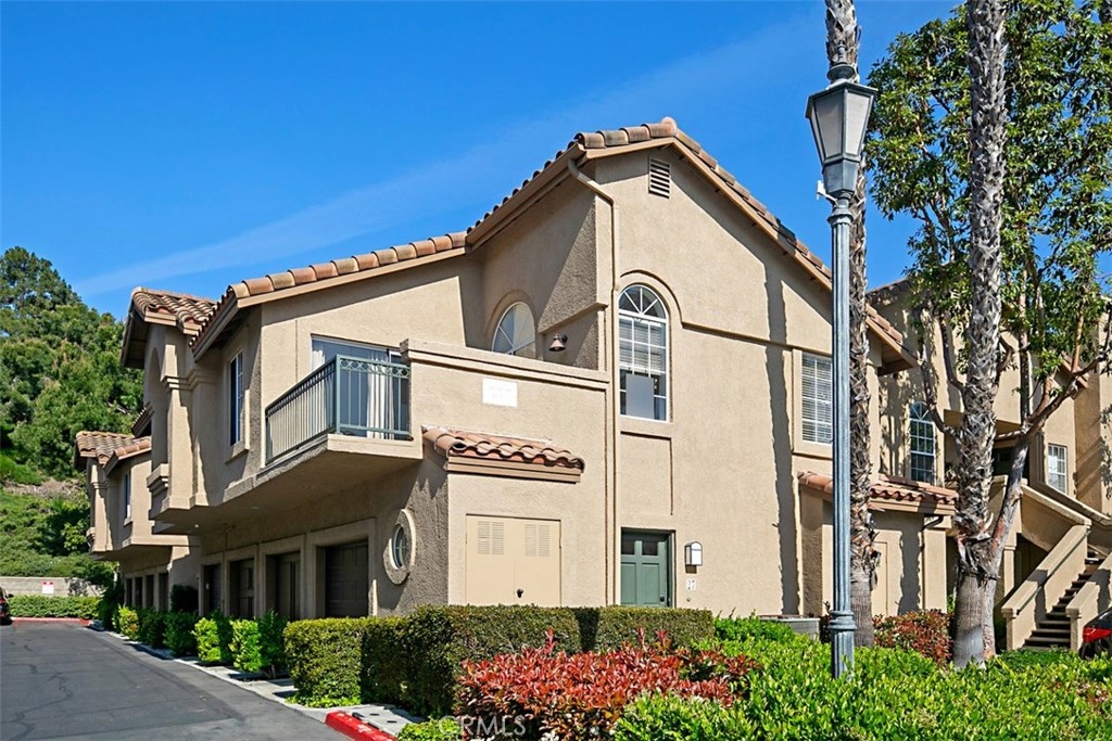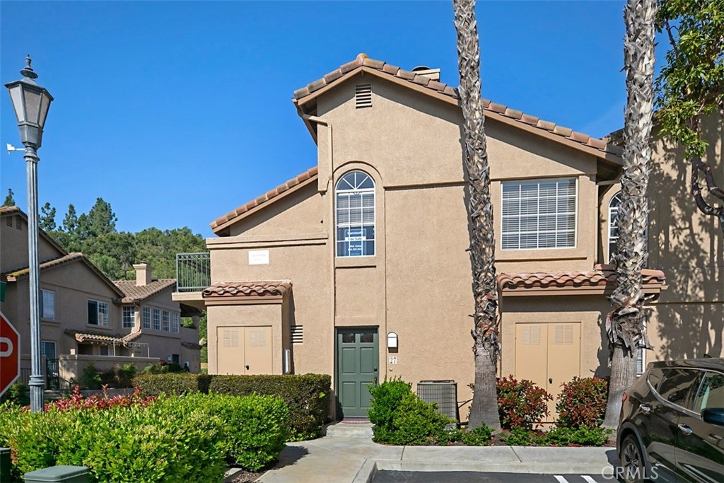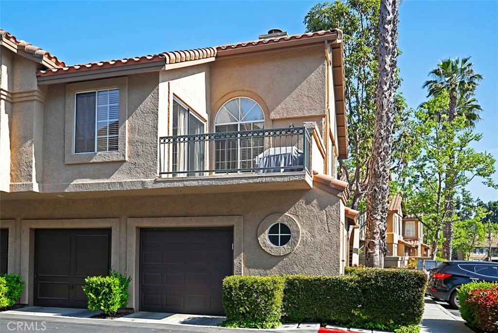 Move-In ready Calabria Carriage Unit in Aliso Viejo is ready for its new owner! Perched on an end interior building this West facing home get LOTS of natural sunlight through out the entire day. The front door entry is located adjacent to guest parking spots w/ a tiled entry and direct access to the attached 1-car garage. The washer & dryer hook-ups are located in the garage, a newer garage motor operates the roll-up door and there's plenty of storage space as well. Neutral Berber carpet adorns the stairs, through-out the upstairs living areas and in both bedrooms. The open & inviting floor plan includes updated LED recessed lighting, designer interior paint, a modern chandelier light fixture, a warm & cozy gas fireplace, a dining area, NEST thermostat controller and easy access to the kitchen. A generous sized balcony off the dining area is available to entertain guests and use for the upcoming Bbq'ing summer days. Just down the hall you have the first bedroom w/ mirrored closet doors, panel door & high ceilings. A full guest bath is located just across the way w/ lots of cabinet space & a shower over tub combo. Next door is the master suite w/ its tall ceilings, walk-in closet, en-suite bathroom w/ dual sinks & tiled shower/tub. The Calabria community is within walking distance to the Aliso Viejo town center, minutes from the 73 toll road and just steps from renowned hiking/biking trails. Don't wait to see this GEM in Aliso Viejo before its too late!