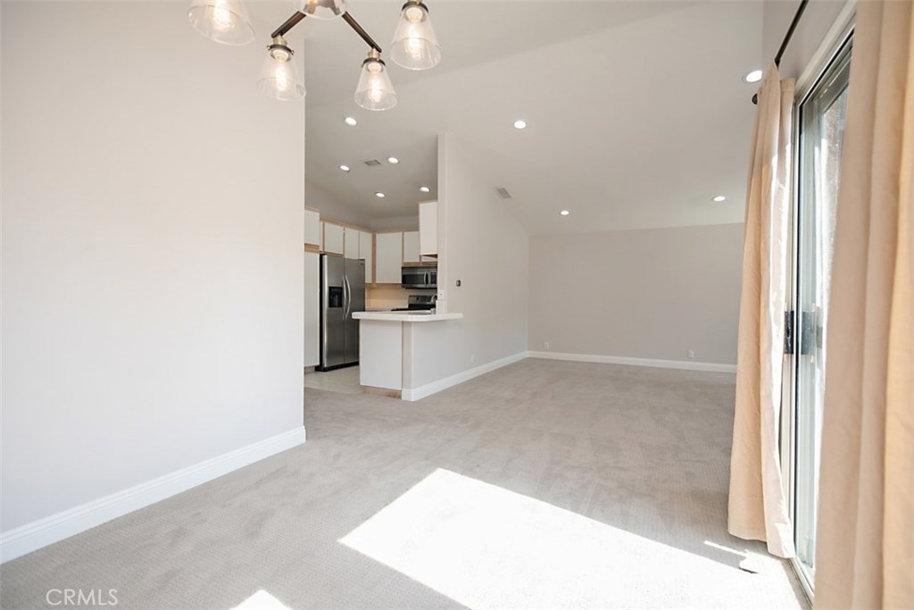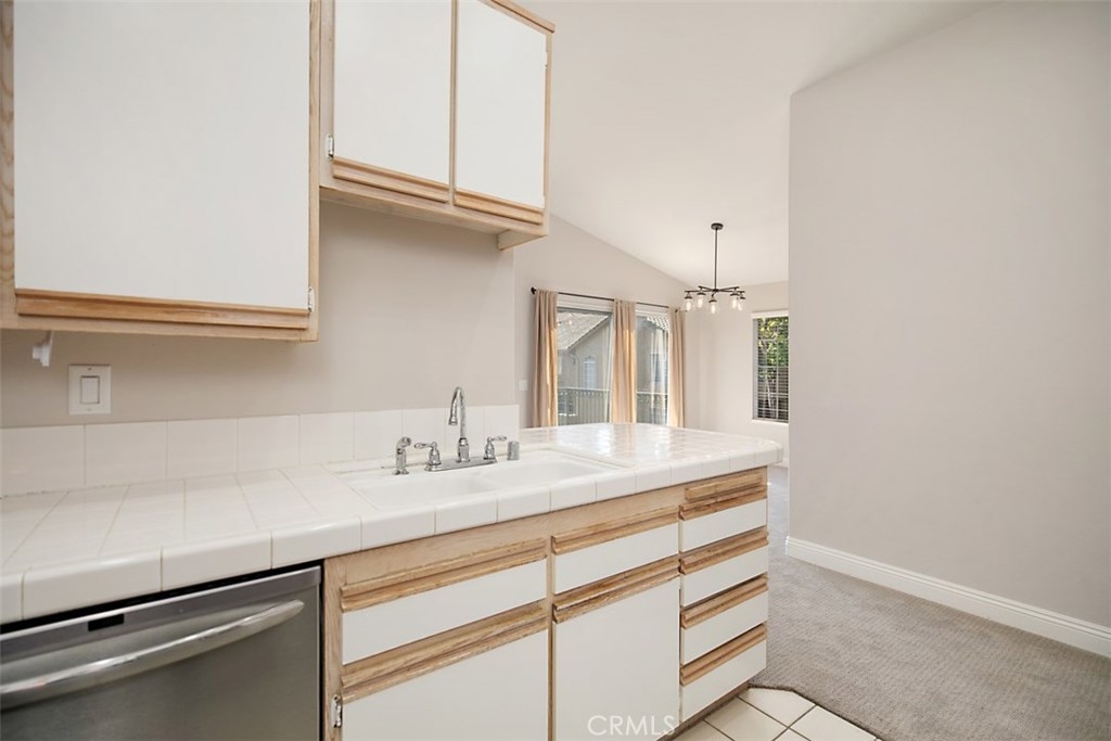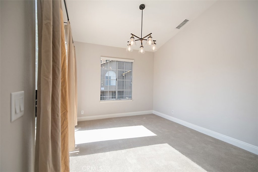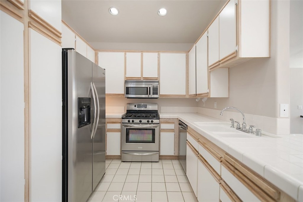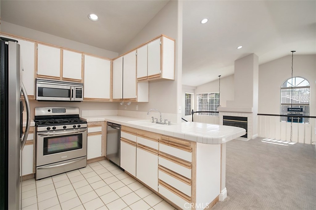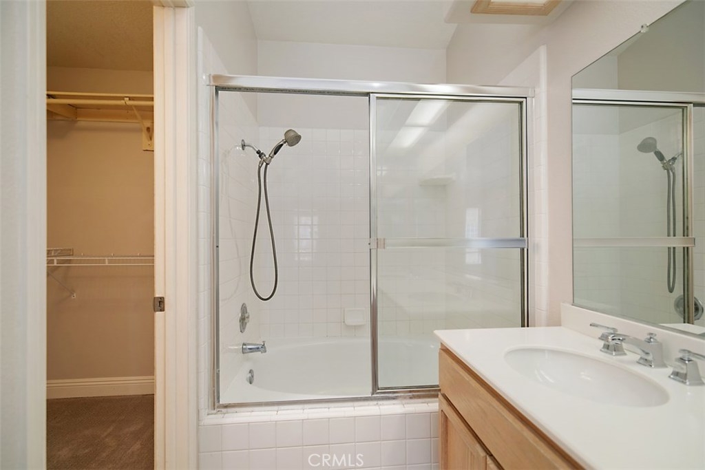 Move-In ready Calabria Carriage Unit in Aliso Viejo is ready for its new owner! Perched on an end interior building this West facing home get LOTS of natural sunlight through out the entire day. The front door entry is located adjacent to guest parking spots w/ a tiled entry and direct access to the attached 1-car garage. The washer & dryer hook-ups are located in the garage, a newer garage motor operates the roll-up door and there's plenty of storage space as well. Neutral Berber carpet adorns the stairs, through-out the upstairs living areas and in both bedrooms. The open & inviting floor plan includes updated LED recessed lighting, designer interior paint, a modern chandelier light fixture, a warm & cozy gas fireplace, a dining area, NEST thermostat controller and easy access to the kitchen. A generous sized balcony off the dining area is available to entertain guests and use for the upcoming Bbq'ing summer days. Just down the hall you have the first bedroom w/ mirrored closet doors, panel door & high ceilings. A full guest bath is located just across the way w/ lots of cabinet space & a shower over tub combo. Next door is the master suite w/ its tall ceilings, walk-in closet, en-suite bathroom w/ dual sinks & tiled shower/tub. The Calabria community is within walking distance to the Aliso Viejo town center, minutes from the 73 toll road and just steps from renowned hiking/biking trails. Don't wait to see this GEM in Aliso Viejo before its too late!
