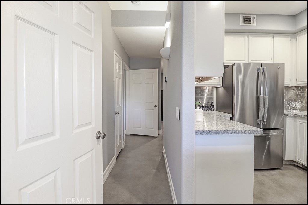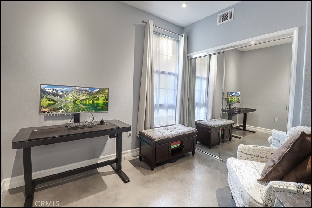 AWESOME END UNIT LOCATION SURROUNDED BY LUSH GREENBELTS, HIGHLY SOUGHT AFTER FLOOR PLAN WITH NO STAIRS AND UPGRADED THROUGHOUT! Spacious floor plan offering a large living and dining room with designer ledger stone accented fireplace and recessed lighting. Spacious kitchen with granite countertops, designer backsplash, stainless steel appliances, transitional style rectangular sink, designer faucet and recessed lighting. Spacious master suite with upgraded bathroom featuring a designer vanity with dual sinks and upgraded fixtures. Second bedroom and second full bathroom also with designer vanity and fixtures. Custom concrete flooring, upgraded lighting fixtures, switches and outlets, repiped with PEX, upgraded AC unit and so much more. Full size inside laundry area and direct access to the attached garage! All this plus the highly sought after Calabria community with resort style pool and spa, plenty of guest parking, excellent proximity to Aliso Viejo Town Center with shops, restaurants and entertainment, easy toll road (73) and beach access (via 133), highly sought after schools and nearby hiking, biking and nature trails!