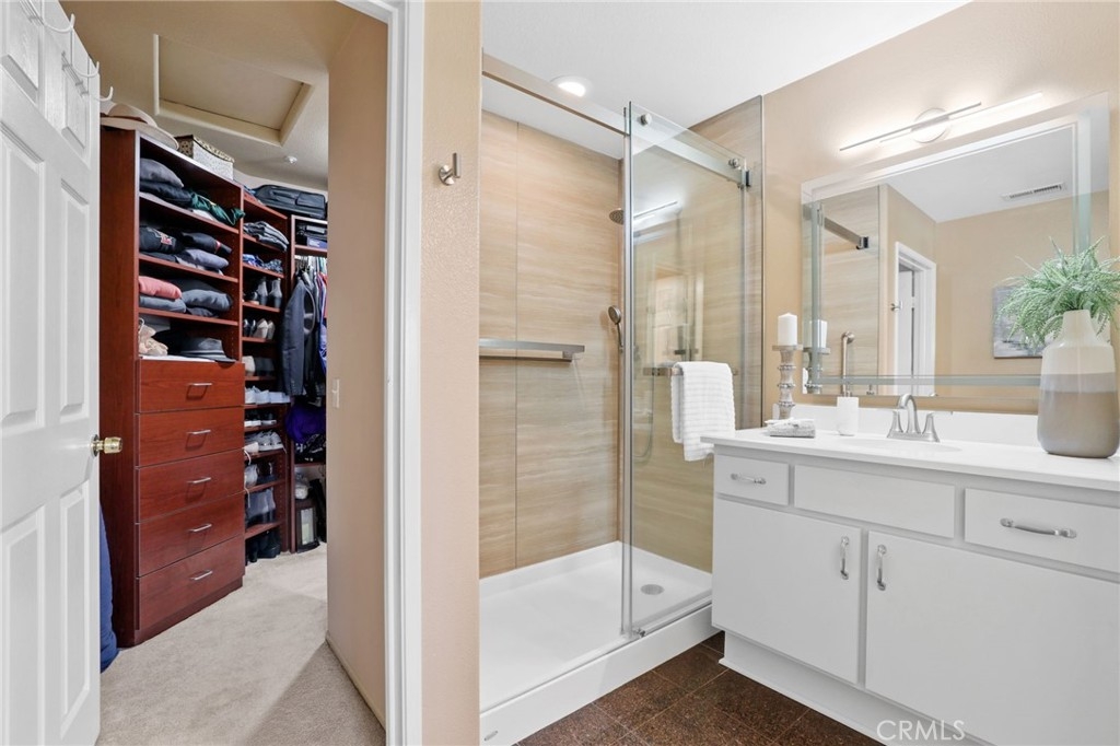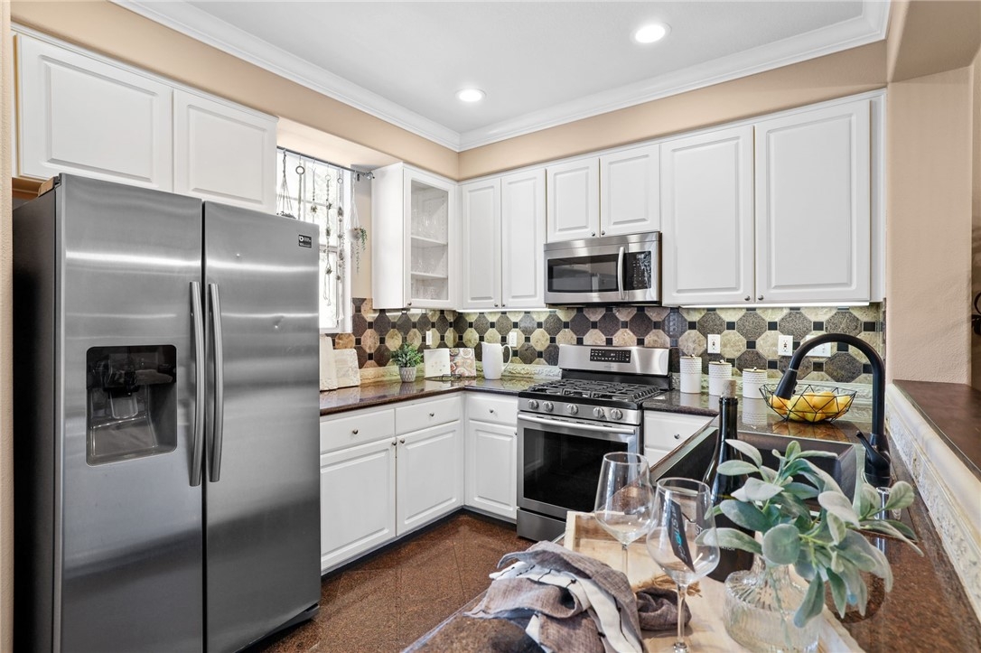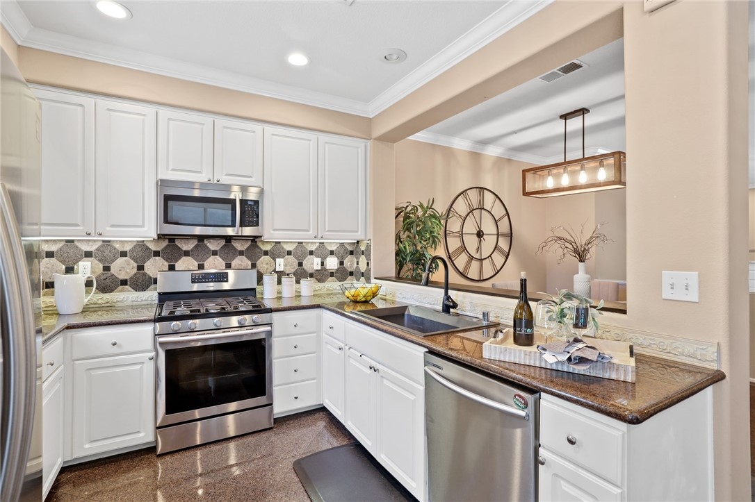 Welcome to 52 Cupertino Circle, a stunning residence situated in the highly coveted Aliso Viejo neighborhood of Camden Park. This home welcomes you with a tree-lined entry adding an air of elegance and sophistication to your daily life. Step inside and be captivated by the impeccable design, adorned with recessed lighting, crown molding, and cathedral ceilings. The front entry living room invites you to cozy up by the fireplace creating a warm and comfortable atmosphere. The gourmet kitchen is a culinary dream, featuring all stainless steel appliances, a 5 burner stove, and an elegant dining area. Start your mornings in the breakfast nook, bathed in natural light, as you savor your morning cup of coffee. Ascend the hardwood stairs and discover a haven of tranquility in the fully remodeled bathrooms, complete with quartz countertops and custom modern tile in the primary bathroom shower. Unwind in the spacious primary bedroom, which boasts a large walk-in closet, offering ample storage for your wardrobe. Indulge in the resort-style community pool, a serene oasis that can be admired from the primary bedroom. Don't miss the opportunity to embrace the epitome of luxury living at 52 Cupertino Circle. Discover the seamless blend of modern design, top-of-the-line amenities, and an exclusive community setting. This home is ready to create unforgettable memories and is one to call home.