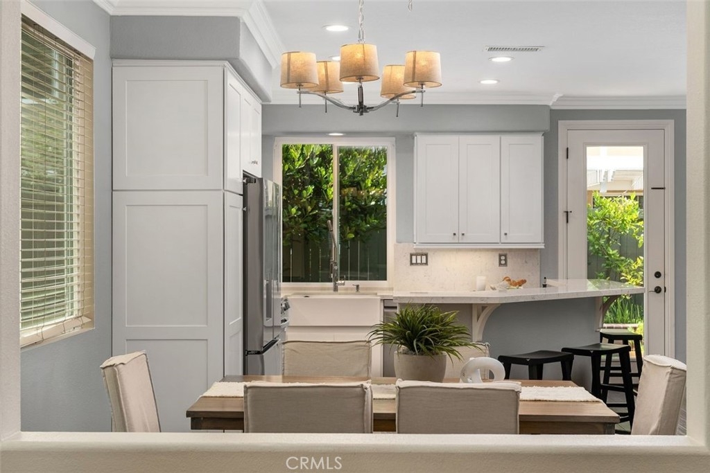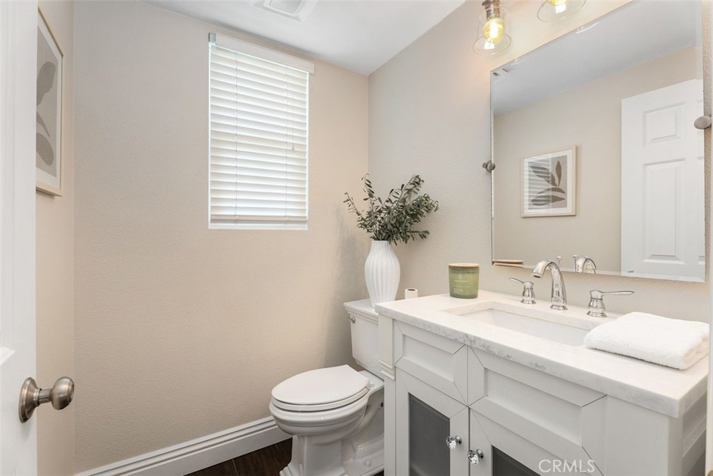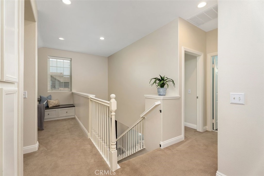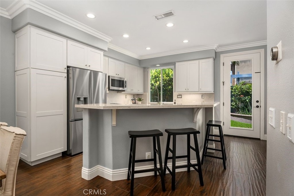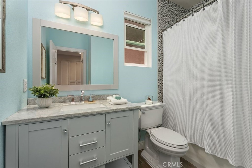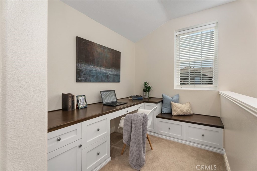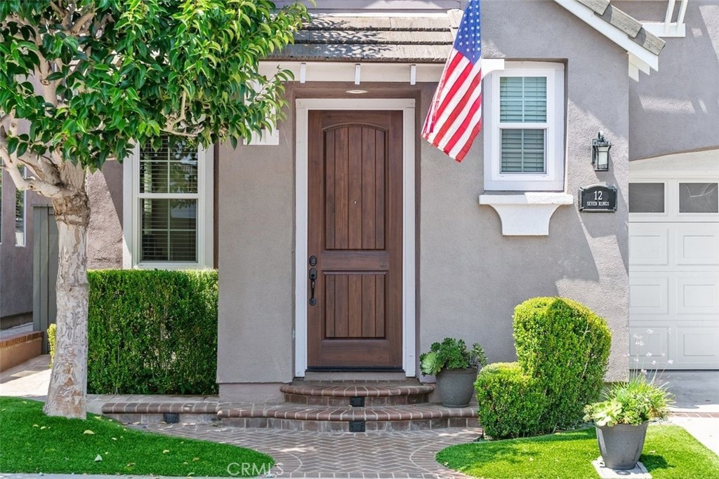 12 Seven Kings is a remodeled 3-bedroom plus office/loft filled with thoughtful touches. The downstairs includes wood-plank tile flooring and recessed lighting throughout uniting the open floor plan. The kitchen stands out with its bright white shaker-style cabinetry, quartz countertops, farm sink, and stainless steel appliances all open to the separate family room and dining room. A cute powder room with stylish vanity finishes off the first level. Upstairs, the primary bedroom with a double-door entry is en-suite to a primary bathroom with marble flooring, refinished cabinets, and extra-large walk-in closet with a locking jewelry drawer. The secondary bedrooms, which both have closet built-ins and ceiling fans, share a completely updated second bath including wood-plank tile flooring, Carrera marble countertops, and an intricate mosaic tile walled shower. If you're more into function over form, don't fret, upstairs the home also has a loft with office built-ins, an extra-large upstairs laundry room with cabinets and a sink, and loads of cabinet storage in the hallway. The home also has all newer dual-paned windows, PEX repiping, extensive built-ins in the garage, and a sizable, low-maintenance yard with synthetic grass and multiple gas lines. 12 Seven Kings is conveniently located a short walk to the community pool, and just outside the Village Cottages gates is Oak Park. The home is zoned for award-winning schools, including Canyon Vistas Elementary which is within walking distance. It is also a quick drive to the many shops and restaurants in the Aliso Viejo Town Center.