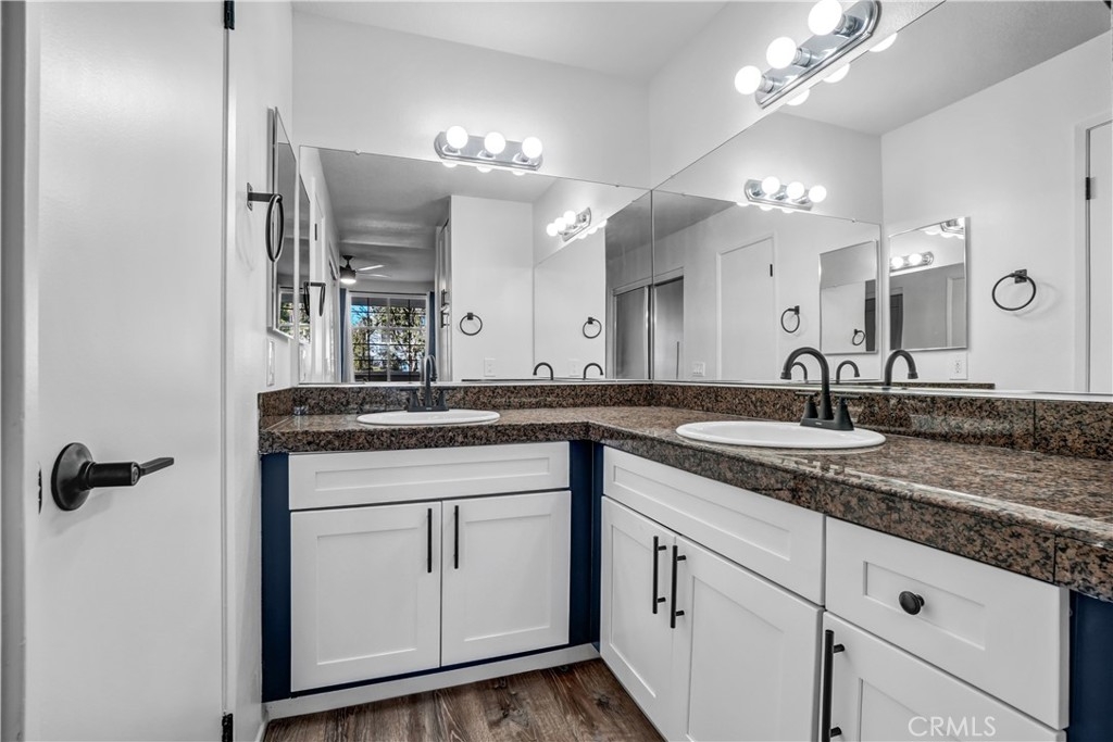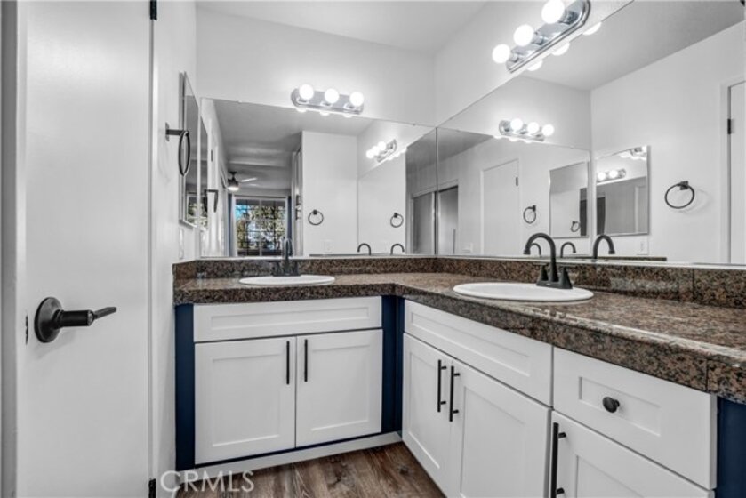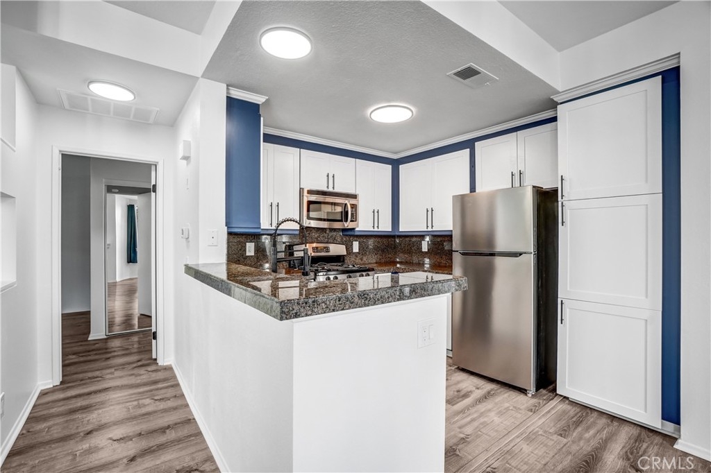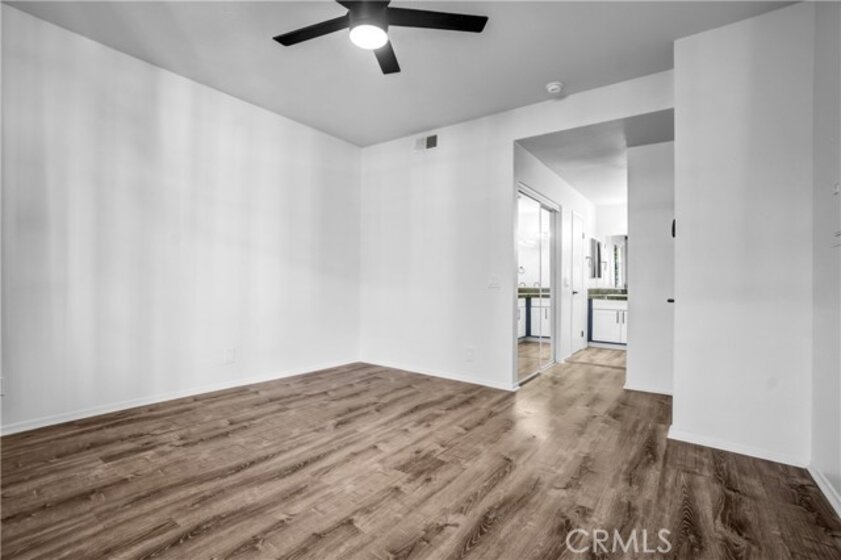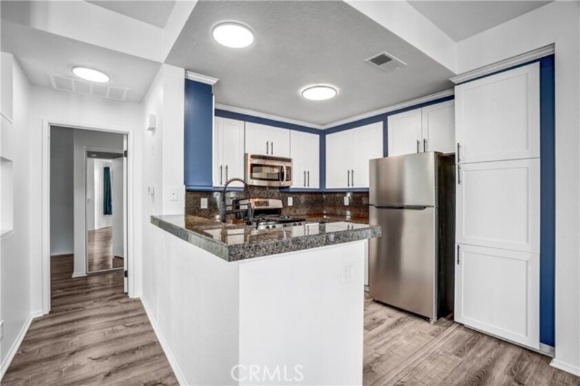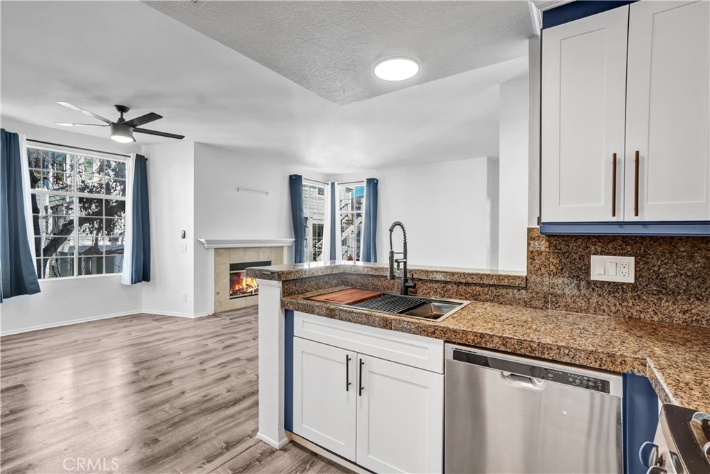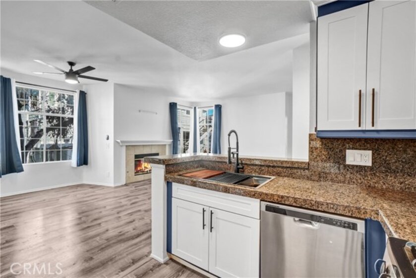 Welcome to Canyon Villas! This light-filled, 1-bedroom, 1-bathroom end-unit offers an elevated living experience. Featuring dramatic vaulted ceilings and an open-concept floor plan, the home feels incredibly spacious and airy. The inviting living room, centered around a cozy fireplace, flows seamlessly into a dining area and a modern kitchen complete with granite countertops, stainless steel appliances, a newly installed farmhouse sink with cutting board, black faucet, and adjustable LED kitchen lights, and shaker style white cabinets. The bathroom has been renovated with brand new shaker-style cabinets, new large-sized soak-style bathtub with tile enclosure, black shower head and faucets, and new light fixtures. The unit has been repainted throughout. New shaker-style doors have been installed in the bedroom and bathroom. Brand new ceiling fans have been installed in the living room and bedroom. Retreat to the oversized primary suite, which boasts a large walk-in closet and a bathroom featuring dual sinks and a soaking tub. With a detached garage and world-class community amenities just steps away, this turnkey condo is the perfect place to call home.