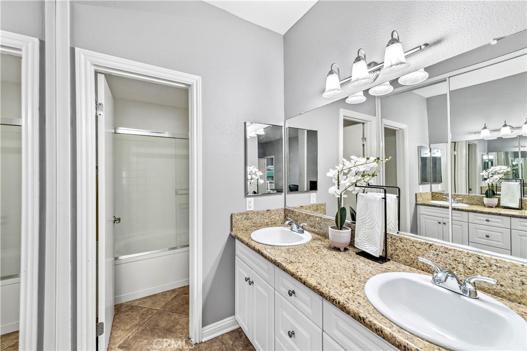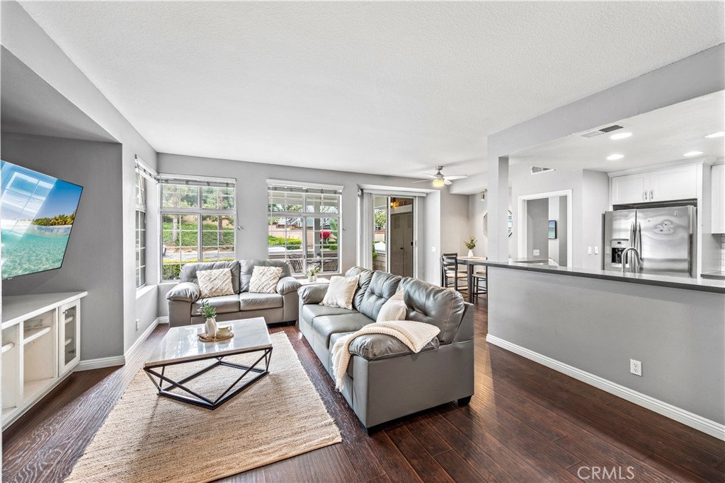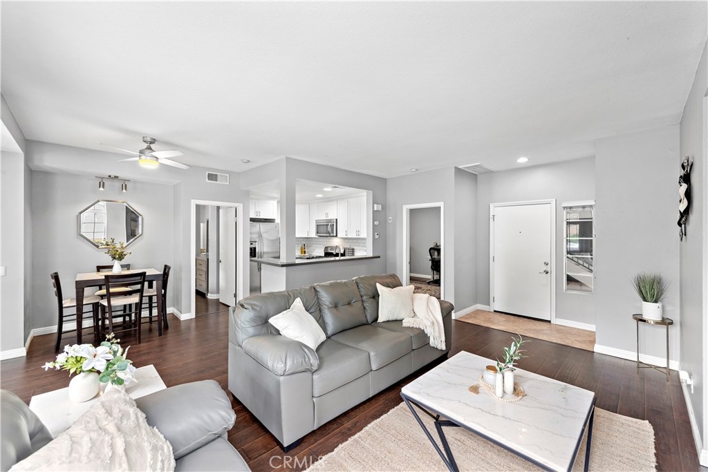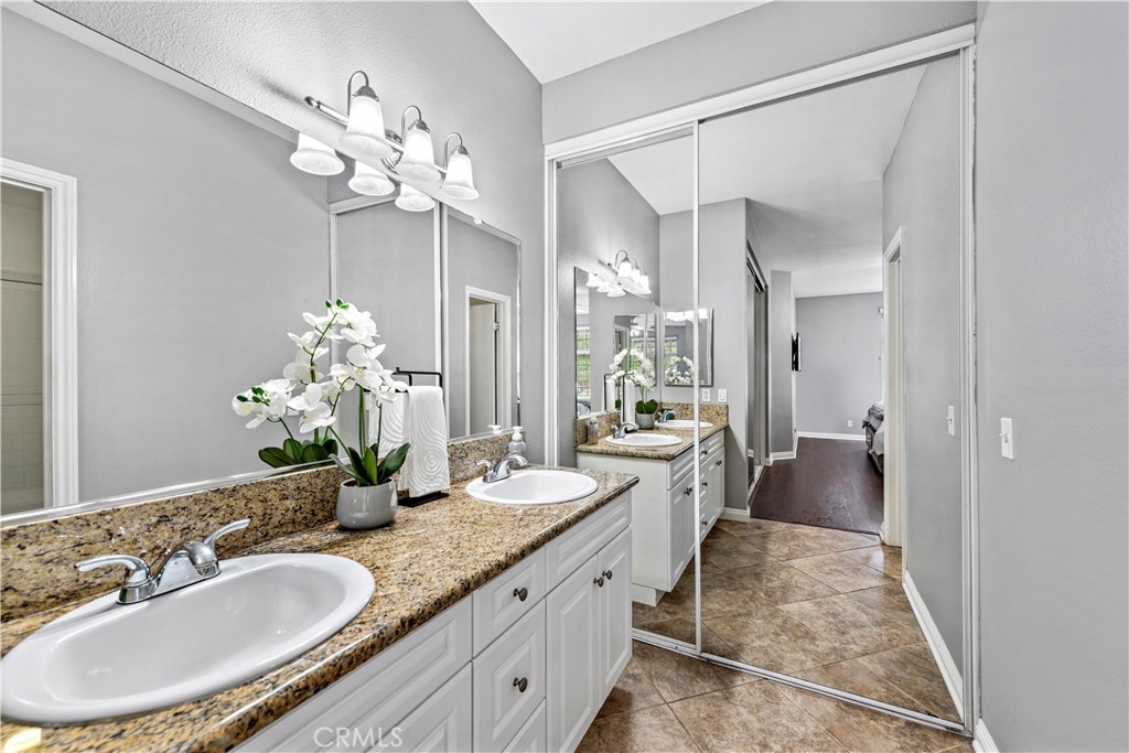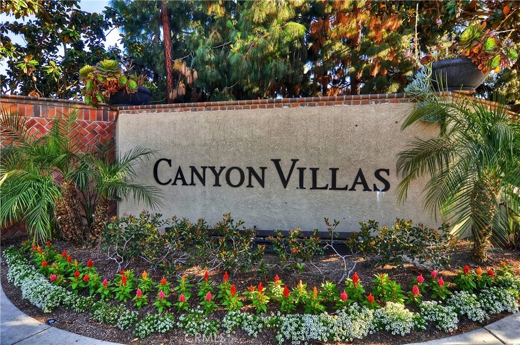 DREAM HOME, MOVE IN READY, CORNER UNIT, DUAL PRIMARY BEDROOMS, UPGRADED KITCHEN AND BATHS, IMMACULATE INTERIOR WITH AN OPEN FLOOR PLAN, LOCATED IN THE PRESTIGIOUS CANYON VILLAS GATED COMMUNITY WITH POOL, SPA AND GYM… THIS HOME HAS IT ALL! Enter to single level living with no interior steps, large great room, lots of natural light, wide planked laminate flooring and raised baseboards throughout. Model perfect kitchen with quartz countertops, subway tile backsplash, white shaker soft close cabinets, farmhouse sink, stainless steel appliances and barstool seating. Relax on your large private patio accessible from living room with plenty of space to grill and entertain. Each bedroom has its own double sink bathroom and walk in closet. Upgraded bathrooms with granite countertops and tile floors. One car garage, and assigned space close to the unit. Located in a gated community with resort style amenities including two swimming pools and spas, BBQ areas, fitness center, and private clubhouse. Centrally located, close to shopping centers,Toll 73, many restaurants and AV Town Center.