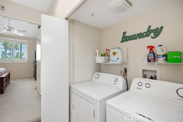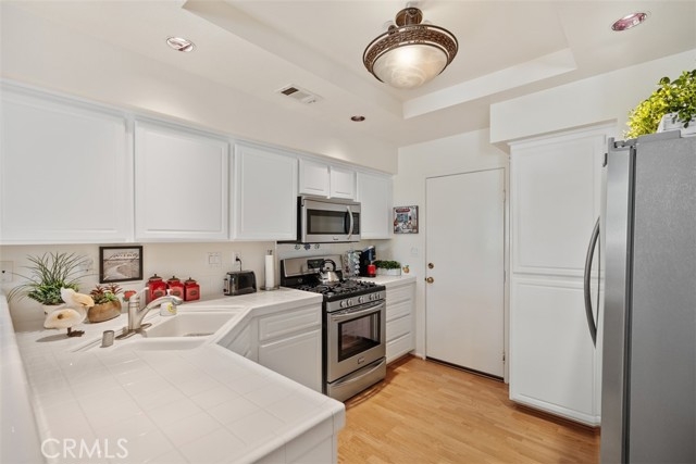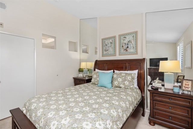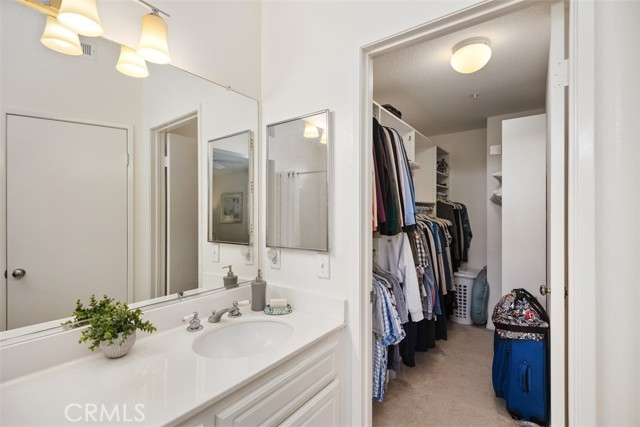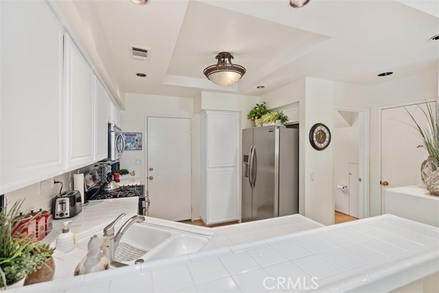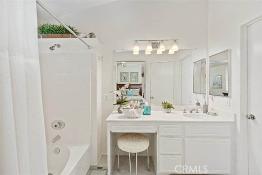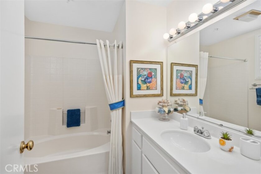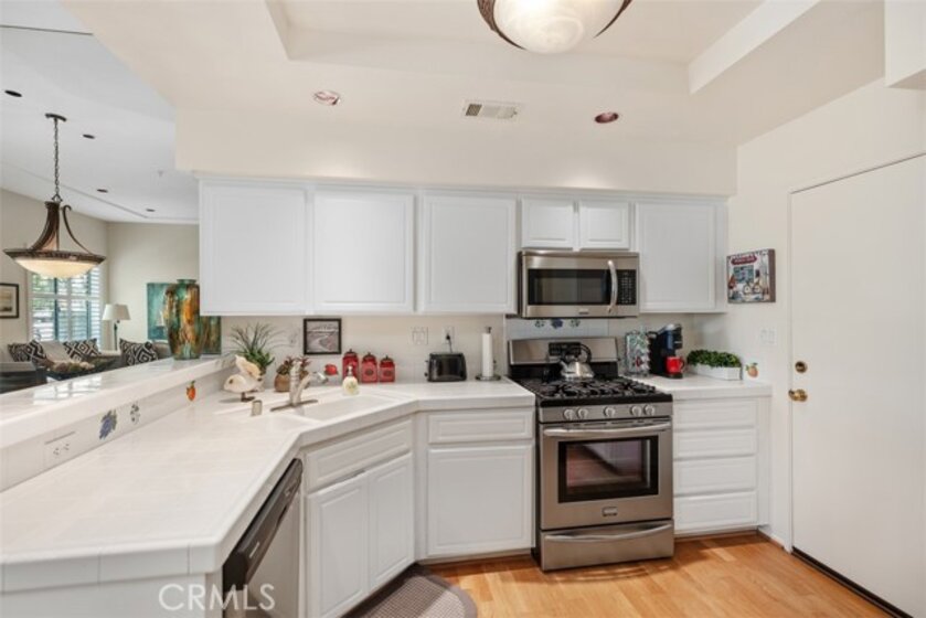 Charming, beautiful and move in ready 2-bedroom townhome with dual masters, each with an attached full bathroom and walk in closet. This was a former builder model unit with added extras like dimmers on all light switches, a mirrored wall in the dining room, recessed lighting, plantation shutters throughout and stainless steel appliances. There is an attached direct access 2 car garage, an upstairs laundry area, and a private patio with views of the majestic Saddleback Mountain, Whether you're enjoying a morning coffee or unwinding after a long day, this outdoor oasis offers a tranquil retreat. Convenience meets excellence with this property's walking distance proximity to the award-winning Don Juan Avila Elementary and Middle School. It is conveniently located close to great shopping, movies theaters, entertainment and restaurants in the Aliso Viejo Town Center. Hiking trails and bike paths are close and you are just minutes to Laguna Beach. There is a low tax rate, no Mello Roos and the unit has been repiped.