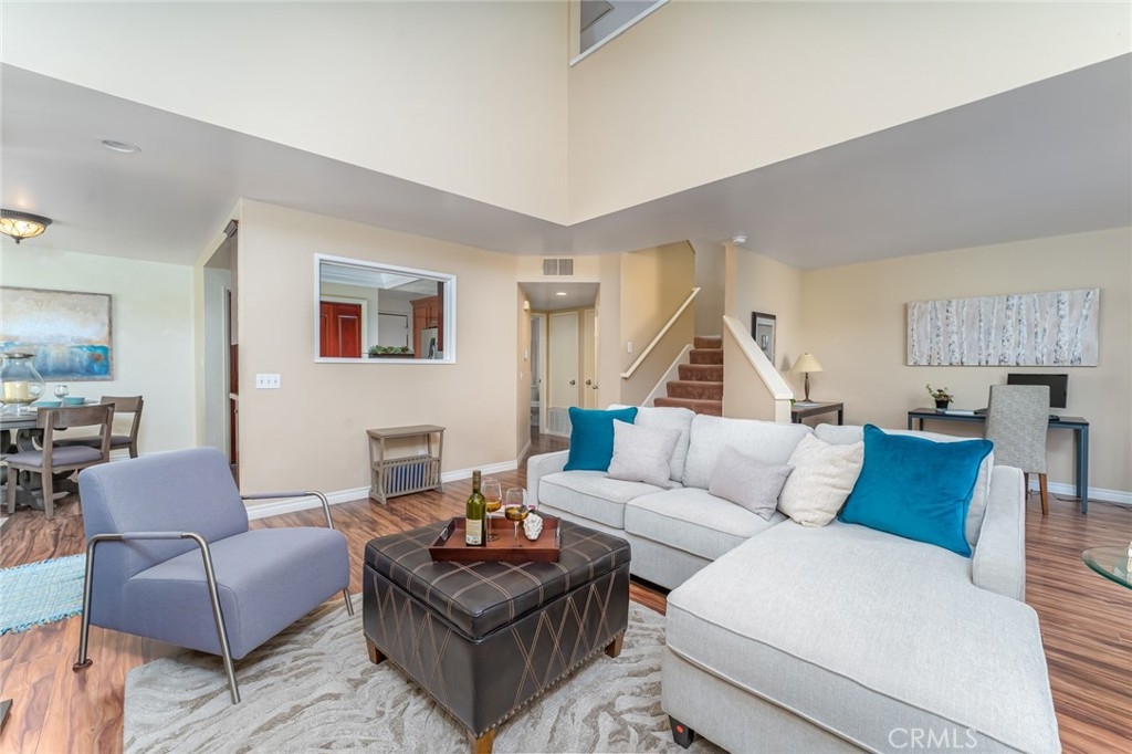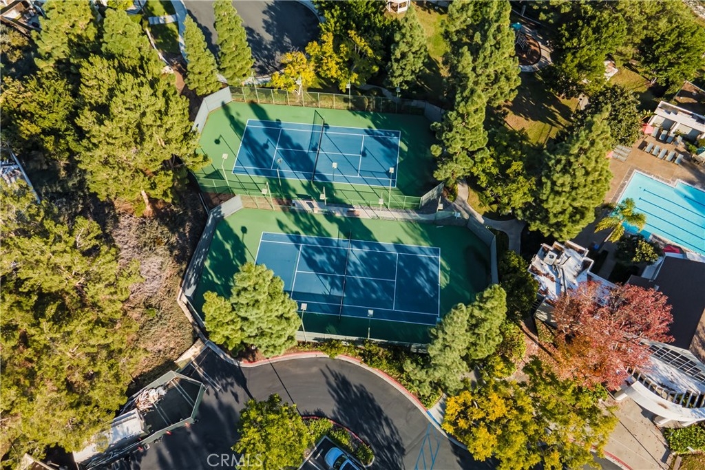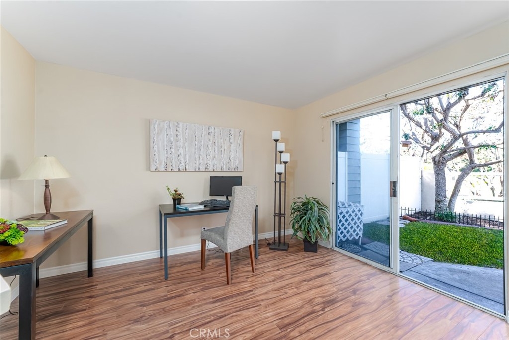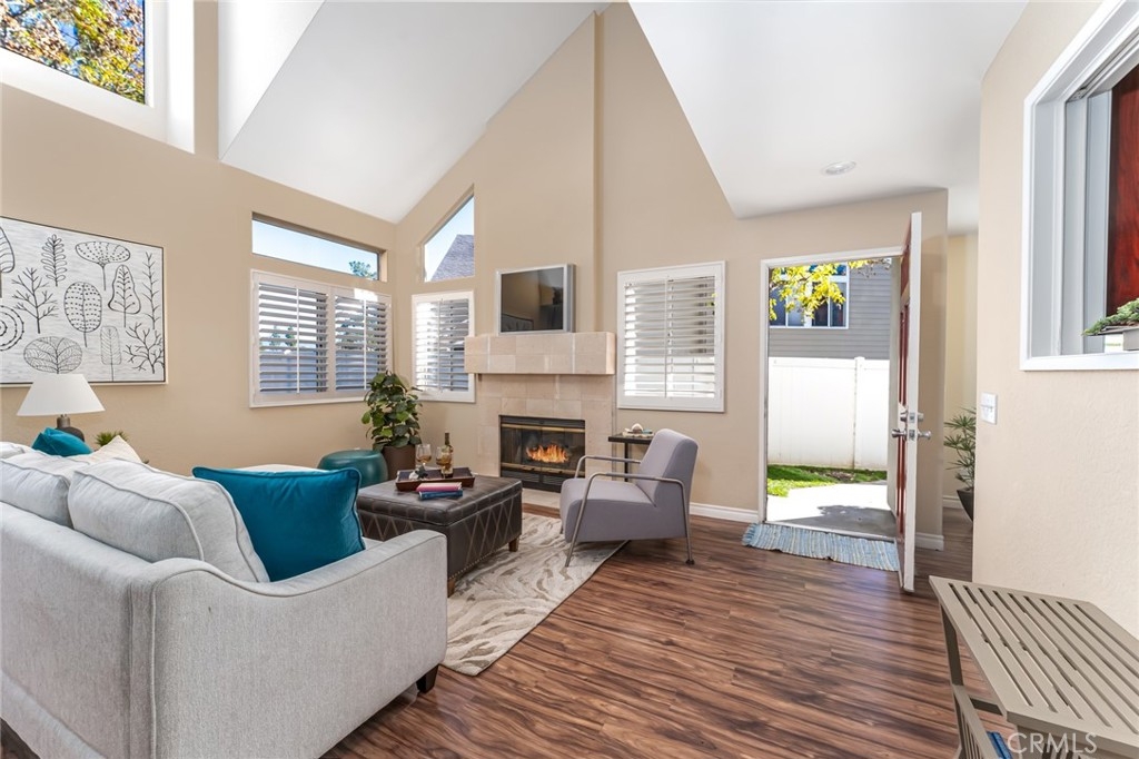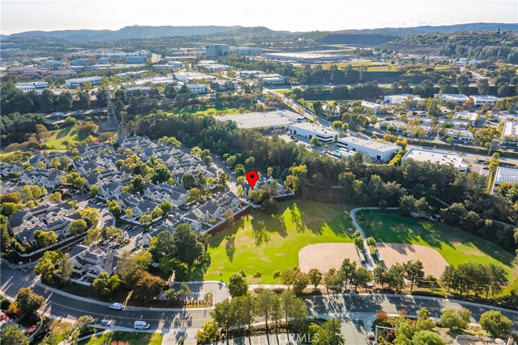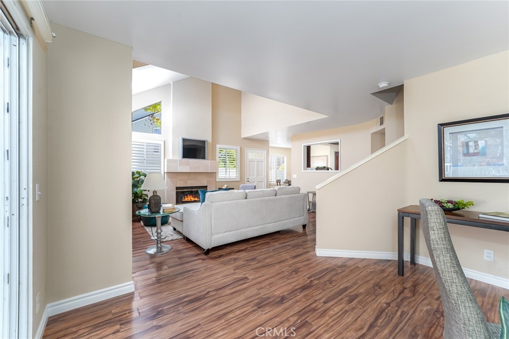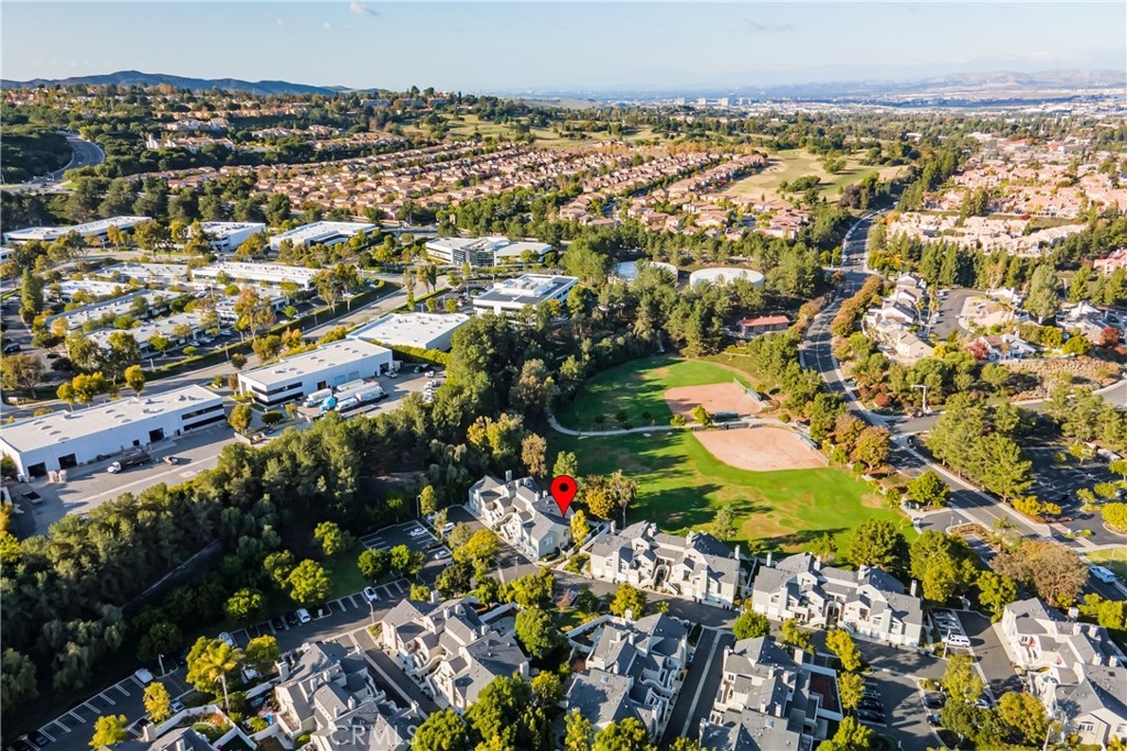 Incomparable wrap around yard with elevated view of Pinewood Park. Gated courtyard entry to this end unit two level townhouse with nobody above or below. Direct access garage plus plentiful additional parking. Living room features vaulted ceiling and a fireplace. Warm and light dining room opens to the upgraded kitchen with granite counters, stainless steel appliances including refrigerator, recessed lighting and pantry adjacent to the door to the garage for convenience. Additionally, there is a den/office/play area adjacent to the living room, a powder room and laundry on the main level including washer and dryer. Upstairs you have two well separated bedrooms and two remodeled bathrooms as well as linen storage. The primary bedroom has a long wall closet, vaulted ceiling, dual sinks and walk-in shower. The hall bath has a tub/shower. The lower level has wood look floors throughout, the entire home has smooth ceilings, central air conditioning, neutral paint and plumbing supply lines have been epoxy lined throughout the entire community. Glenwood Village has a resort style clubhouse with fitness center, pool, spa, tennis, sports courts and here are two parks flanking each side of the community. Close proximity to Aliso Viejo Town Center, hiking & mountain biking and walking paths. Zoned for highly desired schools and there is NO Mello Roos tax, low property tax rate of only 1.0035%* (verify with County Assessor) and reasonable association fees. A very unique, rare location and floorplan offering privacy, yard and views. VA Loan Approved Community.