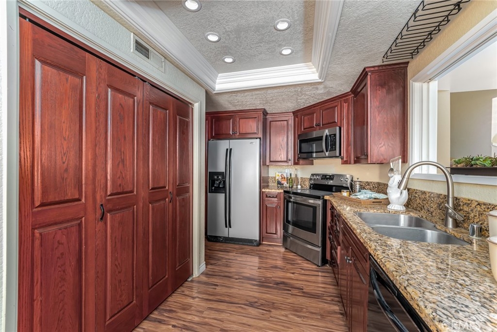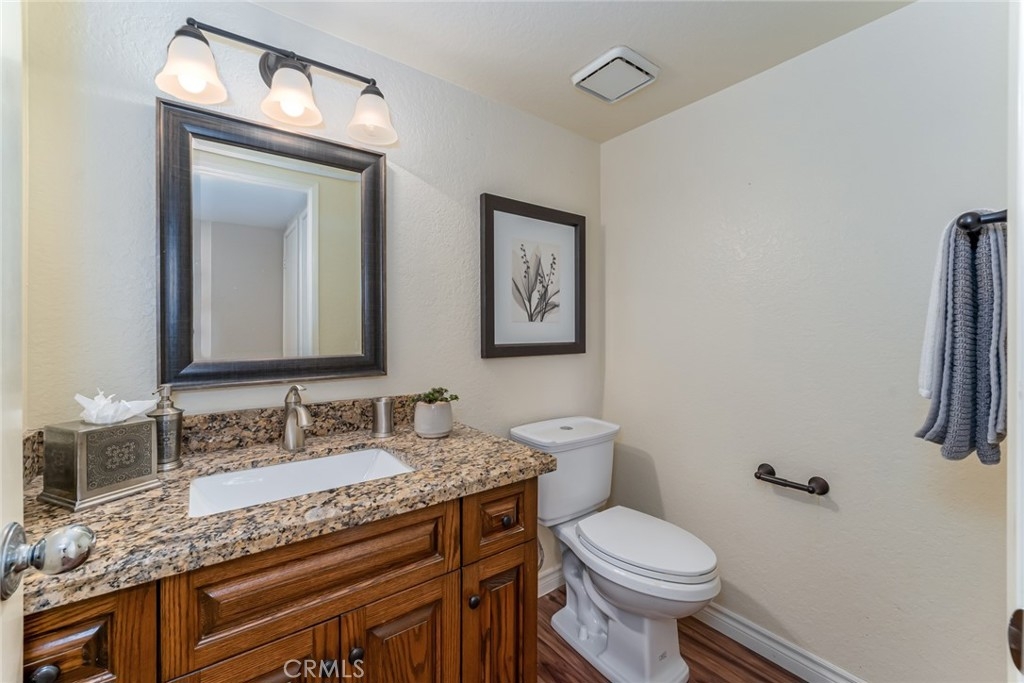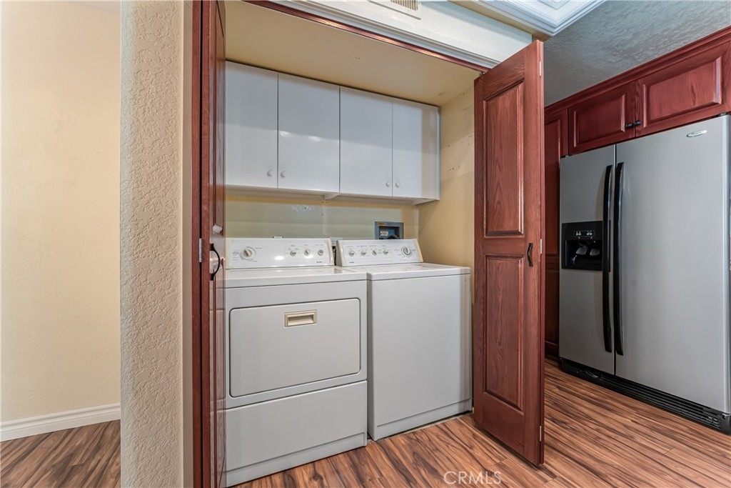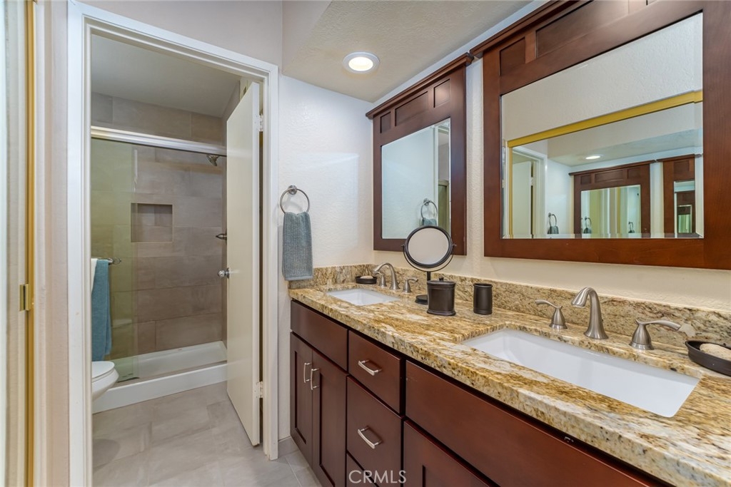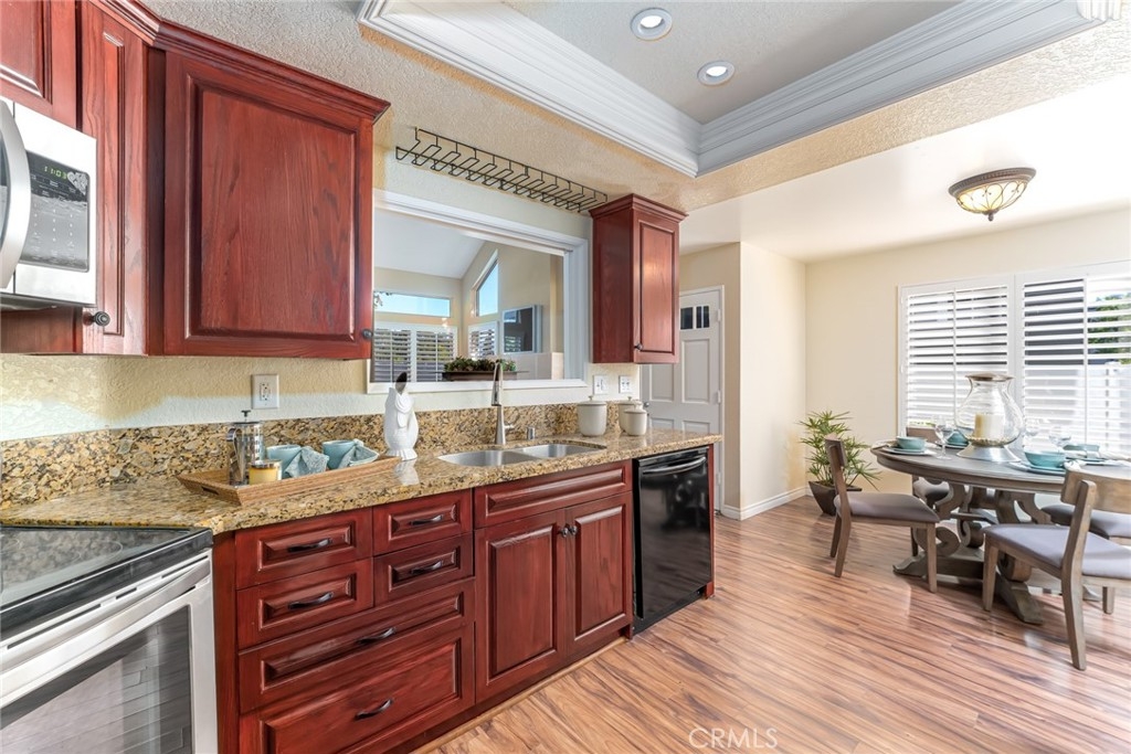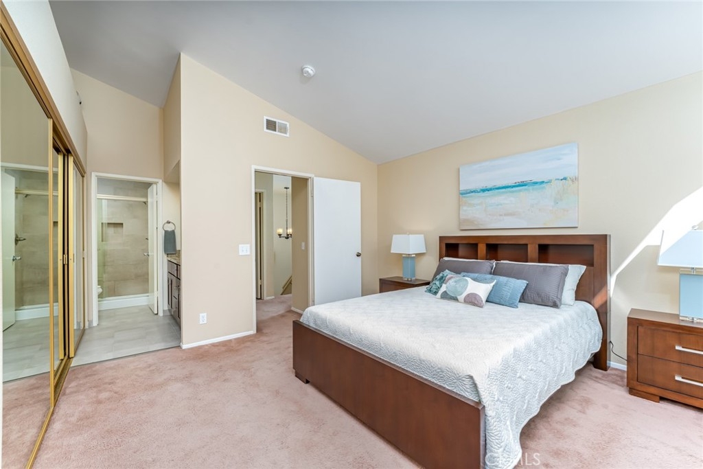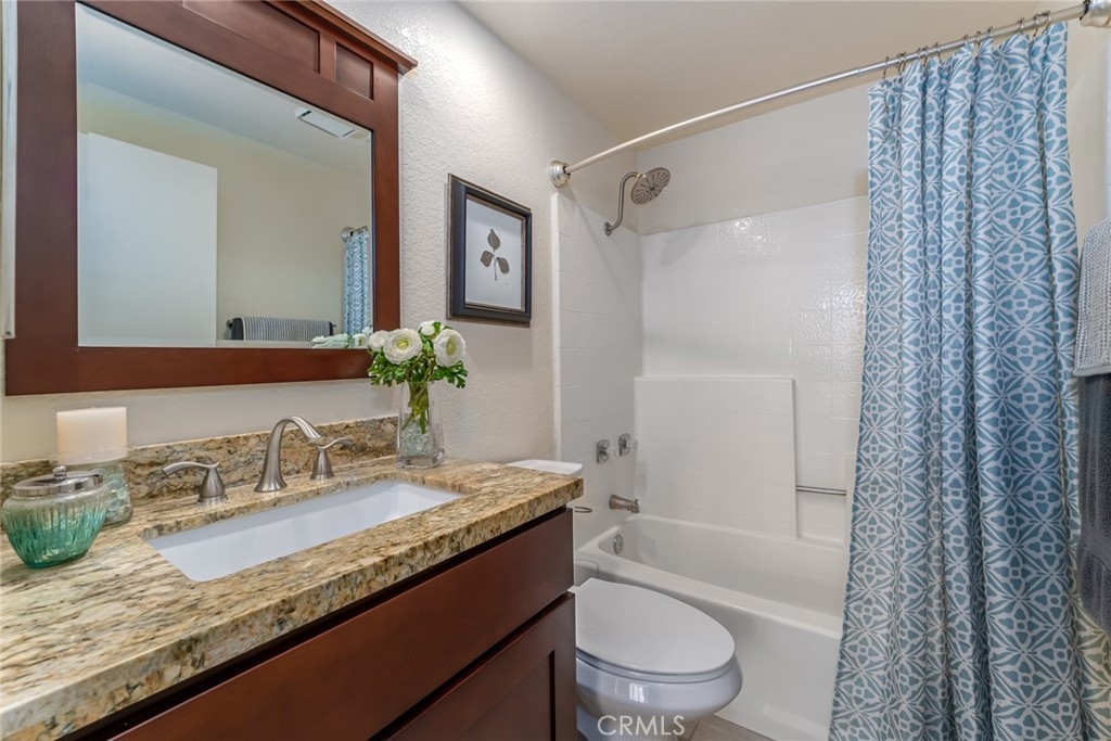 Incomparable wrap around yard with elevated view of Pinewood Park. Gated courtyard entry to this end unit two level townhouse with nobody above or below. Direct access garage plus plentiful additional parking. Living room features vaulted ceiling and a fireplace. Warm and light dining room opens to the upgraded kitchen with granite counters, stainless steel appliances including refrigerator, recessed lighting and pantry adjacent to the door to the garage for convenience. Additionally, there is a den/office/play area adjacent to the living room, a powder room and laundry on the main level including washer and dryer. Upstairs you have two well separated bedrooms and two remodeled bathrooms as well as linen storage. The primary bedroom has a long wall closet, vaulted ceiling, dual sinks and walk-in shower. The hall bath has a tub/shower. The lower level has wood look floors throughout, the entire home has smooth ceilings, central air conditioning, neutral paint and plumbing supply lines have been epoxy lined throughout the entire community. Glenwood Village has a resort style clubhouse with fitness center, pool, spa, tennis, sports courts and here are two parks flanking each side of the community. Close proximity to Aliso Viejo Town Center, hiking & mountain biking and walking paths. Zoned for highly desired schools and there is NO Mello Roos tax, low property tax rate of only 1.0035%* (verify with County Assessor) and reasonable association fees. A very unique, rare location and floorplan offering privacy, yard and views. VA Loan Approved Community.