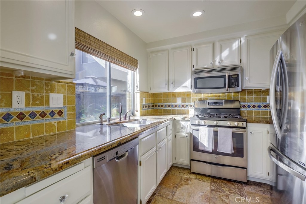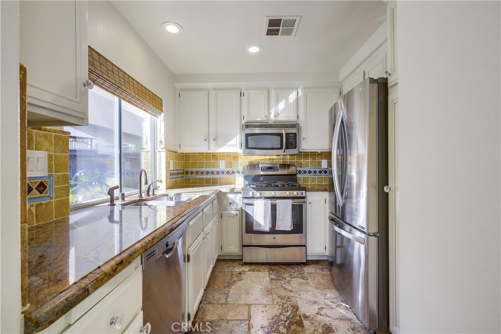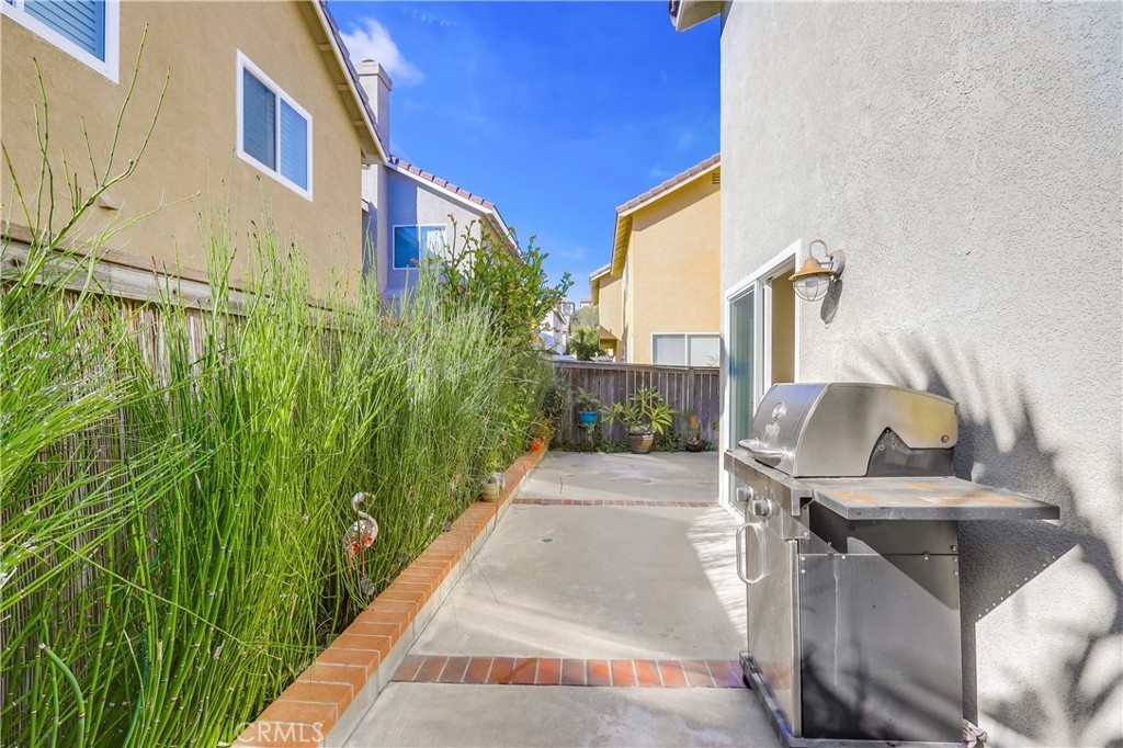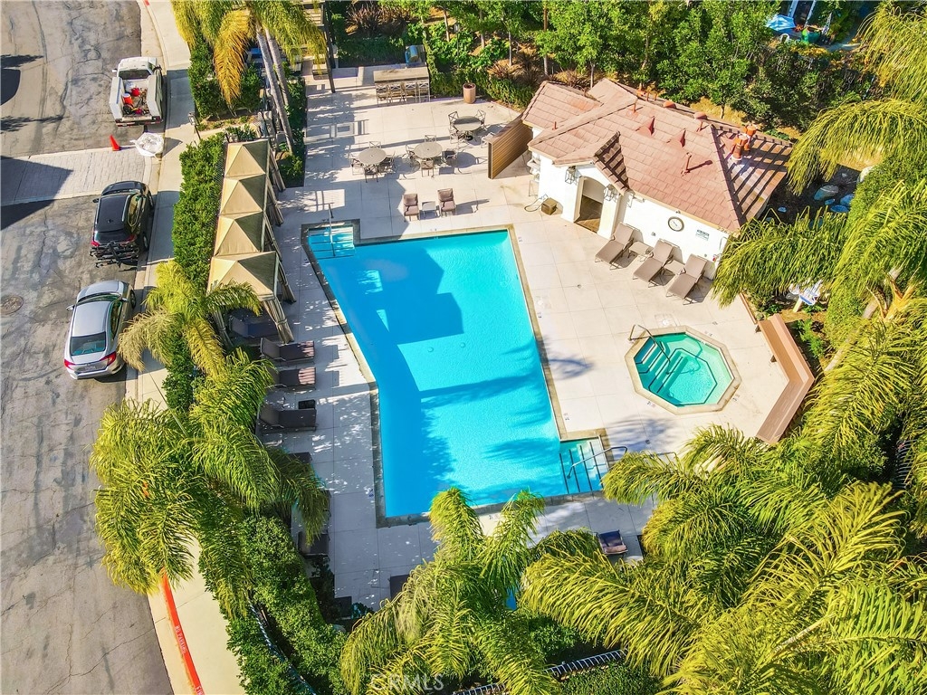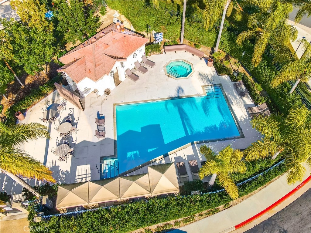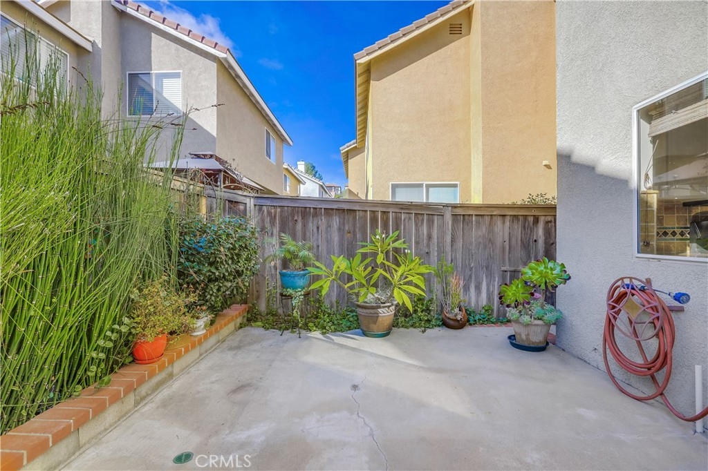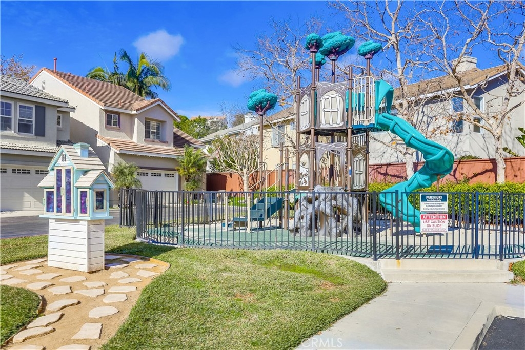Sparkling gem with a prime corner lot location and recent improvements ideally located in the desirable Hamptons community within walking distance of local schools, parks, the Aliso Viejo Town Center. Step inside and soak in the soaring 2 story ceilings and the light filled interior spaces. Gorgeous stone tile floors, a freshly painted neutral interior, and an abundance of natural light set the stage for an ideal living environment. The well-designed open floor plan includes a spacious living area with a tile surround fireplace, built in shelving and a media nook, and is open to the dining area with direct access to the outdoor patio creating an ideal indoor-outdoor living space. The sunny kitchen boasts gorgeous granite countertops, a custom tile backsplash, and stainless-steel appliances. The convenient main level powder room has been beautifully upgraded with a custom granite topped vanity and custom lighting. The upstairs primary bedroom suite is a private retreat with custom ceiling fan, a large walk-in closet, and a beautiful primary bath with granite countertop, custom tile floor and backsplash, dual vanities, and a gorgeous tub/shower with a fully tiled surround and custom tile details. The guest bedroom is blessed with new carpet, new mirrored closet doors, and a full private bath with elegant custom tile features, a granite topped vanity with upgraded fixtures and hardware, and a framed vanity mirror. Additional fine features and improvements include upgraded baseboards and door casings throughout, updated tubs and toilets, upgraded wood flooring on stairs and loft area, new switches and plugs throughout, new recessed can lighting, new ceiling fans, new patio sliding door, new bedroom doors, new screens, upgraded water heater, new epoxy garage floors, upgraded garage door and opener, and garage ceiling storage racks. The outdoor patio is a peaceful oasis with easy care hardscape, brick planters, and colorful landscaping creating a wonderful space for relaxing, BBQing, and entertaining friends and family. The well-maintained community amenities include a tot lot playground, Free Little Library, and a sparkling community pool and spa, with picnic areas, covered cabanas, an outdoor cooking area, and seasonal community events. Just a short stroll to Oak Park, Canyon Vista Elementary, Soka University, Ice Palace, Library, Aliso Viejo Town Center, Theater, dining, shopping, and an abundance of hiking and biking in the hills and canyons close by.