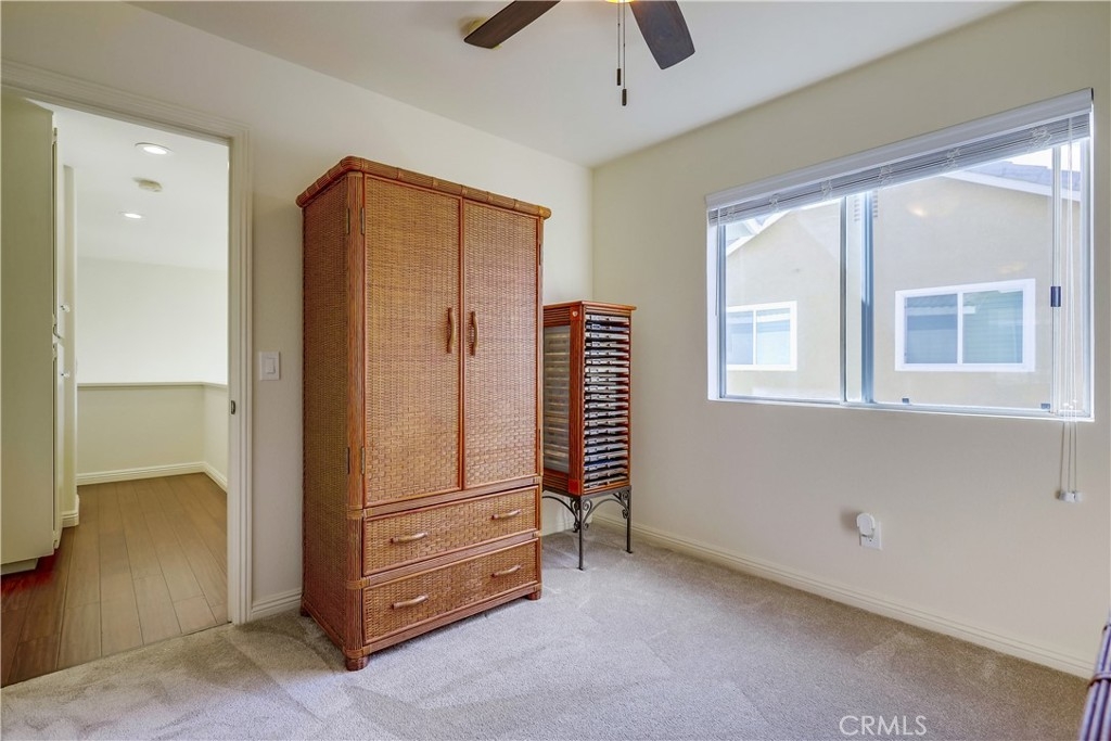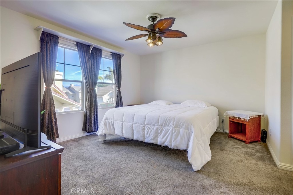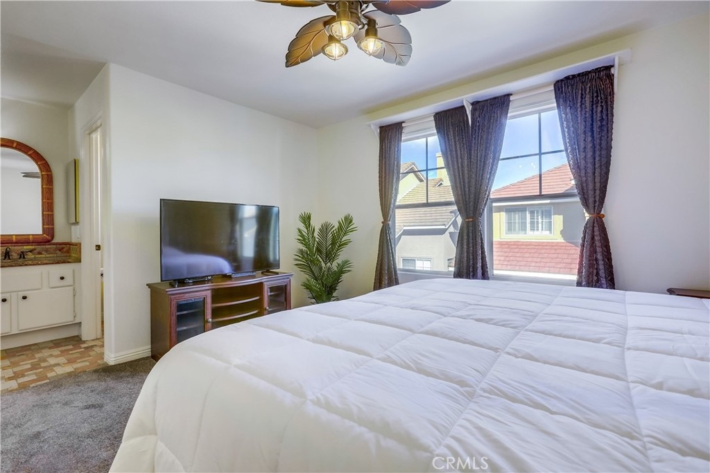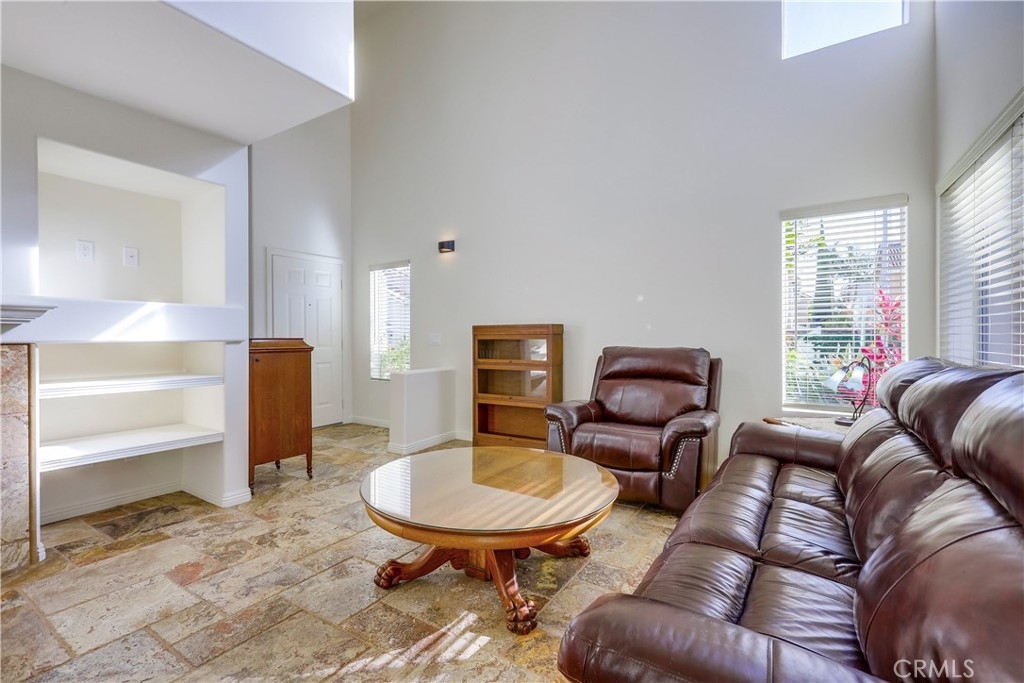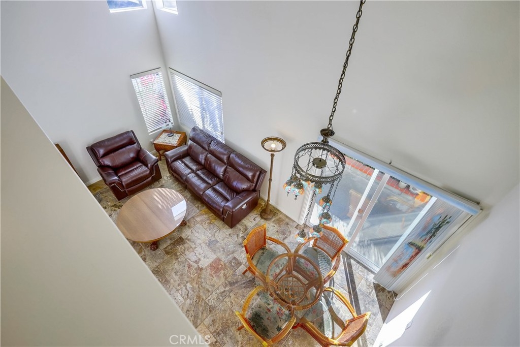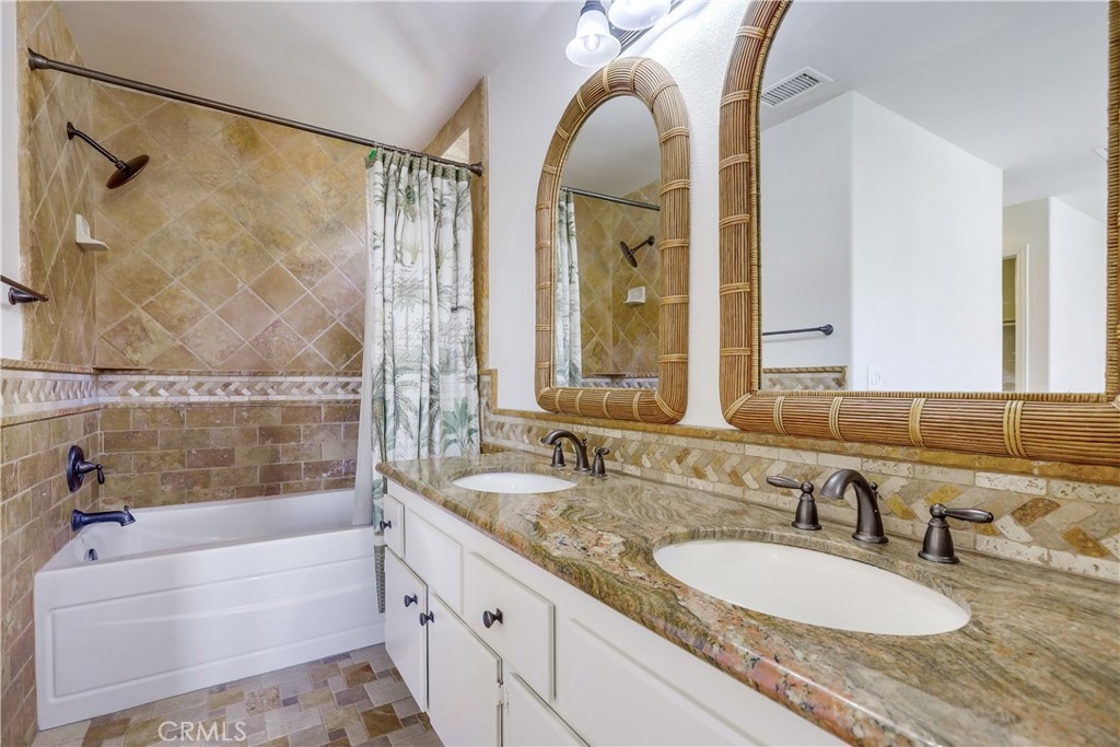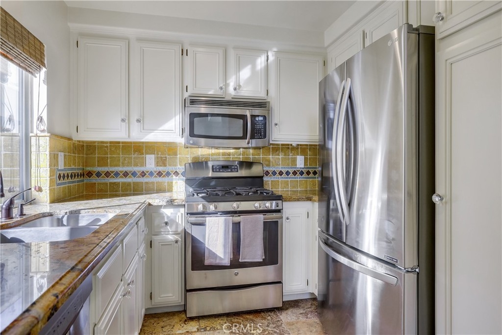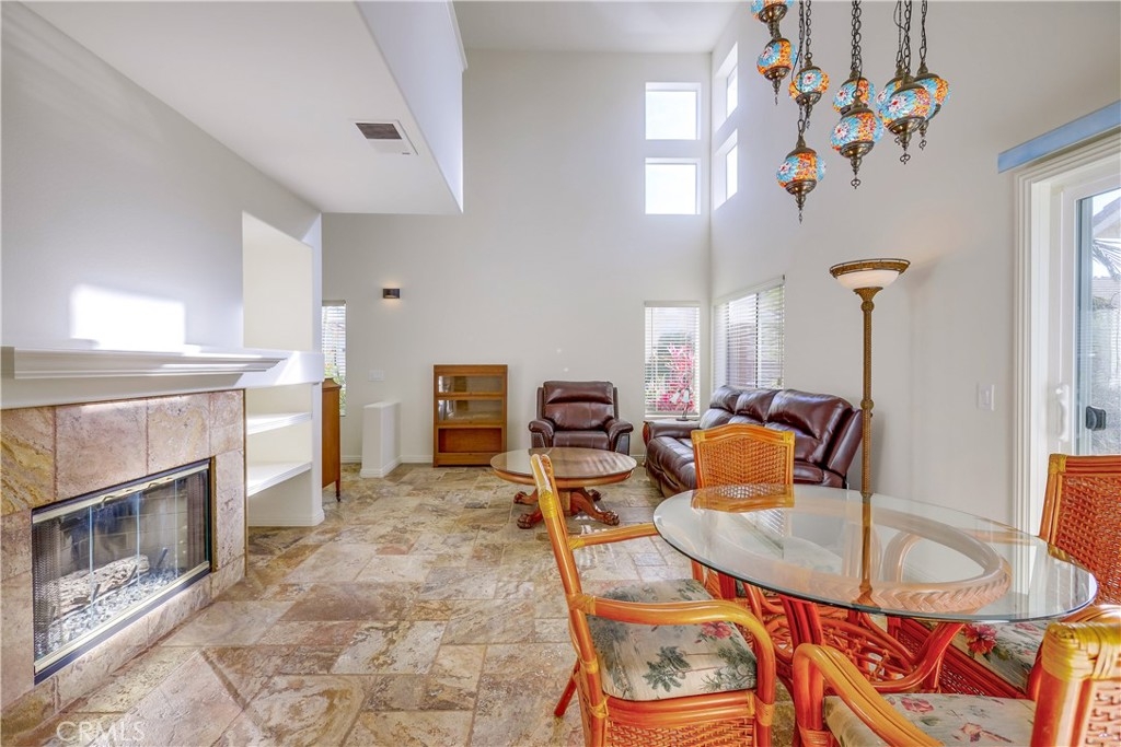 Sparkling gem with a prime corner lot location and recent improvements ideally located in the desirable Hamptons community within walking distance of local schools, parks, the Aliso Viejo Town Center. Step inside and soak in the soaring 2 story ceilings and the light filled interior spaces. Gorgeous stone tile floors, a freshly painted neutral interior, and an abundance of natural light set the stage for an ideal living environment. The well-designed open floor plan includes a spacious living area with a tile surround fireplace, built in shelving and a media nook, and is open to the dining area with direct access to the outdoor patio creating an ideal indoor-outdoor living space. The sunny kitchen boasts gorgeous granite countertops, a custom tile backsplash, and stainless-steel appliances. The convenient main level powder room has been beautifully upgraded with a custom granite topped vanity and custom lighting. The upstairs primary bedroom suite is a private retreat with custom ceiling fan, a large walk-in closet, and a beautiful primary bath with granite countertop, custom tile floor and backsplash, dual vanities, and a gorgeous tub/shower with a fully tiled surround and custom tile details. The guest bedroom is blessed with new carpet, new mirrored closet doors, and a full private bath with elegant custom tile features, a granite topped vanity with upgraded fixtures and hardware, and a framed vanity mirror. Additional fine features and improvements include upgraded baseboards and door casings throughout, updated tubs and toilets, upgraded wood flooring on stairs and loft area, new switches and plugs throughout, new recessed can lighting, new ceiling fans, new patio sliding door, new bedroom doors, new screens, upgraded water heater, new epoxy garage floors, upgraded garage door and opener, and garage ceiling storage racks. The outdoor patio is a peaceful oasis with easy care hardscape, brick planters, and colorful landscaping creating a wonderful space for relaxing, BBQing, and entertaining friends and family. The well-maintained community amenities include a tot lot playground, Free Little Library, and a sparkling community pool and spa, with picnic areas, covered cabanas, an outdoor cooking area, and seasonal community events. Just a short stroll to Oak Park, Canyon Vista Elementary, Soka University, Ice Palace, Library, Aliso Viejo Town Center, Theater, dining, shopping, and an abundance of hiking and biking in the hills and canyons close by.