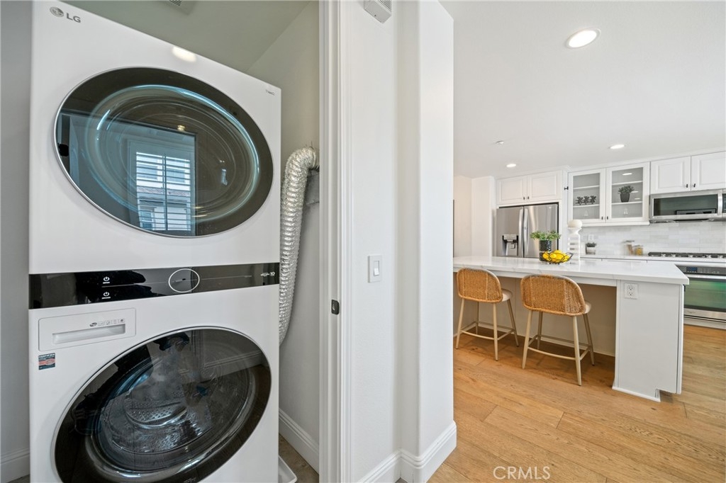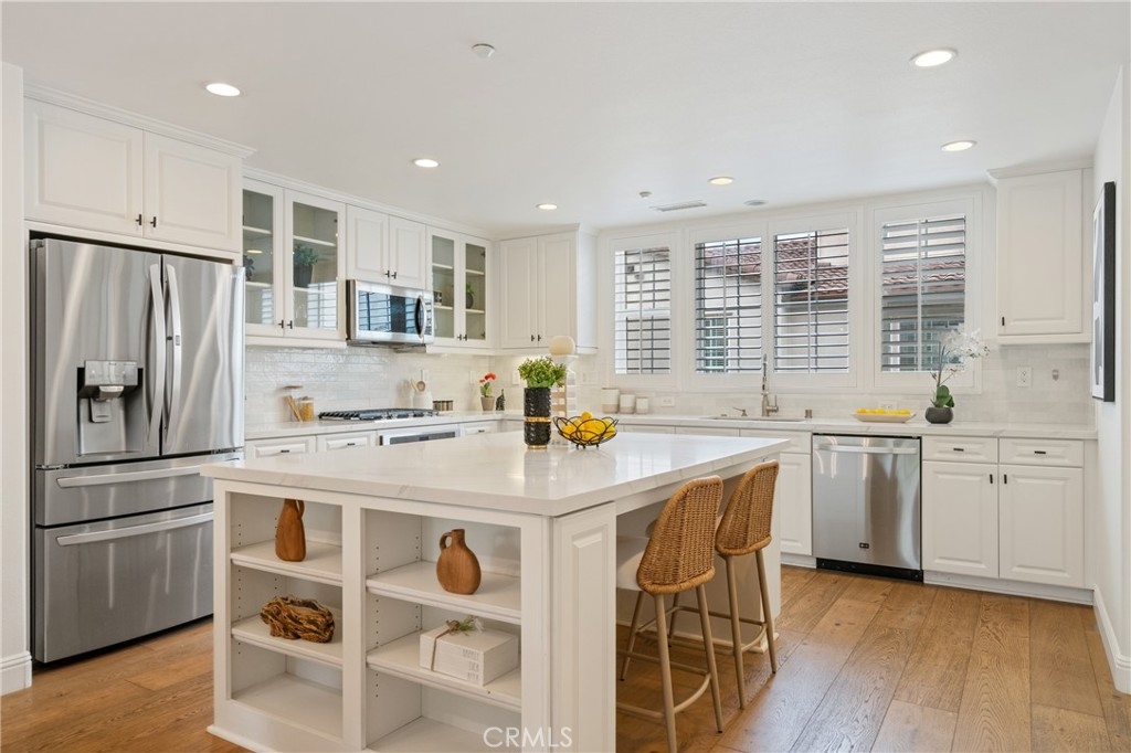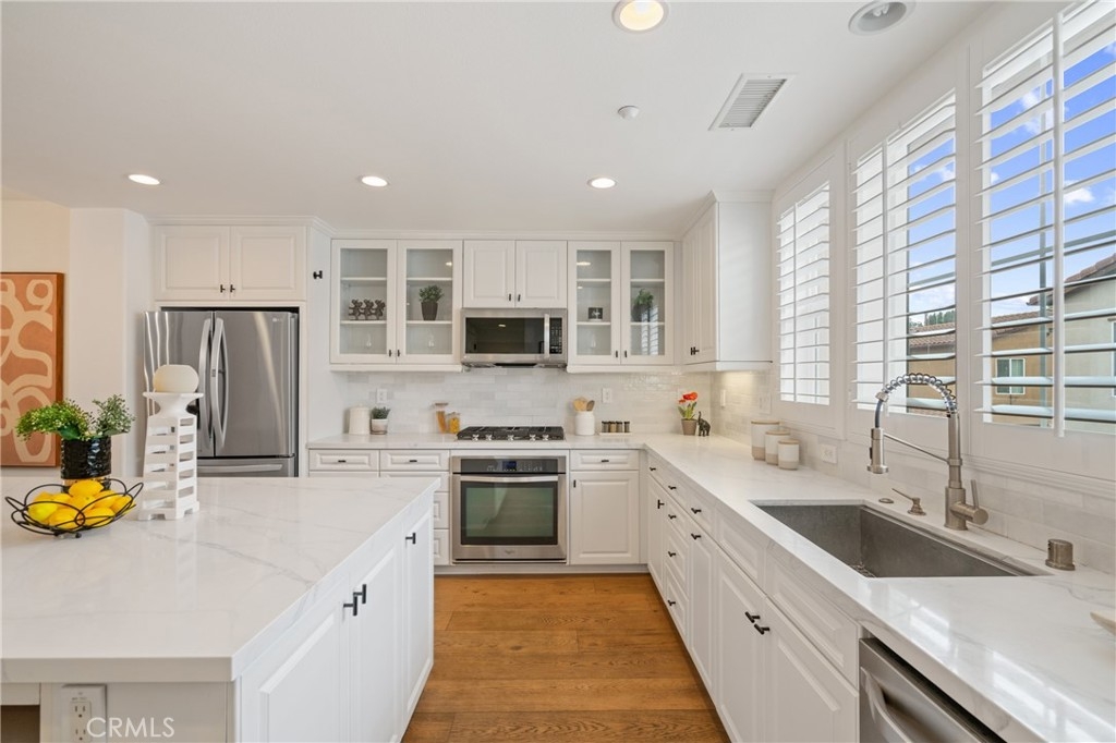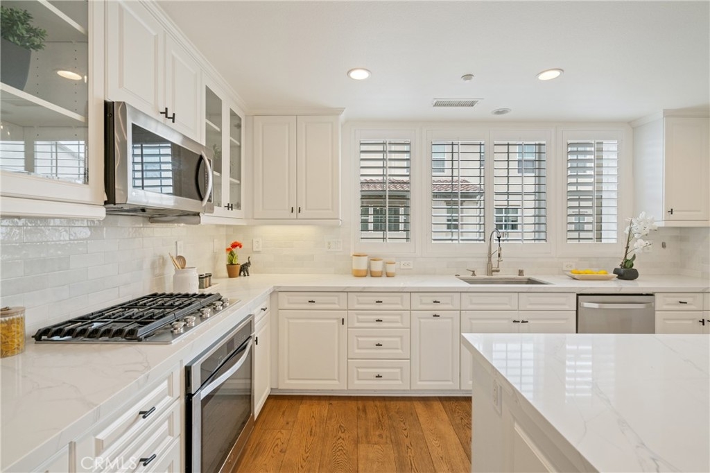 Located in the highly desirable Harbor Station neighborhood within the prestigious Glenwood Golf Community, this upgraded townhome offers the perfect blend of luxury and convenience. Each of the three spacious bedrooms features its own private full bath, providing comfort and privacy for all residents. Positioned on a premium perimeter lot, this street-facing home boasts stunning views of Glenwood Park and the surrounding Saddleback Mountains. Just a short walk to the Aliso Viejo Country Club, 18-hole Jack Nicklaus-designed golf course, and the City Aquatic Center, this home offers one of the best locations in Aliso Viejo. Inside, you’ll find thousands of dollars in high-end upgrades. Enjoy wood flooring and upgraded as well as a gourmet kitchen complete with LG stainless steel appliances—including an upgraded refrigerator, stovetop, microwave, and dishwasher. Beautiful quartz countertops, a large center island, and modern lighting and hardware make this kitchen perfect for entertaining. Additional features include a built-in entertainment system, newly installed LG stacked washer and dryer, and custom woodwork and marble flooring in the luxurious master bathroom. The private downstairs bedroom with a full bath is ideal for a home office, gym, or guest suite.Relax or entertain on the spacious front patio, ideal for evening BBQs while taking in the beautiful community setting.