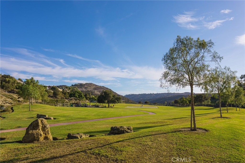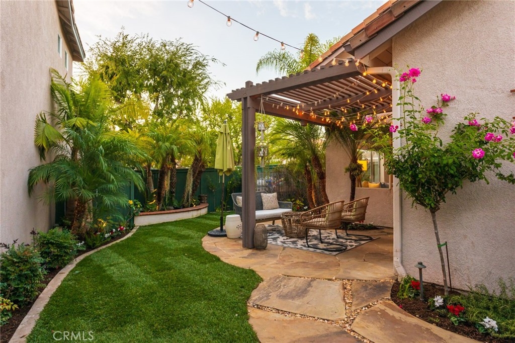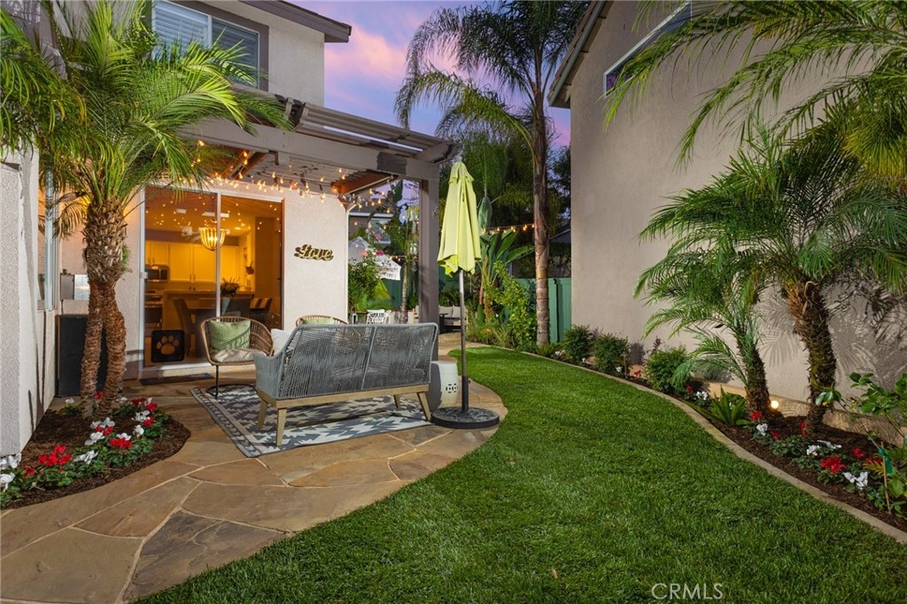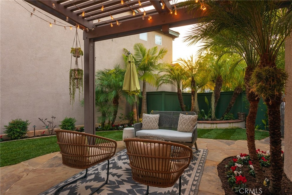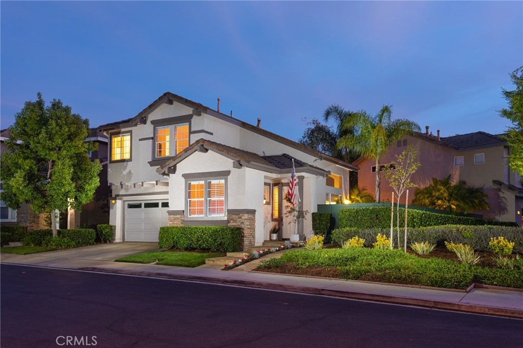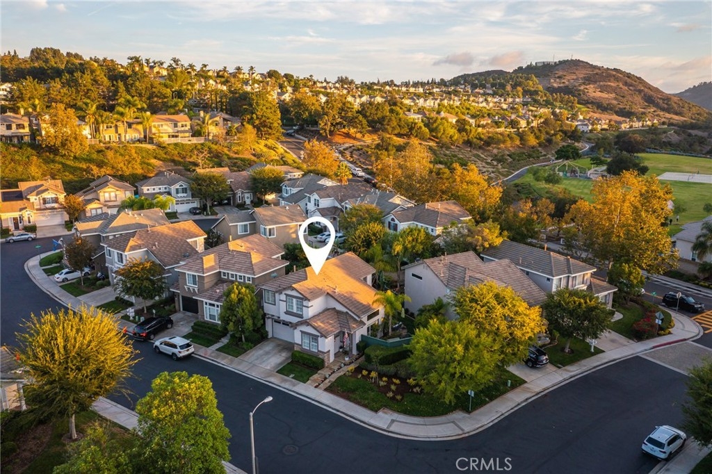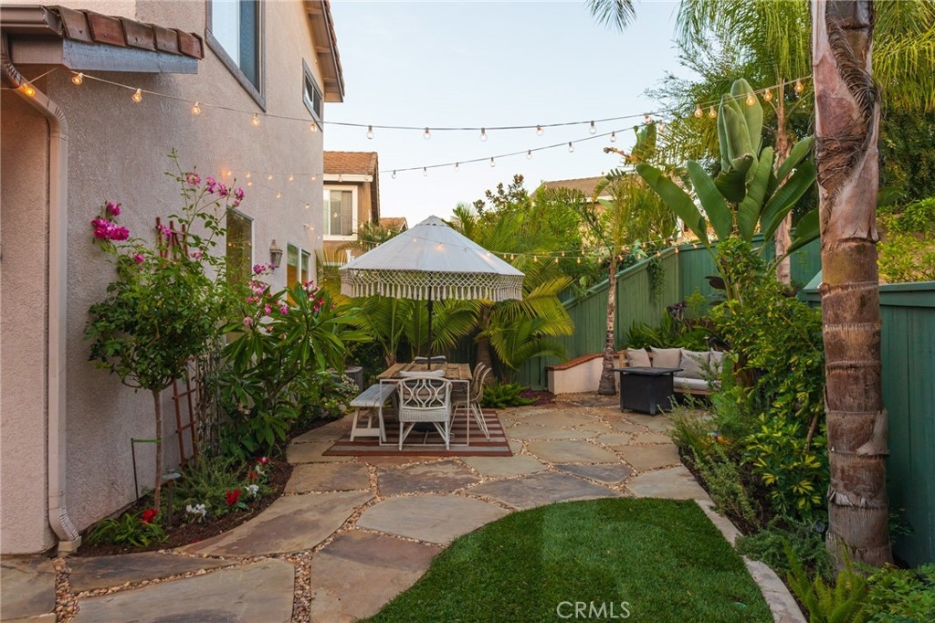 Set on a prime corner lot within the inviting community of Harvest in Aliso Viejo, this sun-drenched three-bedroom, two-and-three-fourths bathroom abode evokes charm, functionality, and convenience. Akin to a single-family residence, this rare-to-market detached home enjoys a wrap around yard, no common walls, and approximately 1,516 square feet of open plan living space. A flagstone entryway introduces the light and bright interiors and leads to the beamed, double height entryway anchored by a bespoke tile fireplace and engineered hardwood flooring. Equipped with top-of-the-line stainless steel appliances, the light-filled chef's kitchen features tile counters, blue and white shaker cabinetry, walk-in pantry, double basin sink, and offers views of the verdant backyard beyond. A generously-sized main-level bedroom, 3/4 bathroom, and spacious dining room complete the first level. Glass sliding doors lead to the property's grassy lawn, covered patio, and multiple alfresco dining areas curating the ultimate setting for casual and grand-scale entertaining. Ascending one level, the second floor is devoted to the laundry closet and two en-suite bedrooms including the sumptuous master retreat fit with a substantial walk-in closet, soaking tub, separate walk-in shower, and dual vanity sinks. Furthering the allure of the home are Nest thermostats, designer tile in bathrooms, custom window coverings, plantation shutters, baseboards, recessed lighting, and an attached two-car garage. Situated within a fantastic school district just moments from Canyon View Park hiking, recreation, 73 toll road, and picturesque beaches, this offering is not one to be missed!