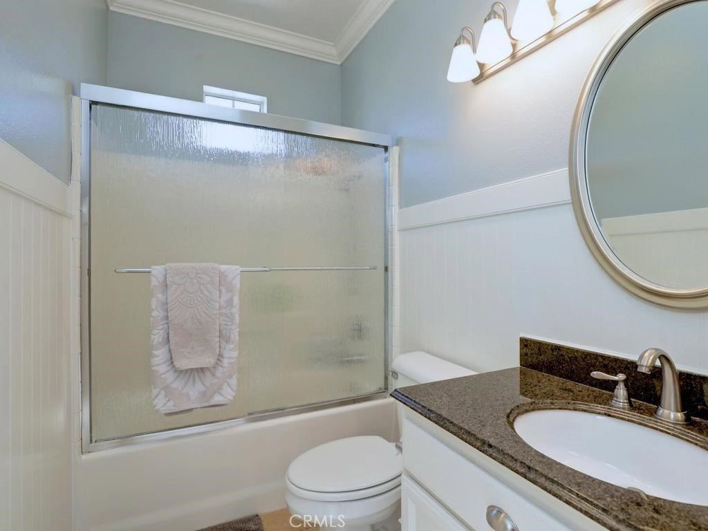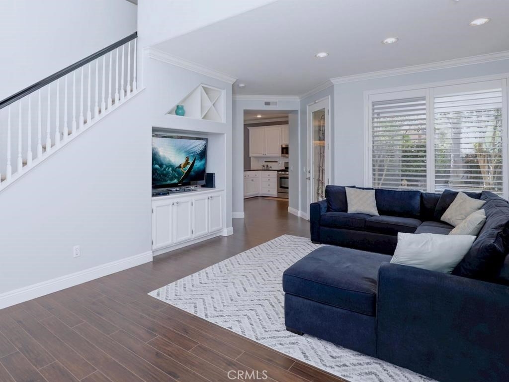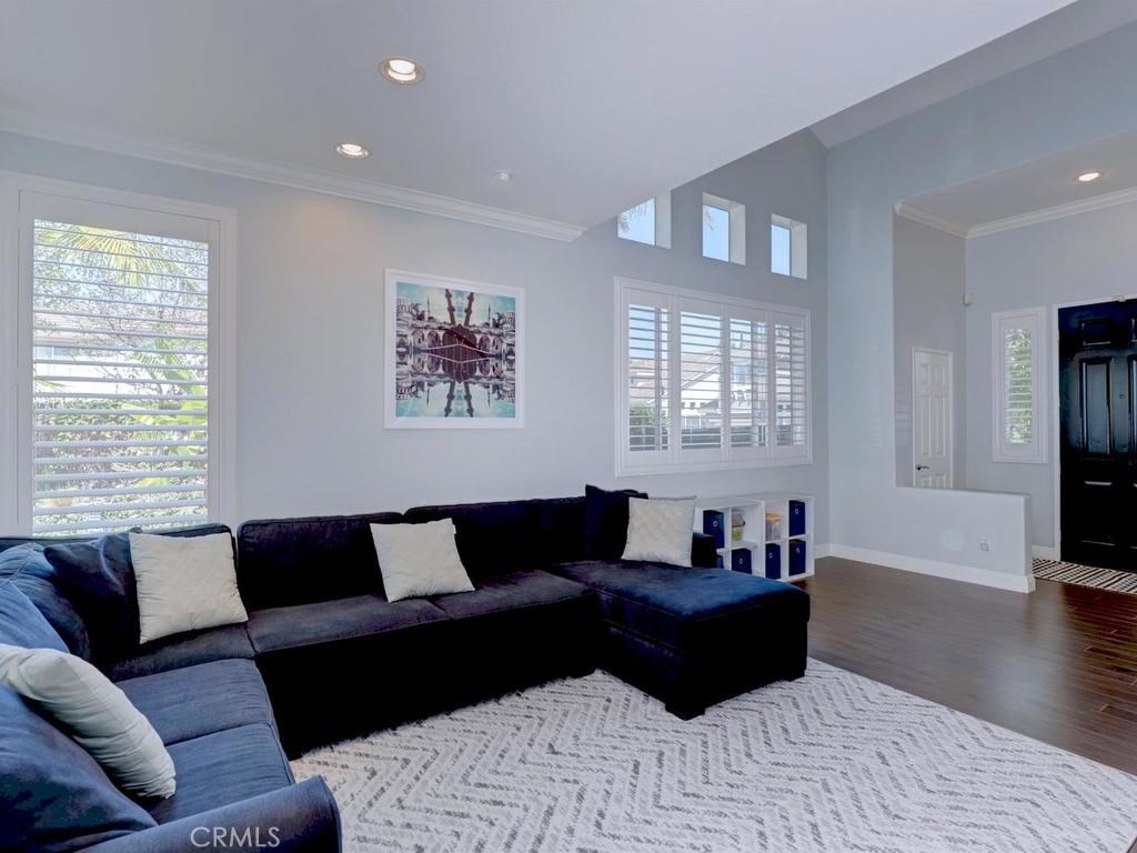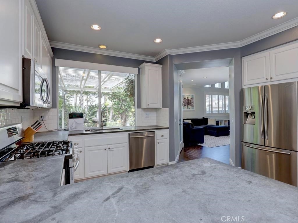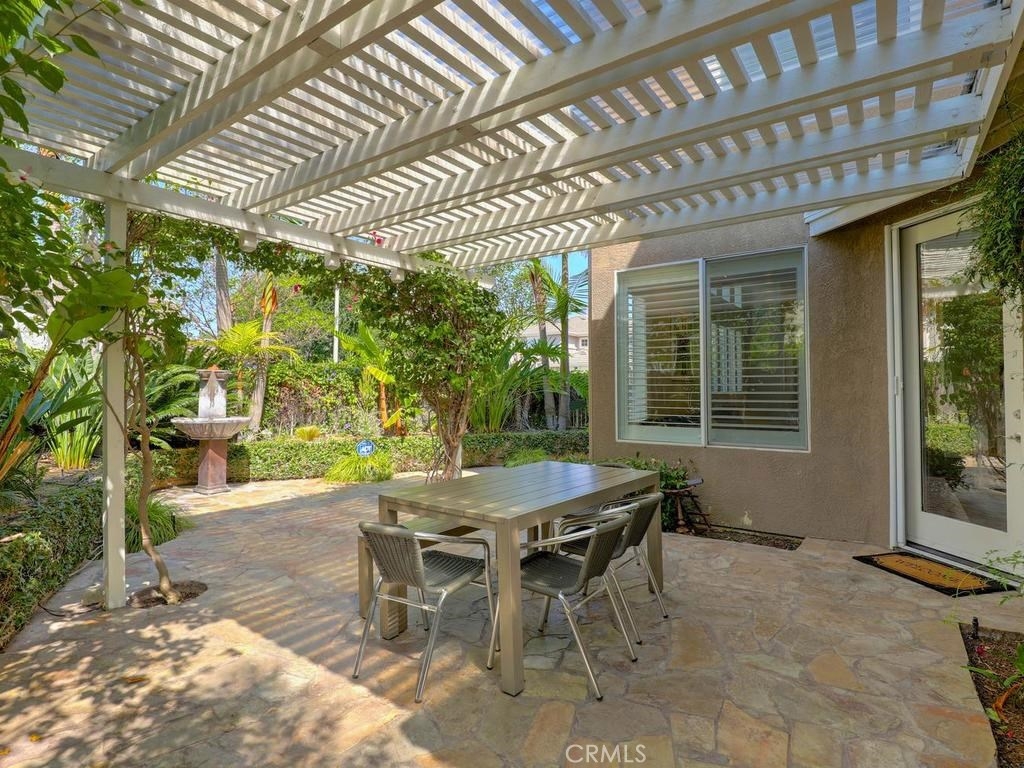 Welcome to 14 Yarrow, an elegant, updated beach-close cottage with room to breath and play inside and out. The home's front yard and long driveway sit next to a large greenbelt with a walking path to the park. A soaring ceiling at the entrance leads to the large living area with upgrades found throughout the home -- recessed lighting, crown molding, high baseboards, plantation shutters, and wood laminate floors. The upgraded kitchen opens to all of the living areas and includes stainless steel appliances, subway tile backsplash, custom white cabinets and pulls, farmhouse style stainless steel sink, and soapstone counters. Upstairs, the master bedroom has plantation shutters, high baseboards, crown molding, recessed lighting, wood laminate floors, a contemporary ceiling fan, and an en suite bathroom. The master bath includes dual sinks, separate tub and shower, plantation shutters, sconce and recessed lighting, white cabinets, custom pulls, and a large walk-in closet. In addition to the two secondary bedrooms, the upstairs includes a full-sized laundry room and a second full bathroom with wainscoting, granite counters, custom lighting, and crown molding. The extra-large and private backyard has flagstone hardscape, a covered pergola, and a variety of lush trees and plants. This home is a short walk to Canyonview Park, with its sports fields, shaded tot lot, and canyon vistas. 14 Yarrow is conveniently near the 73 toll road and zoned for the highly rated Don Juan Avila schools.