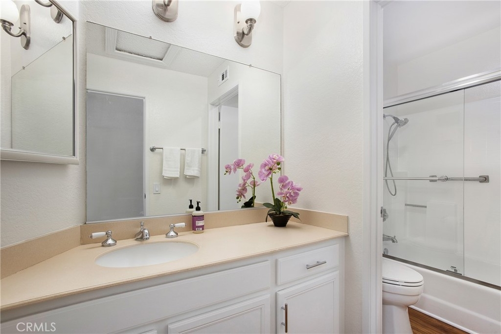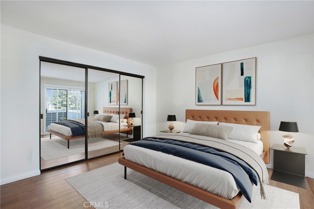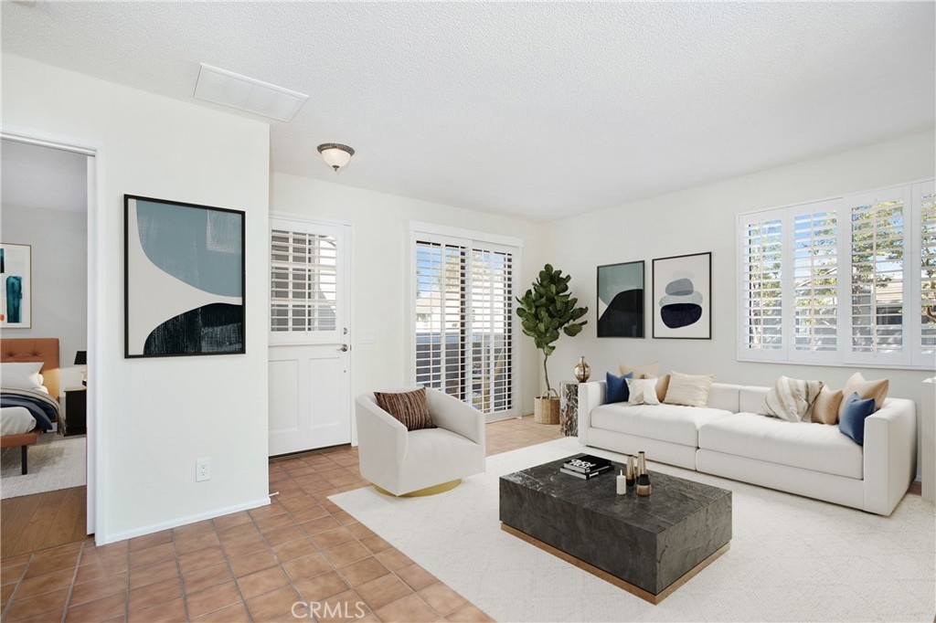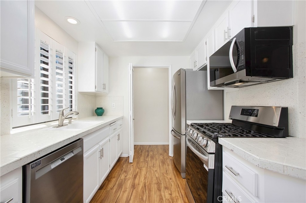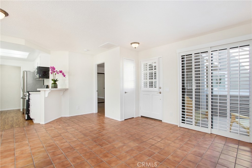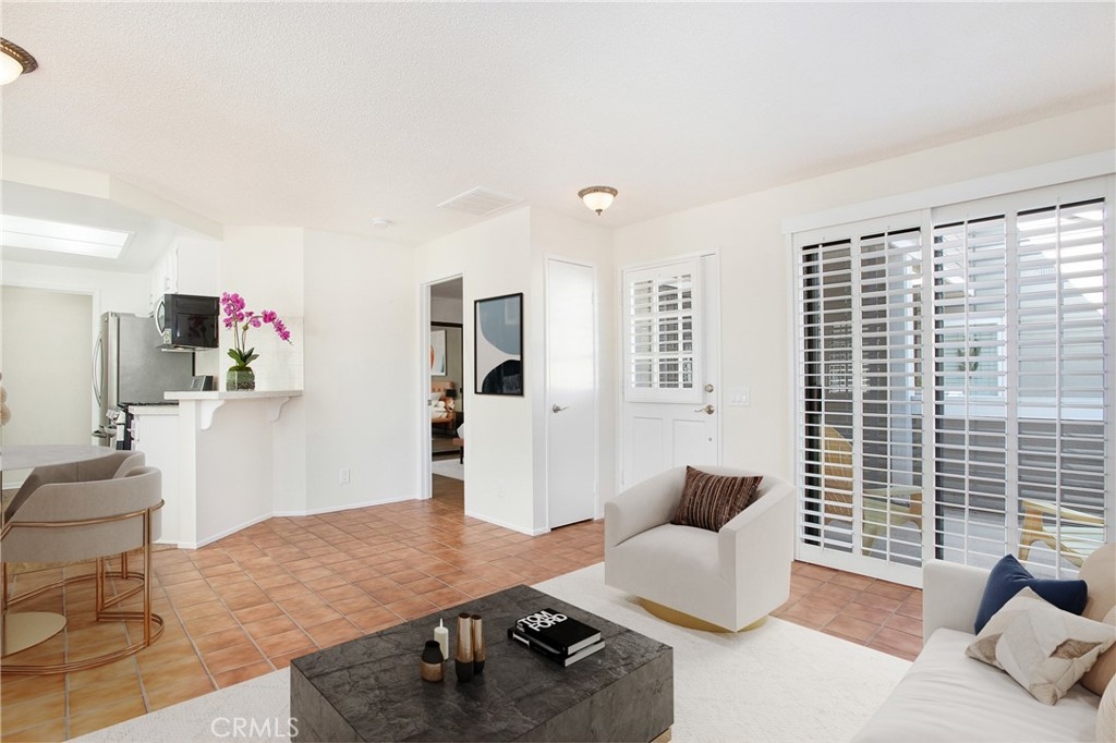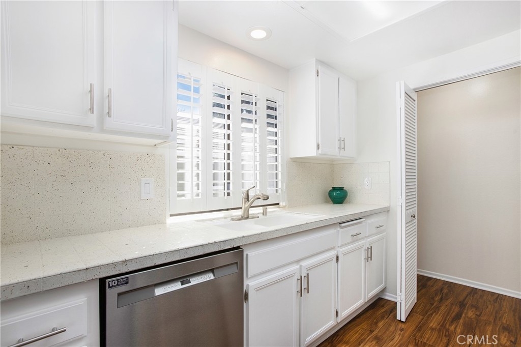 Welcome to your dream home! This charming upper-level condominium perfectly blends privacy, style, and convenience, offering many modern upgrades and amenities. The spacious entrance balcony sets the tone for the open, inviting floor plan. The expansive living room has a slider that opens to a cozy patio, perfect for enjoying your morning coffee or evening relaxation. The dining area boasts tiled flooring and seamlessly connects to the functional kitchen. With a sunny window over the sink, the kitchen has new stainless-steel appliances, including a refrigerator, brand-new gas range, microwave, and dishwasher to add a modern touch. New waterproof laminate flooring in kitchen and bathroom. The laundry closet is designed to accommodate a full-sized washer and dryer, making laundry days a breeze. The bedroom is a serene retreat, complete with a slider to the patio, a large sliding 3-door mirrored wardrobe, and stylish laminate flooring. Plantation shutters throughout the home provide both privacy and a touch of elegance. The ensuite bathroom is thoughtfully designed with a brand-new Kohler highboy toilet, a new glass tub enclosure, two safety grab bars, and a convenient hand-held shower head. Additional features include a detached 1-car garage with built-in cabinetry, a brand-new Lift Master motor and door opener, and a convenient keypad for entry. The community offers a short walk to the pool, spa, and tennis courts, with plenty of guest parking in front of the unit, and your mailbox is nearby. Water and trash are included in the low monthly association dues, adding to the ease of living here. This home is beautiful and meticulously maintained with numerous upgrades: a new air conditioner installed in 2019, a furnace replaced in 2006, and freshly painted throughout. The front door and front hall closet handles are finished in satin nickel, while bedroom doorknobs and all bathroom fixtures are chrome, providing a cohesive and stylish look. Professionally cleaned tile flooring with grout sealer adds sparkle. Conveniently located close to shopping, dining, entertainment, and toll roads, this condominium is a perfect place to call home. Don’t miss the opportunity to make it yours!