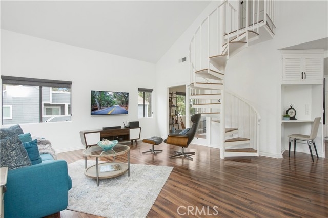 Welcome Home! This stunning upper-end unit condo has it all—upgrades, light, and bright with high ceilings. As you enter, the spacious living room greets you with laminate wood floors, multiple windows, and soaring ceilings. To your right, the beautifully upgraded white kitchen, featuring stainless steel appliances and granite countertops, invites the chef in you to cook and entertain. The counter is large enough for four bar stools, perfect for casual dining or socializing. Adjacent to the kitchen, the dining room offers convenient access to the balcony through a sliding door, making it easy to serve your BBQ straight from the grill to the table. This level also boasts a spacious bedroom with double French glass doors and an updated bathroom. A unique spiral staircase, reminiscent of New York lofts, leads to the master bedroom and a full bathroom. Both bathrooms are elegantly upgraded and look fantastic. The home is airy and spacious, featuring high ceilings, a one-car garage, and an additional parking space. The community offers ample guest parking. The association meticulously maintains the buildings and common areas, including the pool, spa, and multiple tennis courts. HOA fees also covers trash and water. The location is ideal, with close proximity to Aliso Viejo Biking trail, major shopping centers, freeways, award-winning schools, and just a few miles from beautiful beaches. Don't miss out on this exceptional home!