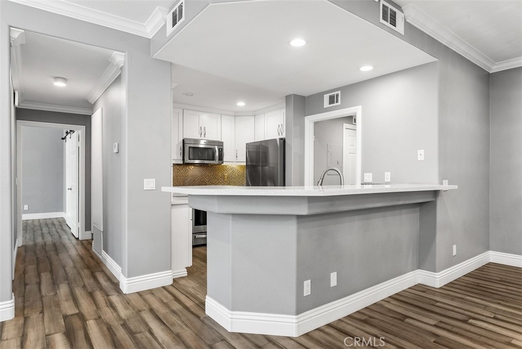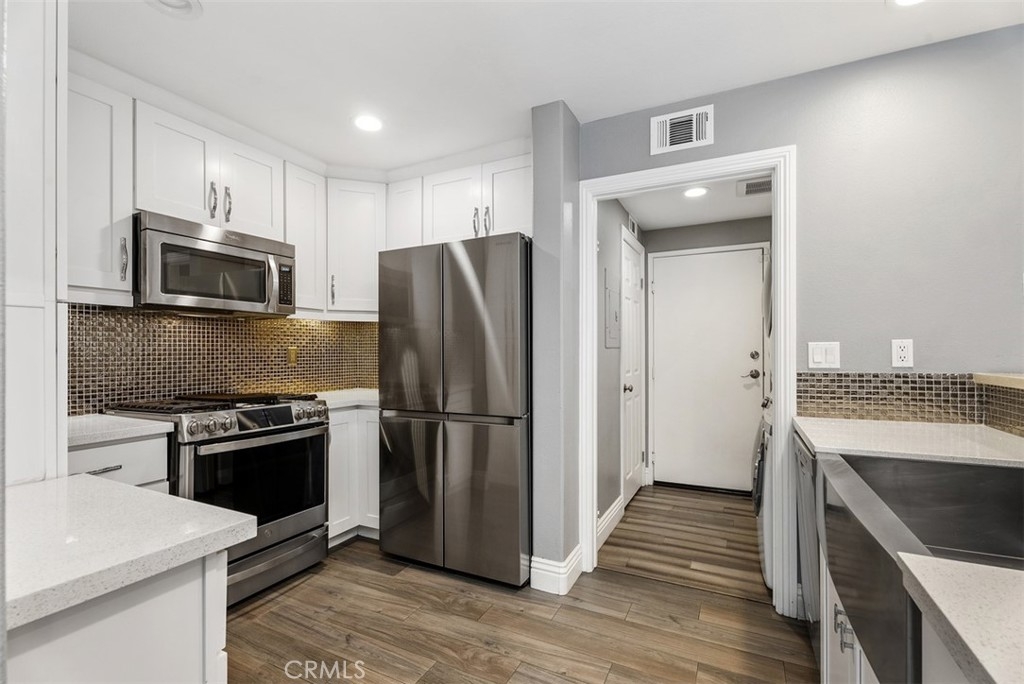 Welcome to this highly upgraded and immaculate end unit in the desirable La Mirage community! Recently remodeled and completely turnkey, this bright and open floor plan features a spacious living room with a cozy fireplace, dining area, and charming kitchen with stainless steel appliances, modern sink, and direct access to a full-size laundry room with extra storage. A private patio extends your living space outdoors, perfect for relaxing or entertaining. The two bedrooms are generously sized with abundant natural light. The primary suite boasts a large walk-in closet with custom built-ins and a stylish barn door leading to a beautifully updated bathroom with dual sinks and a walk-in shower. Enjoy resort-style living with community amenities including a pool, spa, BBQ areas, lighted tennis court, and clubhouse—plus trash service included. Conveniently located near award-winning schools, scenic hiking and biking trails in Aliso and Wood Canyon Wilderness Park, Soka University, and the shops, dining, and entertainment of Aliso Viejo Town Center. One attached garage with Epoxy flooring and additional reserved parking add everyday convenience. This peaceful, well-situated home offers the best of Orange County living!