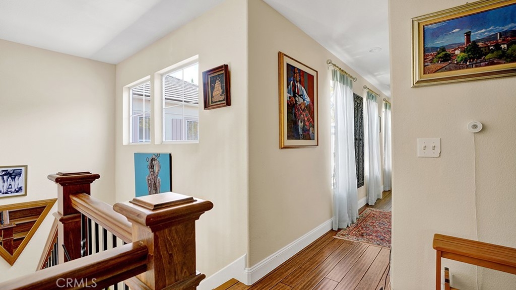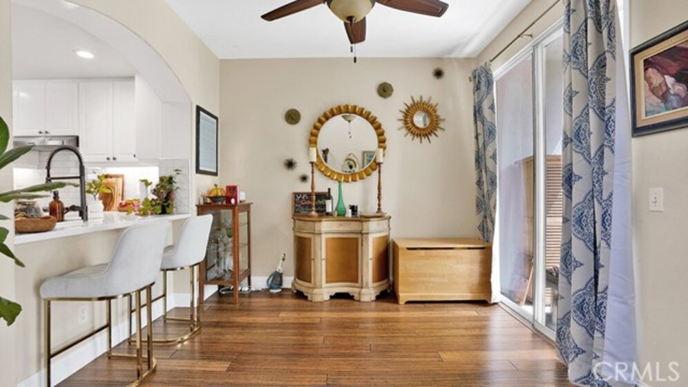 This renovated 3-bedroom, 2.5-bath townhome is nestled in the La Mirage community - just across from Soka University and steps from the trails of Aliso & Wood Canyons Wilderness Park. Inside, the open-concept main level makes an immediate impression — wide-plank hardwood floors flow throughout, anchored by a custom wrought iron staircase. The kitchen has been thoughtfully reimagined with a with a generous farmhouse sink and crisp subway tile backsplash. It opens seamlessly into the dining area and living room, creating a natural gathering space that extends through two sets of sliding doors to a large, private enclosed patio with peaceful mountain views framed by mature trees — an ideal spot for morning coffee or evening unwinding. Upstairs, the primary suite is a proper retreat: vaulted ceilings, dual closets, and a well-appointed en-suite bathroom. Two additional bedrooms and a full bath offer flexibility for family, guests, or a dedicated home office. Outfitted with a full suite of smart home technology including Ecobee Smart Thermostat with temperature sensors throughout the home, Flair Smart Vents, Aqara Smart Video Doorbell, Philips Wiz Multicolor Smart Lights at the entrance and various rooms, and Schlage Smart Lock on the front door. The attached two-car garage with direct interior access adds everyday convenience. It is also EV-ready, featuring a dedicated 240V outlet for Level 2 charging. Ample guest parking makes hosting seamless. La Mirage is a well-maintained community offering a pool, spa, tennis courts, and a clubhouse, with easy access to the 73 Toll Road, Aliso Viejo Town Center, and top-rated Capistrano Unified schools. Hiking and biking trails, beaches, and the energy of coastal Orange County are all within easy reach.