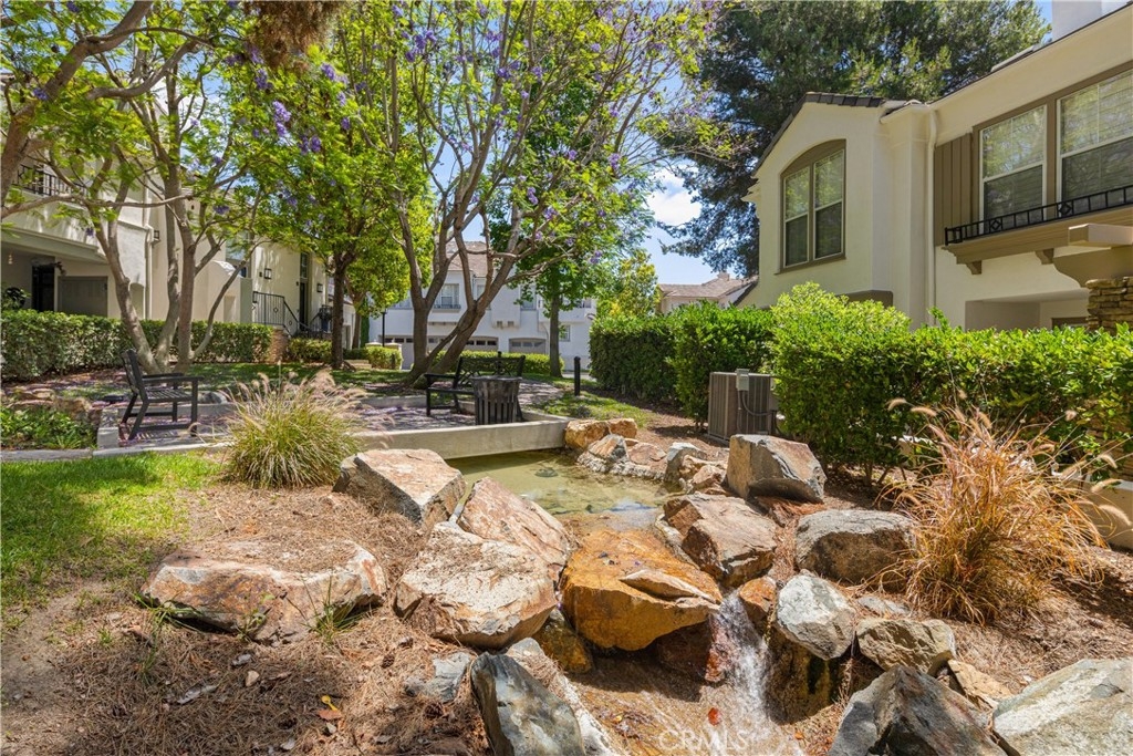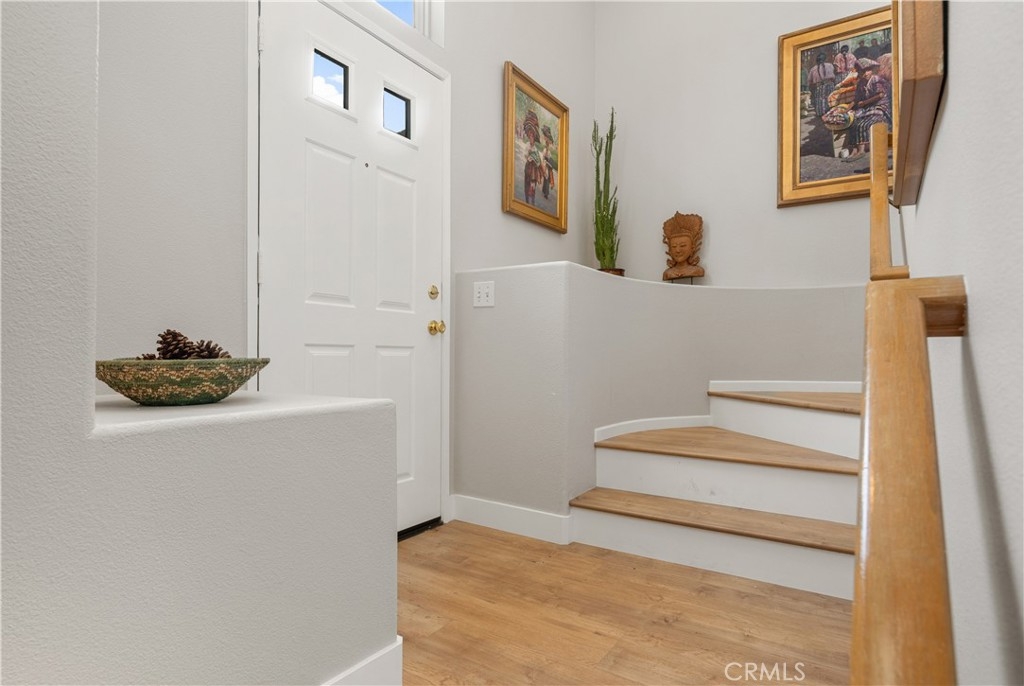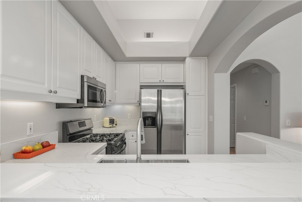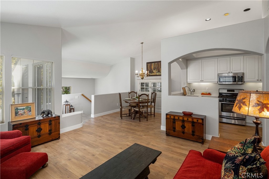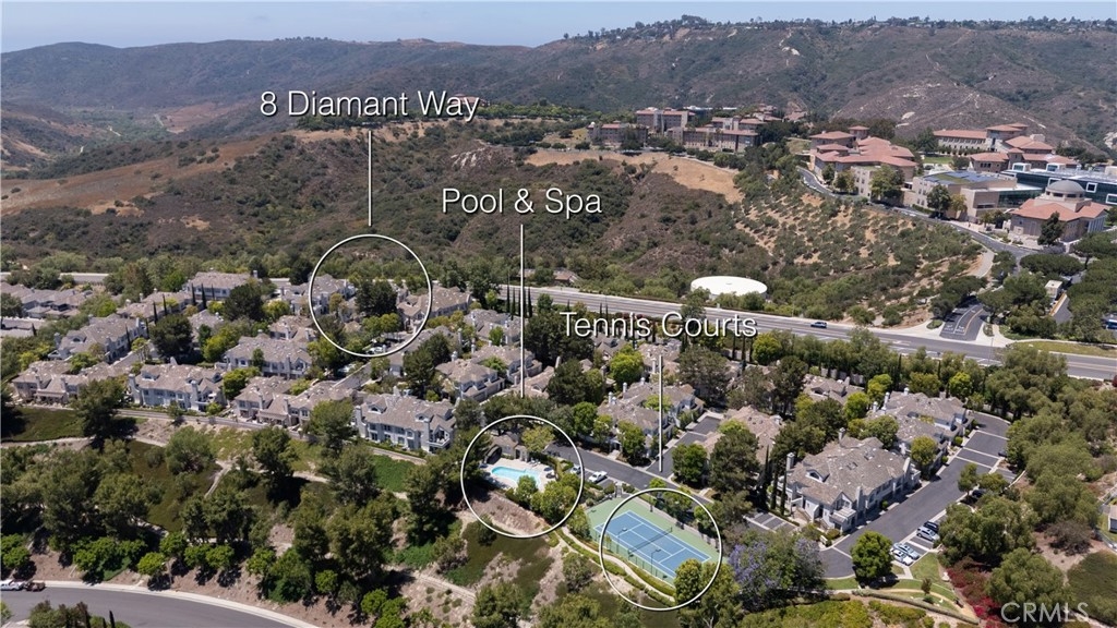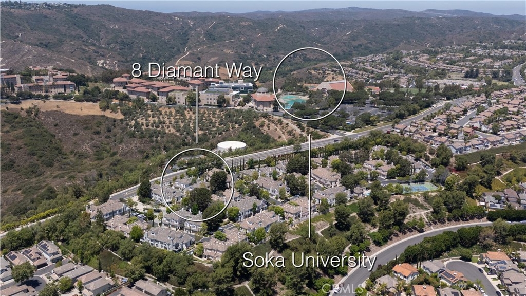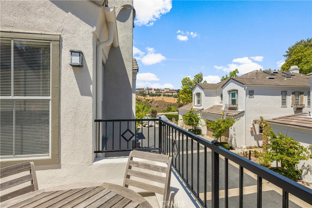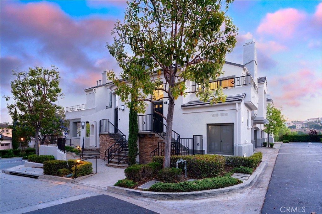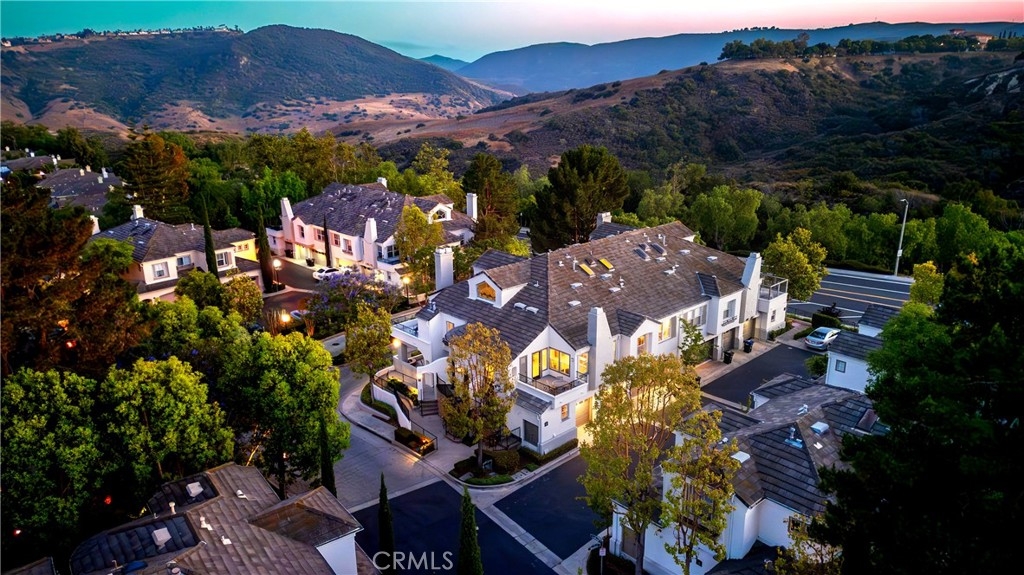 Welcome to this carriage-style end-unit, newly upgraded throughout, where refined finishes meet serene surroundings. From the moment you step inside, you’re greeted by soaring ceilings and a graceful curved staircase that sets the tone for the home’s thoughtful design. This desirable layout offers the ultimate in privacy with no neighbors above or below, and features a bright, open floorplan anchored by a charming fireplace, vaulted ceilings, and richly hued wood-look durable waterproof flooring. Light and bright all day long, the home has fresh interior and exterior paint and fixtures, lending a neat, clean feel. The kitchen with breakfast bar has been tastefully updated with quartz countertops, stainless steel appliances, a new deep stainless sink, new microwave, and new garbage disposal, refrigerator is included. Both bathrooms have been refreshed with newly painted cabinetry, while the primary suite provides a peaceful retreat with quartz countertop dual vanities, a walk-in shower, and a spacious walk-in closet with custom built-ins. A full-size interior laundry room with its own storage closet adds everyday convenience, while recent upgrades such as a new HVAC system, epoxy-coated plumbing, and a newly painted fireplace ensure lasting comfort and style. Step outside onto your private balcony and take in majestic views of Aliso & Wood Canyons Wilderness Park and the Saddleback Valley, with an HOA-scheduled epoxy coating for the deck coming soon. The oversized, direct-access garage is enhanced by storage shelving and ceiling-mounted racks, and the home includes an additional reserved parking space. Located in the award-winning La Mirage community, recognized for its architectural design, residents enjoy resort-style amenities including a sparkling pool and spa, BBQ areas, lighted tennis court, clubhouse, and included trash service. Perfectly situated near award-winning schools, scenic hiking trails, Soka University, and just minutes from the Aliso Viejo Town Center’s shops, restaurants, and theater, this turnkey home offers the best of Southern California living.