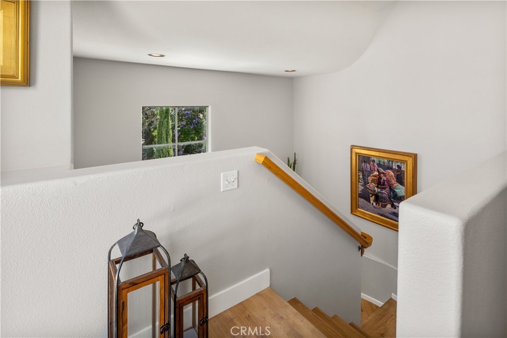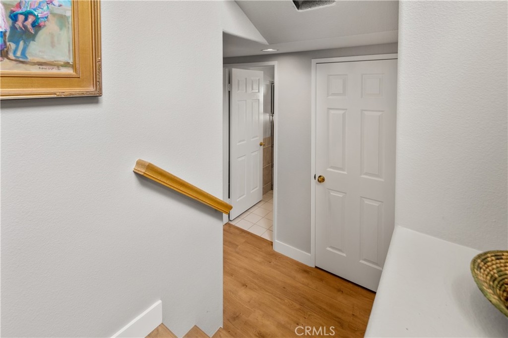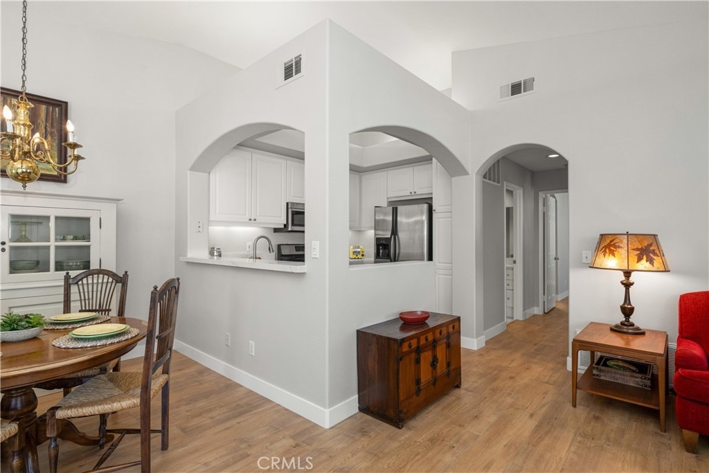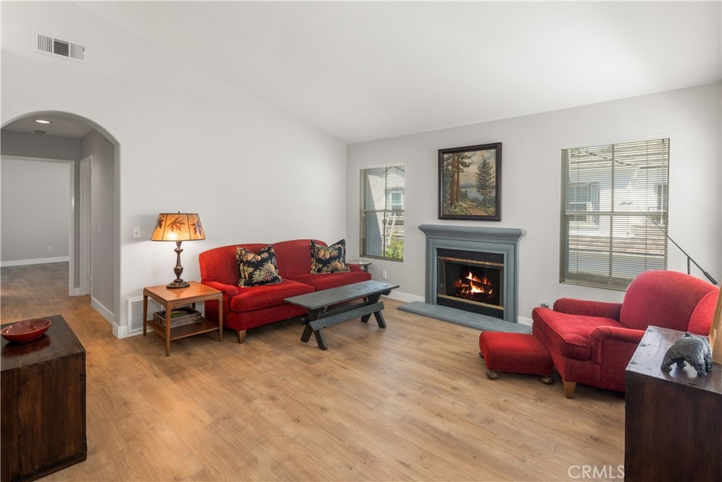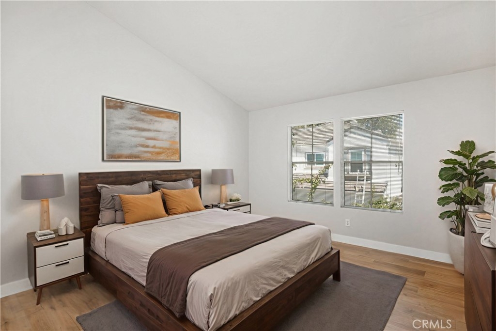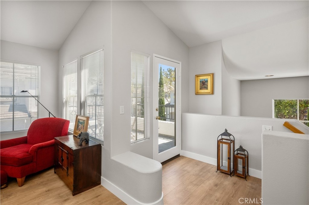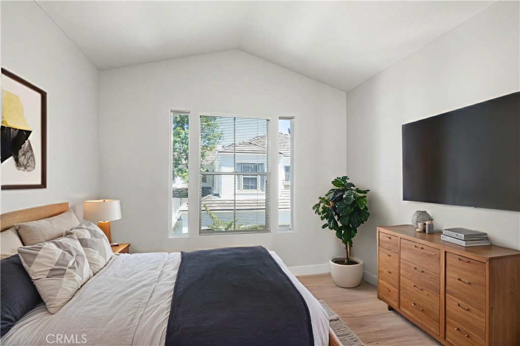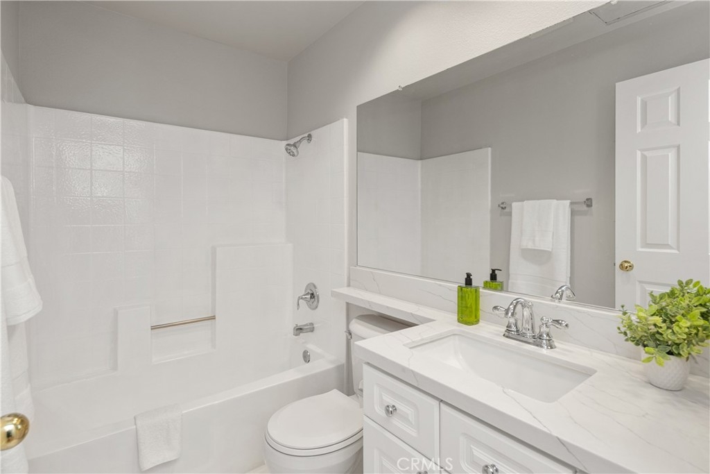 Welcome to this carriage-style end-unit, newly upgraded throughout, where refined finishes meet serene surroundings. From the moment you step inside, you’re greeted by soaring ceilings and a graceful curved staircase that sets the tone for the home’s thoughtful design. This desirable layout offers the ultimate in privacy with no neighbors above or below, and features a bright, open floorplan anchored by a charming fireplace, vaulted ceilings, and richly hued wood-look durable waterproof flooring. Light and bright all day long, the home has fresh interior and exterior paint and fixtures, lending a neat, clean feel. The kitchen with breakfast bar has been tastefully updated with quartz countertops, stainless steel appliances, a new deep stainless sink, new microwave, and new garbage disposal, refrigerator is included. Both bathrooms have been refreshed with newly painted cabinetry, while the primary suite provides a peaceful retreat with quartz countertop dual vanities, a walk-in shower, and a spacious walk-in closet with custom built-ins. A full-size interior laundry room with its own storage closet adds everyday convenience, while recent upgrades such as a new HVAC system, epoxy-coated plumbing, and a newly painted fireplace ensure lasting comfort and style. Step outside onto your private balcony and take in majestic views of Aliso & Wood Canyons Wilderness Park and the Saddleback Valley, with an HOA-scheduled epoxy coating for the deck coming soon. The oversized, direct-access garage is enhanced by storage shelving and ceiling-mounted racks, and the home includes an additional reserved parking space. Located in the award-winning La Mirage community, recognized for its architectural design, residents enjoy resort-style amenities including a sparkling pool and spa, BBQ areas, lighted tennis court, clubhouse, and included trash service. Perfectly situated near award-winning schools, scenic hiking trails, Soka University, and just minutes from the Aliso Viejo Town Center’s shops, restaurants, and theater, this turnkey home offers the best of Southern California living.