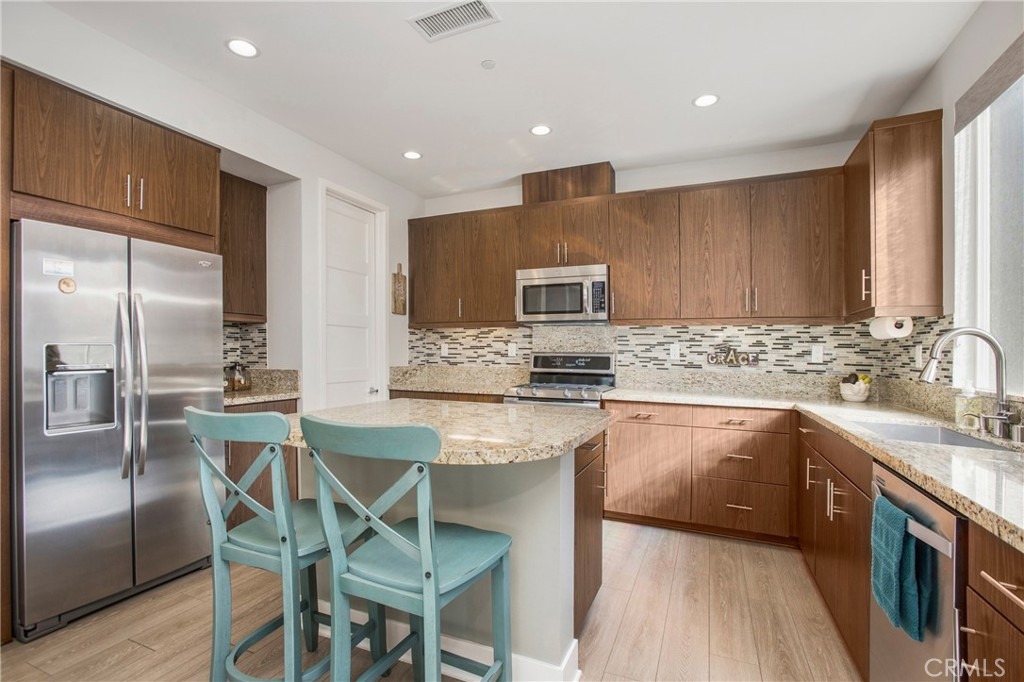 Welcome home to 1 District, a beautifully upgraded end unit home in the Elements at Vantis community which is a mix of natural beauty and soft urban cityscape. The home features an open floor plan, high ceilings, recessed lighting, ceiling fans, plantation shutters, silver oak hardwood floors throughout, and new carpeting on the stairs. The gorgeous kitchen has granite countertops, custom backsplash, a center island with barstool seating, and stainless steel appliances. The spacious living room with a large TV wall and the dining room are open to the kitchen. There is a half bath on this level and a home office area. The covered patio is off of the dining room which is perfect for a barbeque and a couple of chairs to enjoy the sunshine. Upstairs there are two spacious bedrooms each with their own upgraded bathrooms. The primary bedroom has a beautiful ensuite bathroom with granite counters, dual sinks, and a large step in shower. A separate laundry room with space for full size machines is on the upper level. 2 car side-by-side garage is attached with direct access. Enjoy the Vantis lifestyle with luxurious amenities like a gym, billiards room, clubhouse, business center, car washing station, outdoor dining and barbecue areas, and a resort style salt-water, heated pool and spa with covered cabanas. Within walking distance, you will find dining, shopping, and entertainment at the Aliso Viejo Town Center. The Vantis area is slated for excellent schools within the Capistrano school district.