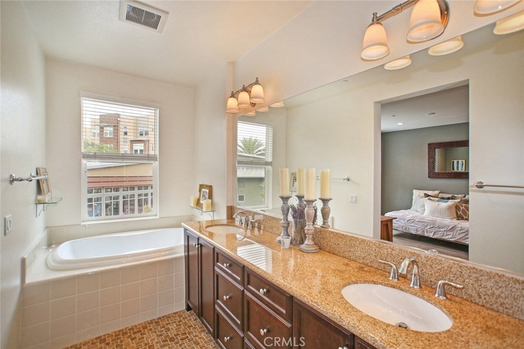 Experience sophisticated Urban city living at its BEST... Located in the heart of Aliso Viejo! This highly upgraded home offers over 1,638 square feet, 2 luxurious MASTER SUITES, two car attached garage & SPACIOUS FRONT PATIO perfect for entertaining. The open, bright floor plan features stunning engineered hardwood floors, designer paint & recessed light fixtures, and custom shutters throughout. The entertainer's kitchen features granite countertops and energy star stainless GE appliances. This energy efficient unit features dual-paned Milgard windows with low-emissivity glass throughout to provide improved insulation and energy savings complete with a lifetime warranty. A SEPARATE LAUNDRY ROOM (not closet) with full size washer & dryer is conveniently located on the second level. Located near the pool and indoor workout facility, this rare unit opens to a green belt directly in front of your front door. Enjoy the Vantis Club, a private gym, sparkling pool and spa with covered cabanas, outdoor kitchen with 2 outdoor fireplaces, business center and 6 beautiful "sense" gardens. Located within walking distance to shopping, restaurants, movies and so much more! Only 2 minutes from the 73 Fwy, 12 minutes to John Wayne Airport or 10 mins from the 405.