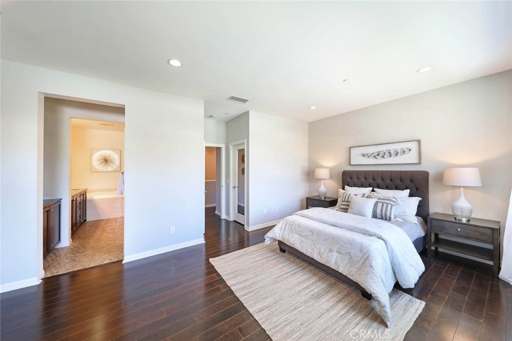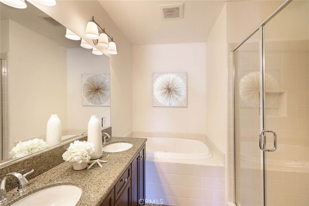 LOWEST PRICED CONDO PER SQUARE FOOT. TWO SPACIOUS MASTER SUITES. 2 BEDROOM 2.5 BATH 1638 SQUARE FEET. Directly in front of a beautiful greenbelt, this home offers a tranquil, backyard-like setting rarely found in condo living. Enjoy the versatility of TWO spacious MASTER SUITES, each large enough to easily accommodate a home office setup and/or a crib for your growing family. The open and bright floor plan features engineered hardwood floors, designer paint, recessed lighting, and an entertainer’s kitchen with granite countertops and energy-efficient GE stainless steel appliances. A spacious front patio is perfect for entertaining, while the attached 2-car garage adds convenience. Additional highlights include dual-paned Milgard windows with low-emissivity glass for excellent insulation, a separate laundry room with full-size washer and dryer, and easy access to the community pool, fitness center, and greenbelt. Residents enjoy exclusive access to the Vantis Club, which offers a private gym, resort-style pool and spa, outdoor kitchen with fireplaces, business center, and tranquil “sense” gardens. The location is unbeatable—within walking distance to shopping, dining, and entertainment, and minutes from the 73 Freeway, John Wayne Airport, and the 405 for ultimate convenience and lifestyle.