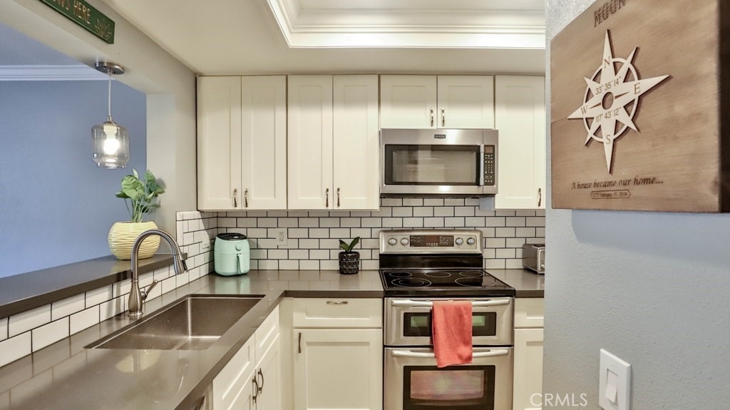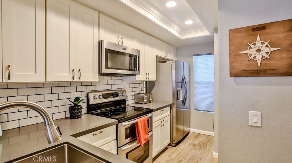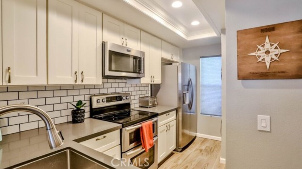 Don't miss out on this beautifully remodeled 2 bedroom, 1 bathroom, 2-story townhome. Located in the serene Morningside Community of Aliso Viejo, you will love the neighborhood. As you walk through, you will see no detail has been overlooked. With new tile flooring and crown molding throughout the first floor, this townhouse feels like a modern home. The kitchen features grey quartz countertops, newer white shaker cabinets, complimented by a subway tile backsplash, a new sink, new pendant lighting and stainless steel appliances. The full size, stackable, washer and dryer are located in the kitchen as well. Upstairs both bedrooms are generously sized with a balcony off of the main bedroom. The bathroom has been completely remodeled with a subway tile shower, quartz countertop, white shaker cabinets, new light fixtures and a designer mirror. All this with a private front entry that has drought resistant plants along with alumawood fencing. The private back patio has pavers and alumawood fencing with a gate. Perfect for BBQ and enjoying a glass of wine. This townhouse also has 1 assigned carport and 1 assigned parking space, both nearby. The Association offers a pool, spa, grilling area and gorgeous greenbelt areas to enjoy. You are just moments from great restaurants, shopping (Costco), hiking, biking trails, parks, the 73 Toll Road and the 5 Fwy. Make an appointment to visit this townhome before it is gone.