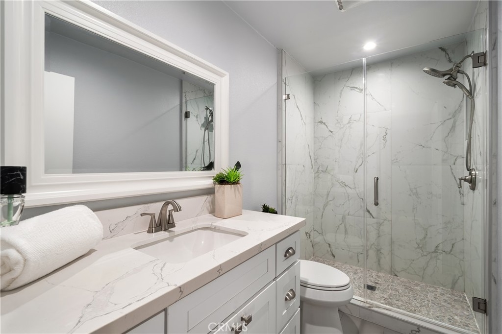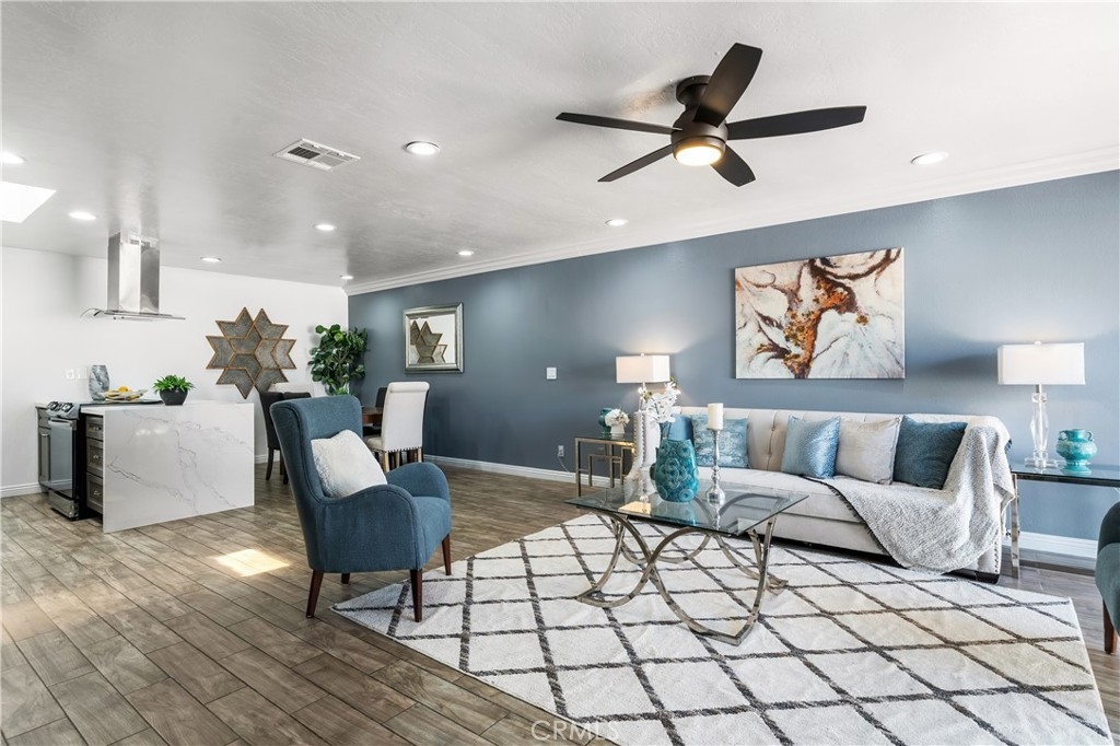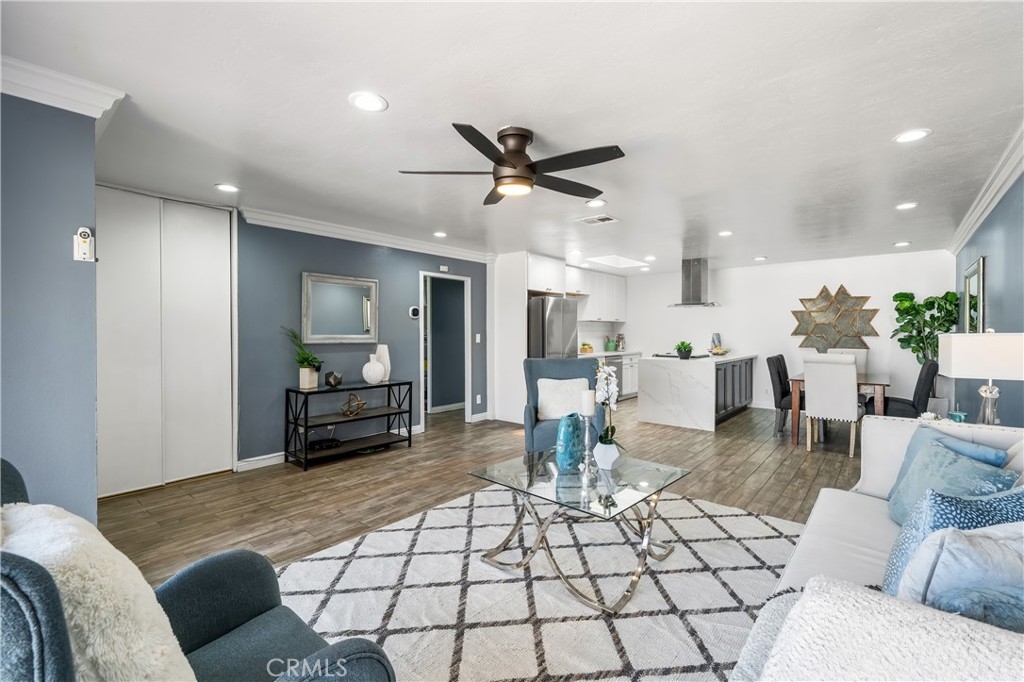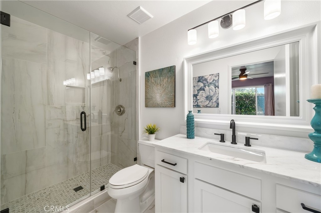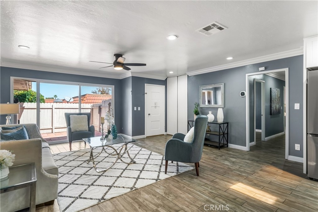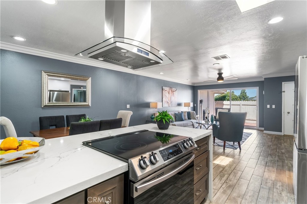 Discover this beautifully renovated 3-bedroom, 2-bathroom single-story townhome in Aliso Viejo, boasting a spacious, open-concept floor plan designed for modern living. The stunning new kitchen features quartz waterfall countertops, stylish two-tone cabinets, an island-mounted range hood with tempered glass and LED lighting, and a skylight that fills the space with natural light. The home offers a blend of elegant tile and luxury vinyl plank flooring throughout, complemented by retextured ceilings, crown molding, ceiling fans, and recessed lighting. Energy-efficient upgrades include new vinyl windows and sliding door, a smart thermostat, a brand-new HVAC system, and a new water heater. The remodeled bathrooms showcase quartz countertop vanities, large-format tile flooring, decorative tile shower floors, and frameless glass doors. Step outside to enjoy a private, enclosed patio perfect for relaxing or entertaining. Community amenities include two sparkling pools, a community center, and a nearby park with tennis courts. Conveniently located near shopping, dining, and entertainment options, this home is just 7.3 miles from the stunning shores of Laguna Beach with easy access to major freeways. Don’t miss the opportunity to own this exceptional townhome.