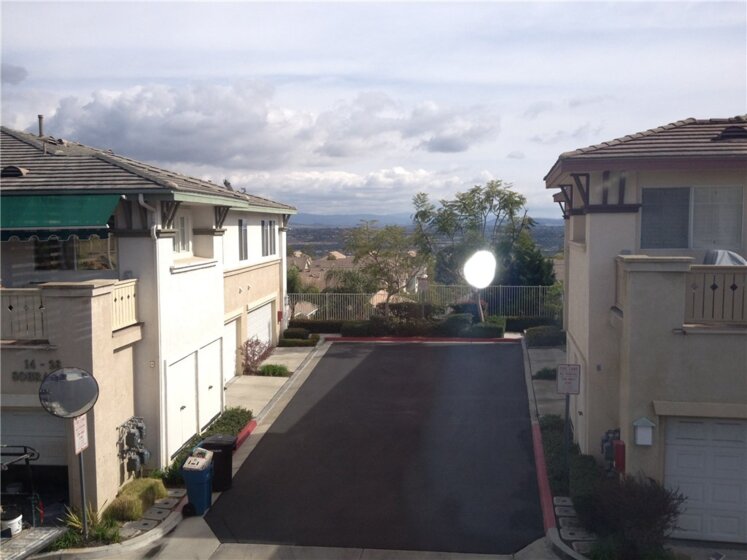 Wonderful Saddleback Mountains View. Upper carriage unit with laminated floors and carpet. Open great room concept with white tiled counter tops in kitchen that opens to living room and dining room space. Small deck off dining room. Two bedrooms with views! Wonderful master bath area with walk-in closet. Another full bath. The two car attached direct access garage is large with washer and dryer. This is a wonderful wonderful upper floor unit.