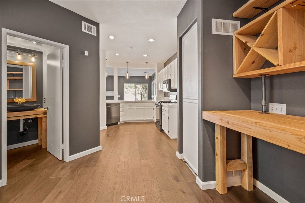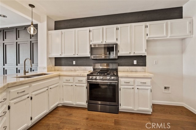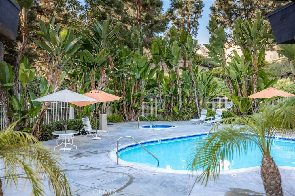 Gorgeous 3 bedroom, 2.5 bathroom, 2 story condo with city lights and mountain views in the gated community of Orleans in Aliso Viejo! Enjoy hardwood flooring, stone decor, an elegant fireplace, and private outdoor patio. The open kitchen features a spacious breakfast bar, white cabinetry, beautiful lighting, and stainless steel appliances. The primary bedroom offers a walk-in closet, dual sinks in the primary bathroom, and a shower-in-tub. Additional property highlights include the 2 car garage, community pool, and spa. Convenient to area schools, restaurants, major freeways, and The Toll Roads!