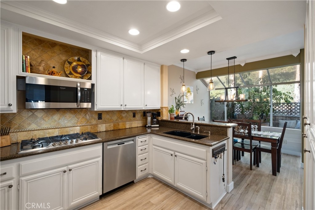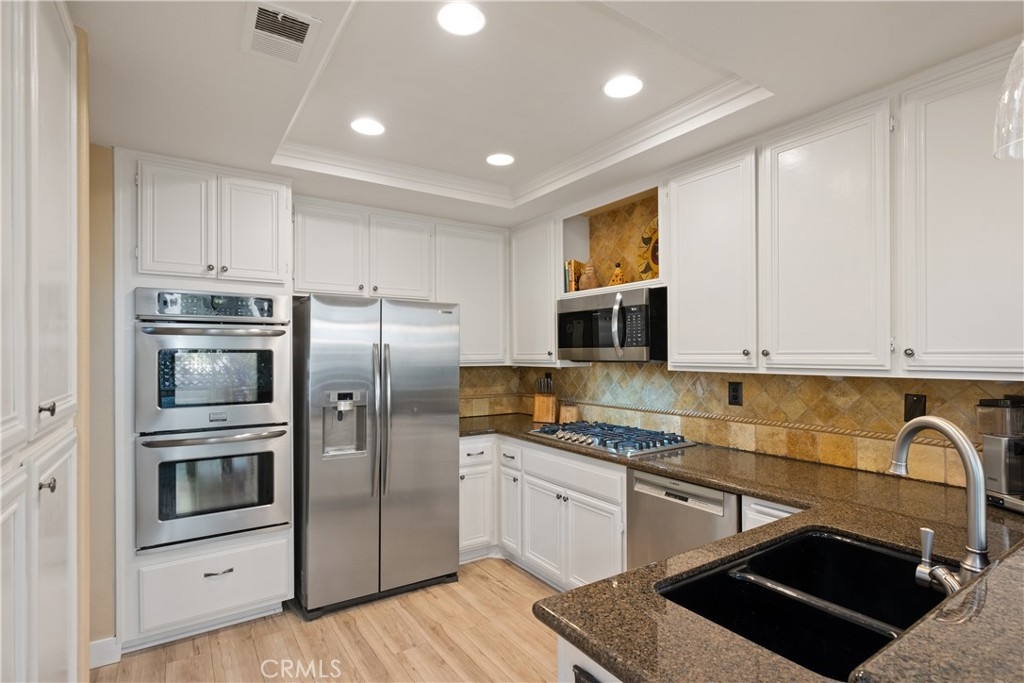 Welcome to this beautifully upgraded home in the highly sought-after gated community of Provence d'Aliso. This home features 3 bedrooms, 2.5 bathrooms plus a spacious loft, which would make for the perfect home office or can be converted into a 4th bedroom. Hardwood flooring throughout the main living spaces, and brand new vinyl flooring in the kitchen and bathrooms. The home is freshly painted with new window coverings, toilets, faucets, bathroom vanity and AC/heater. The kitchen features granite countertops, white shaker cabinets and top-of-the-line stainless steel appliances. The two car garage has built-ins that provide ample storage space, and an attic (with pull down stairs) provides an estimated 300sqft. of additional storage space. This home has a private entrance with a dedicated walkway, a serene patio that backs nature and only one shared wall. The community is perched above a wilderness reserve and is walking distance to Aliso Niguel High School and features great amenities including a pool, spa, clubhouse, tennis courts and walking trails.