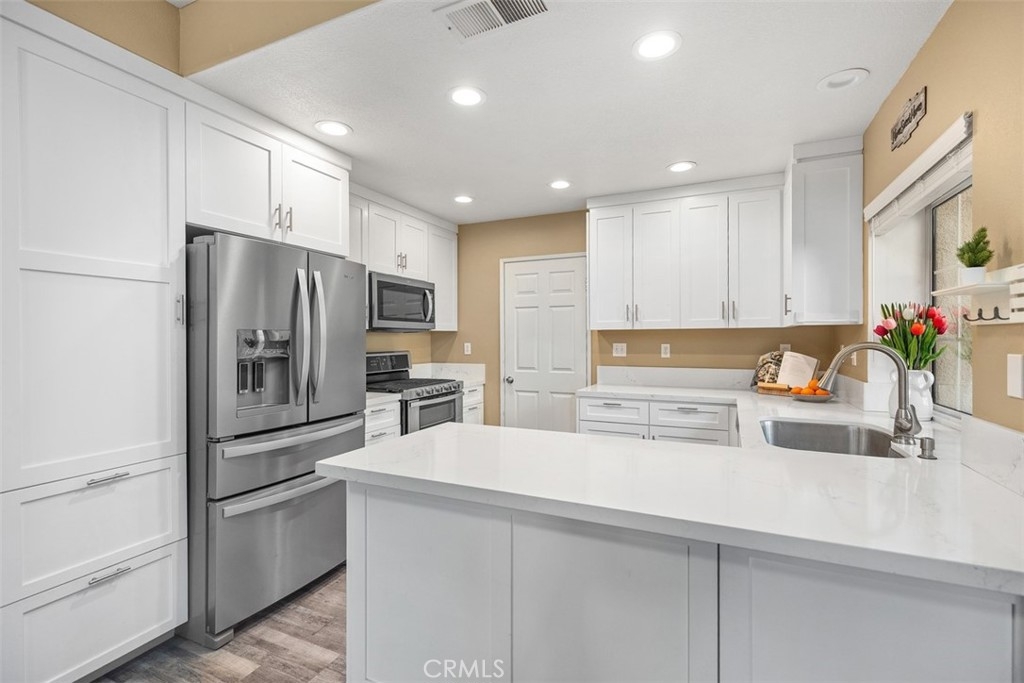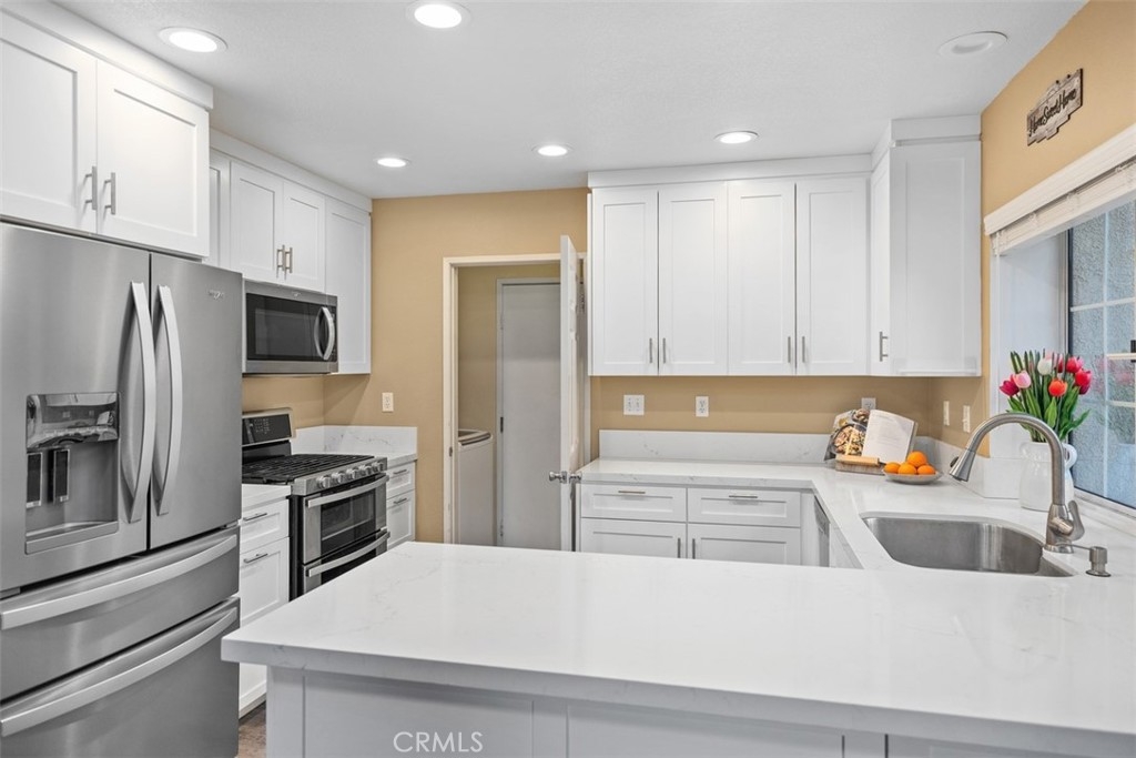 Welcome to Seacove Place, a beautifully updated 3-bedroom, 3 full bathroom residence that offers comfort, style, and convenience in one of the most desirable areas of the community. This first-time-on-the-market property features a light-filled downstairs, MAIN FLOOR bedroom/office, an open-concept kitchen (2021) that boasts white shaker cabinetry, quartz countertops, soft-close drawers, built-in recycling and trash drawer, and a 5-burner stove. The kitchen seamlessly flows into the spacious family room, creating an ideal space for entertaining. Upstairs, you’ll find two additional bedrooms and two full bathrooms, including a primary suite with soaring ceilings, ample closet space, and peaceful views of the greenbelt. Indoor-outdoor living is a breeze with a private enclosed patio that opens to a lush greenbelt away from busy streets. This perfect spot is ideal for relaxing or entertaining. Throughout the home, modern upgrades include recessed lighting, laminate wood flooring(2022), and RE-PIPED for peace of mind, an attached garage, an additional parking space (#109), and plenty of GUEST PARKING which was an upgrade option when the home was built. The community is beautifully landscaped and offers resort-style amenities, including a pool, spa, and HOA coverage for water and trash. With close proximity to shopping, dining, coffee shops, and just minutes from Laguna Beach. Along with easy access to the toll road, and freeways, this home seamlessly blends modern living with an unbeatable location.