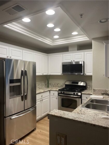 Welcome to the coveted, quiet, and serene community of Seagate Colony. This quaint 2 bed 2 bath home has been updated with wood laminate flooring, granite countertops and ceiling fans throughout. The living area features cove lighting and a lovely fireplace to create a peaceful atmosphere. Take time to relax in this resort-like community with 2 swimming pools, gym, greenbelt walking and biking trails right outside the complex. This unit has a spacious one car garage in addition to an assigned parking. This is easy living being close to freeways, toll roads, entertainment and shopping.