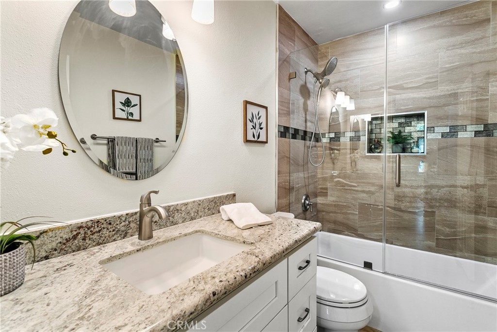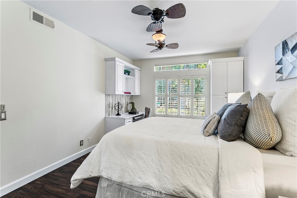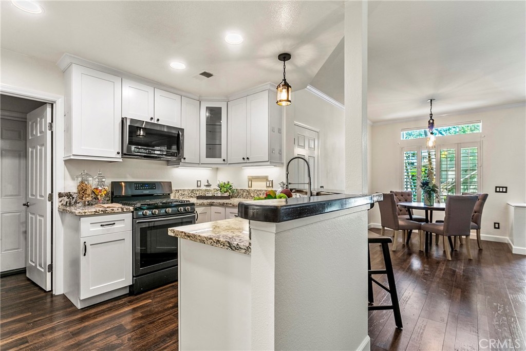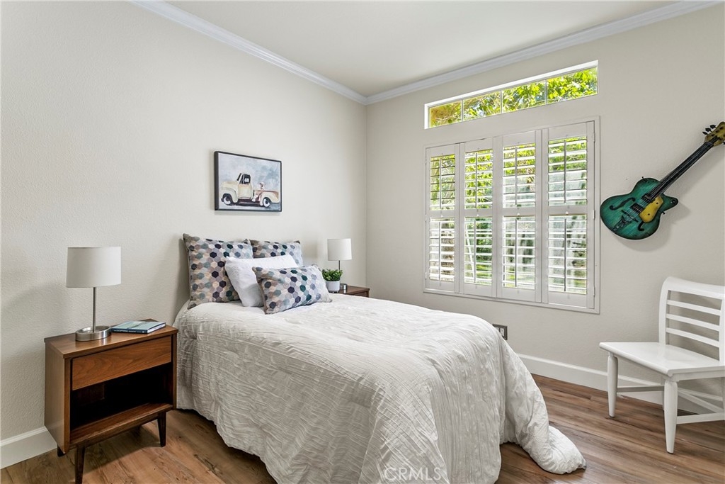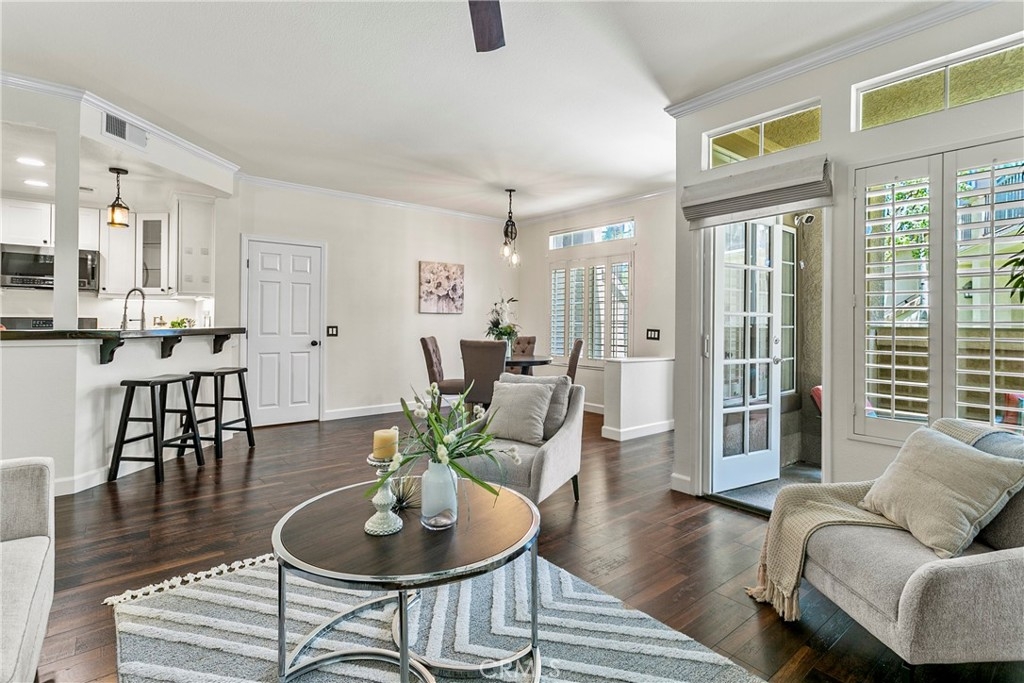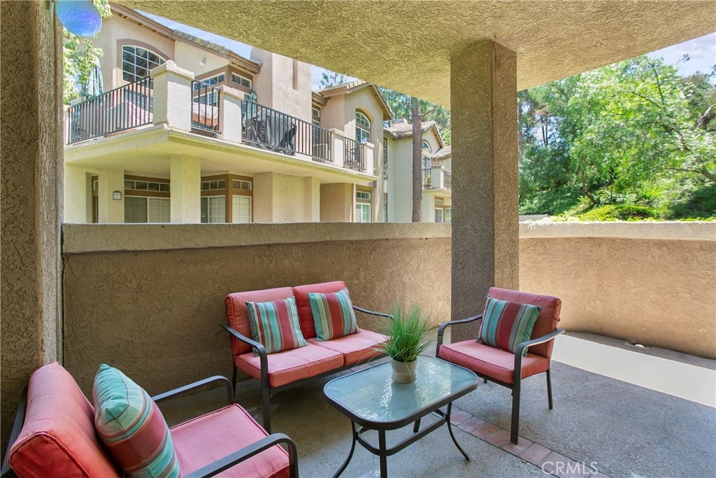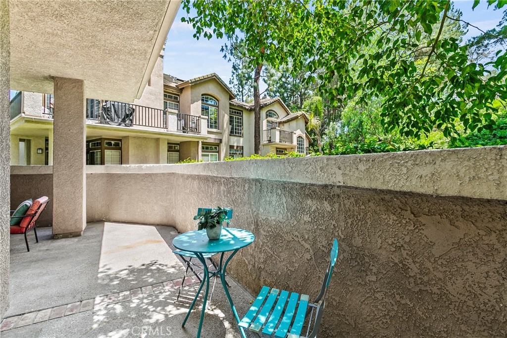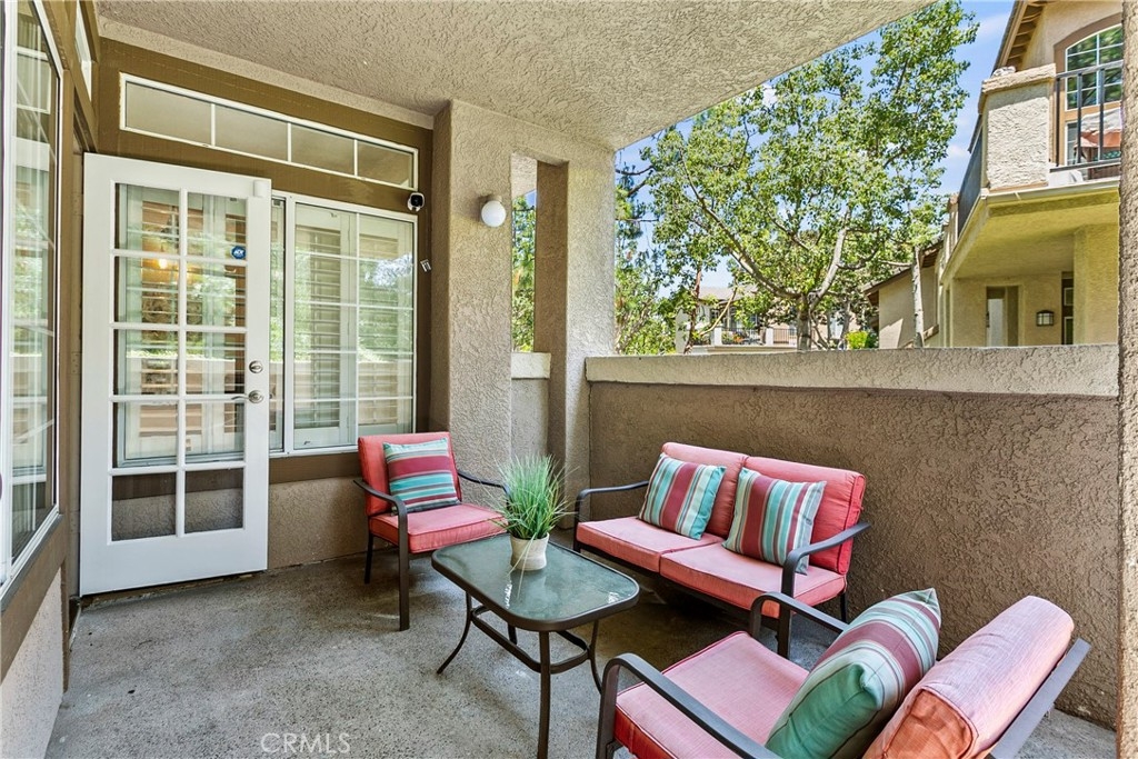 Gorgeous highly upgraded end-unit, and completely remodeled, single-level condo in The St. Tropez community! Owner has added Danmer plantation shutters throughout as well as Hunter Douglas Duette Panache shades in some areas, beautiful engineered wood flooring throughout, and new custom paint as well as new dimmable lighting and new six-panel doors. Remodeled primary bathroom boasts river glass frameless doors and new quartz counters, dual sinks, new mirrors. Second bathroom boasts beautiful "Alpine Snow" granite countertops Enjoy the completely new kitchen w new farmhouse sink, granite counters, chef's faucet, solid wood cabinetry, Samsung five-burner stove, Samsung microwave and Samsung fridge, new Frigidaire dishwasher; separate dining room. Enjoy the laundry room complete with washer and dryer... the upgrades are numerous and classy. Master bedroom boasts tons of built-ins for great storage as well as a built-in desk and lots of shelving. Nice roomy walk-in closet, too, in updated master bath area. Enjoy the charming outdoor patio area overlooking the greenbelt. Camera system installed as well as full alarm system. Roomy two-car garage and two parking spaces in driveway as well as tons of guest parking here! Community amenities include a pool and spa. Wonderful park next door to this neighborhood located with quick access to the 73 toll road and very close to Town Center. No Mello Roos and building was fully repiped with PEX! See this home today!