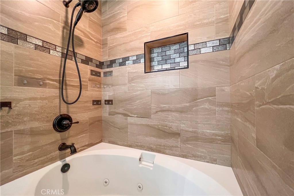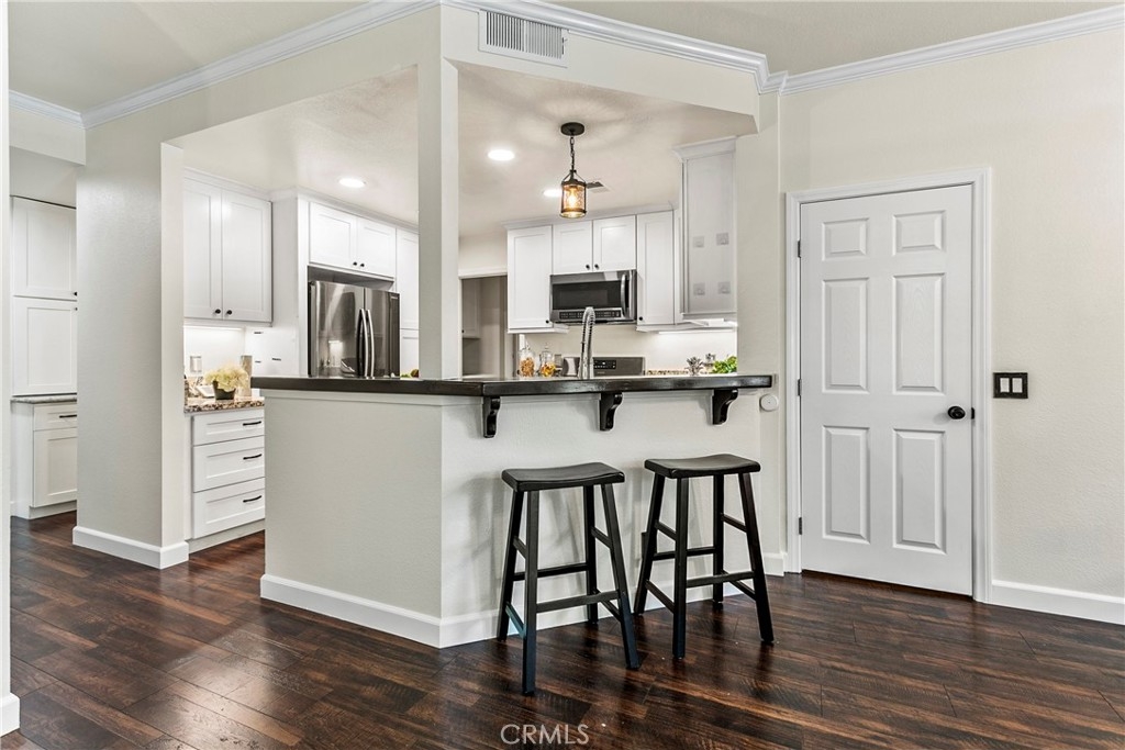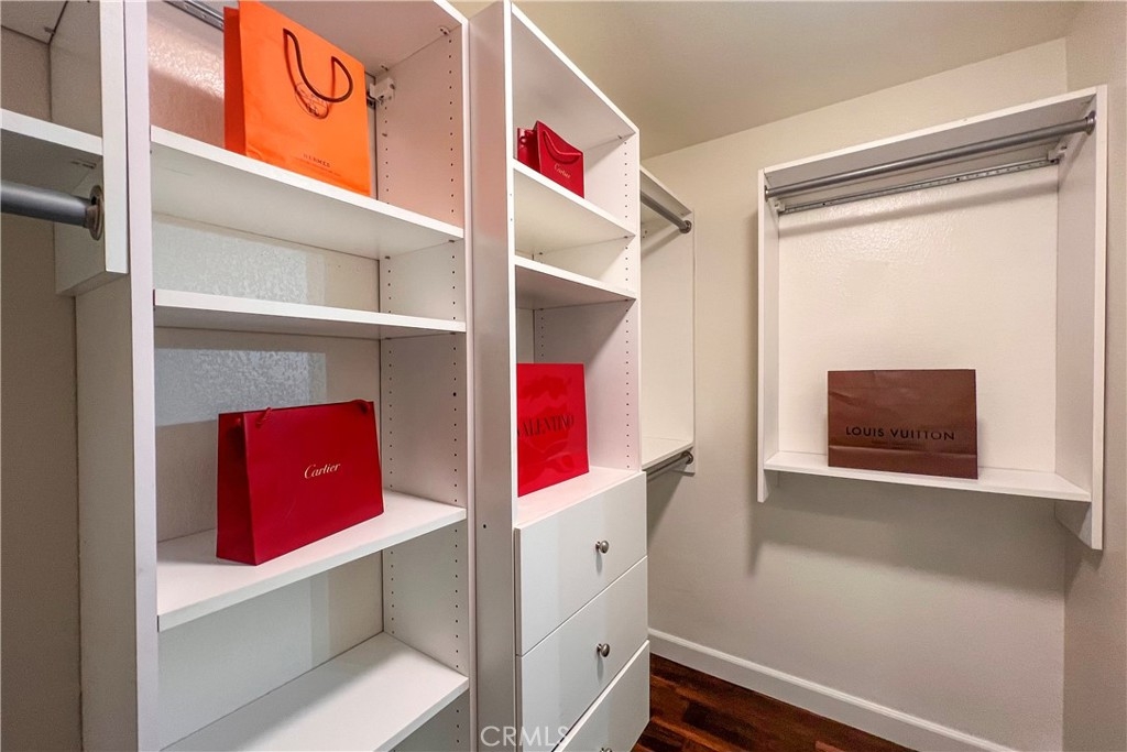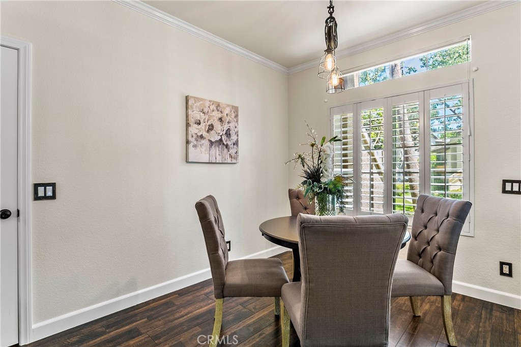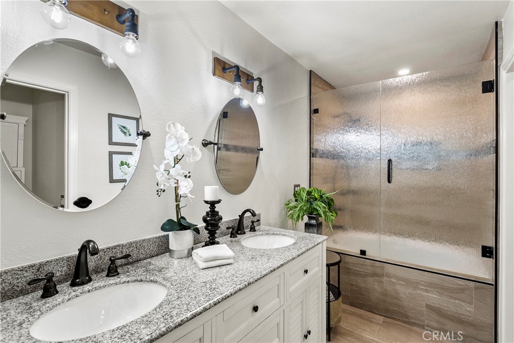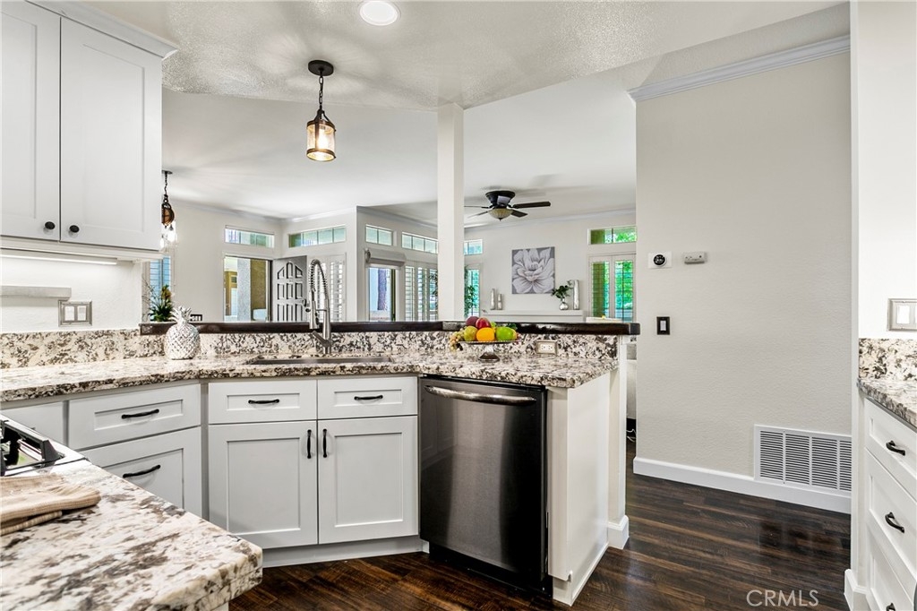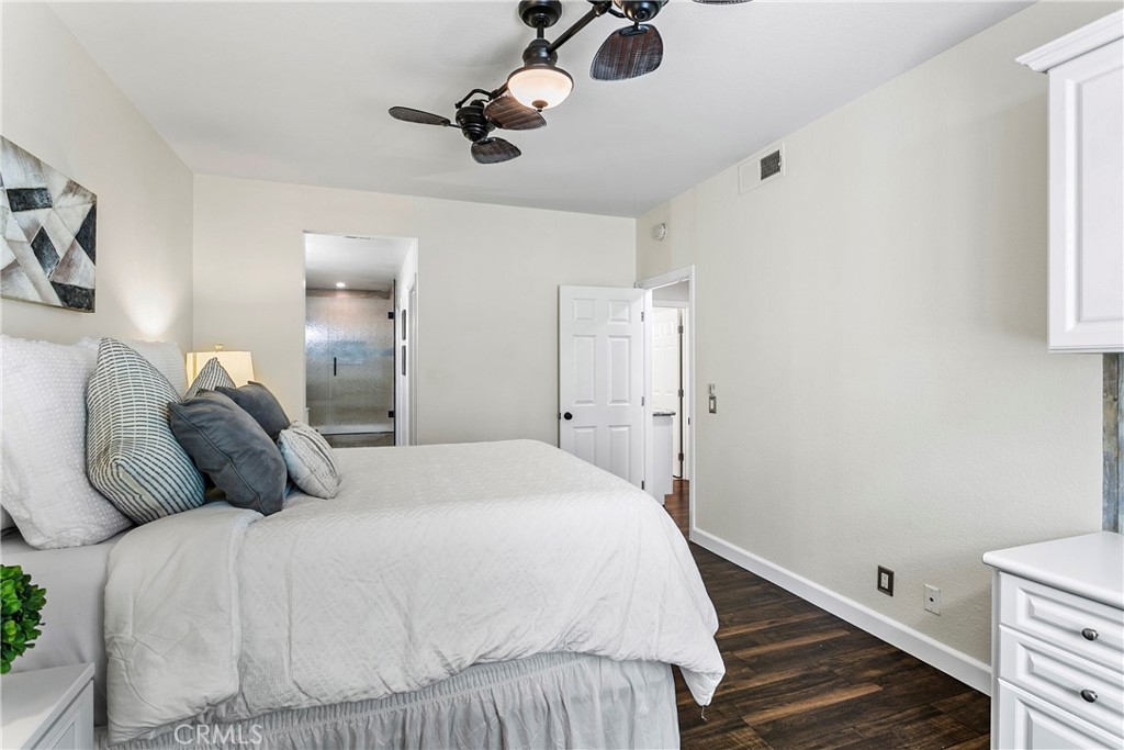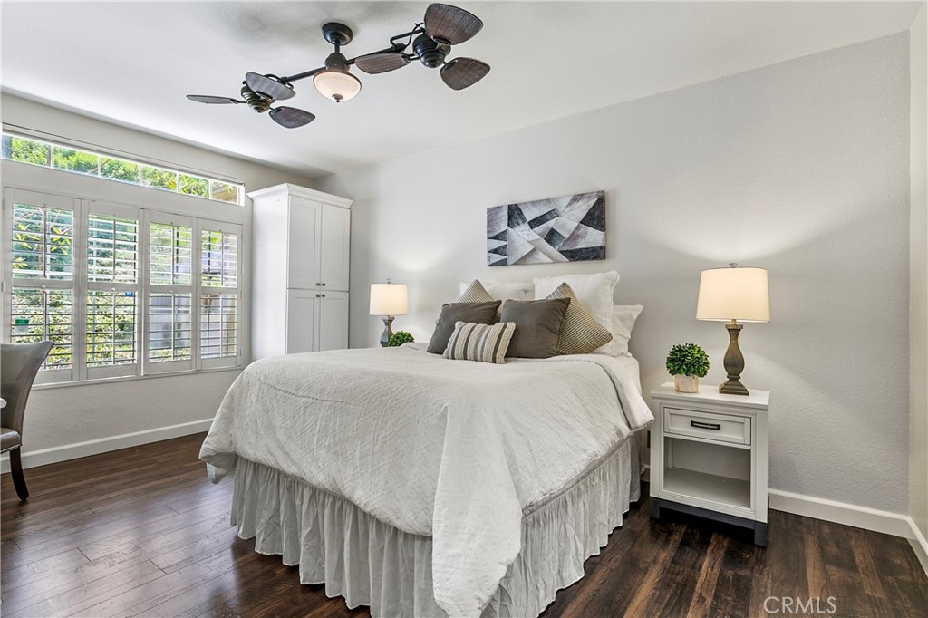 Gorgeous highly upgraded end-unit, and completely remodeled, single-level condo in The St. Tropez community! Owner has added Danmer plantation shutters throughout as well as Hunter Douglas Duette Panache shades in some areas, beautiful engineered wood flooring throughout, and new custom paint as well as new dimmable lighting and new six-panel doors. Remodeled primary bathroom boasts river glass frameless doors and new quartz counters, dual sinks, new mirrors. Second bathroom boasts beautiful "Alpine Snow" granite countertops Enjoy the completely new kitchen w new farmhouse sink, granite counters, chef's faucet, solid wood cabinetry, Samsung five-burner stove, Samsung microwave and Samsung fridge, new Frigidaire dishwasher; separate dining room. Enjoy the laundry room complete with washer and dryer... the upgrades are numerous and classy. Master bedroom boasts tons of built-ins for great storage as well as a built-in desk and lots of shelving. Nice roomy walk-in closet, too, in updated master bath area. Enjoy the charming outdoor patio area overlooking the greenbelt. Camera system installed as well as full alarm system. Roomy two-car garage and two parking spaces in driveway as well as tons of guest parking here! Community amenities include a pool and spa. Wonderful park next door to this neighborhood located with quick access to the 73 toll road and very close to Town Center. No Mello Roos and building was fully repiped with PEX! See this home today!
