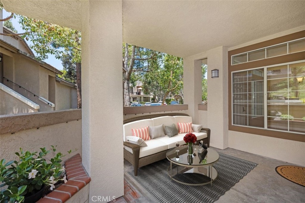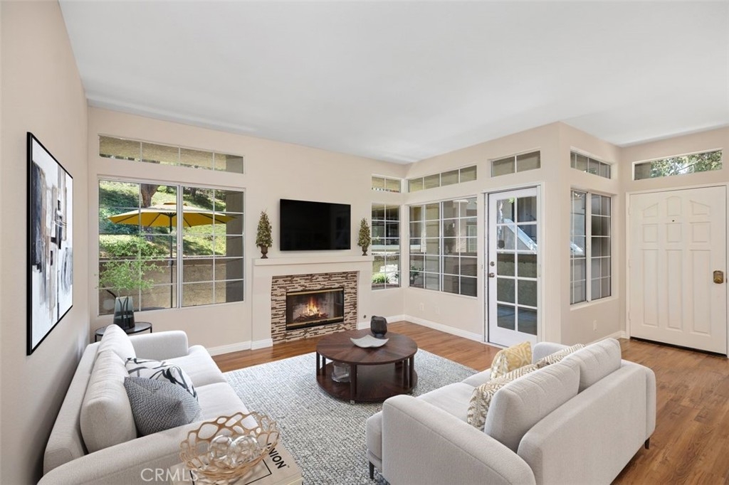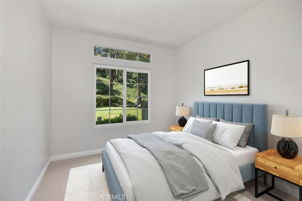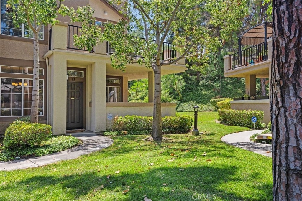 Charming single-level condominium located in the desirable St. Tropez Community of Aliso Viejo offers an extremely private location with serene greenbelt views. The corner unit boasts a wrap-around covered patio, perfect for enjoying the Southern California weather. Spacious living and dining areas are filled with natural light, highlighting the wood laminate flooring and neutral paint. The kitchen features granite counters with a glass tile backsplash and ample cabinets. This home includes two bedrooms, two bathrooms, and an inside laundry room for a full-size washer and dryer. The newly carpeted bedrooms provide a cozy retreat, including a large walk-in closet in the master bedroom. The attached two-car garage with epoxy coating and overhead storage offers convenient parking. The community pool and spa are just steps away, offering a perfect place to relax and unwind. Aliso Viejo Town Center, shopping, dining, entertainment and numerous parks are all nearby. Quick access to the 73 Toll Road and beautiful California beaches makes this location ideal. The St. Tropez complex is currently FHA and VA approved, and there are no Mello-Roos fees. This lovely home (which has been virtually staged) is a great opportunity to own a piece of Southern California's serene lifestyle.