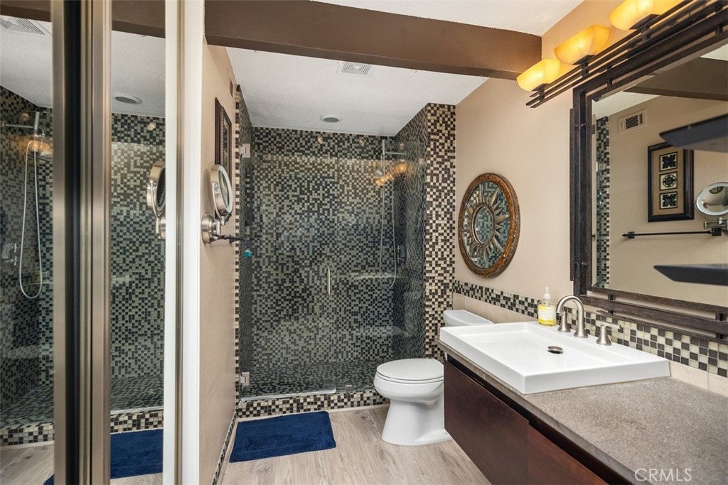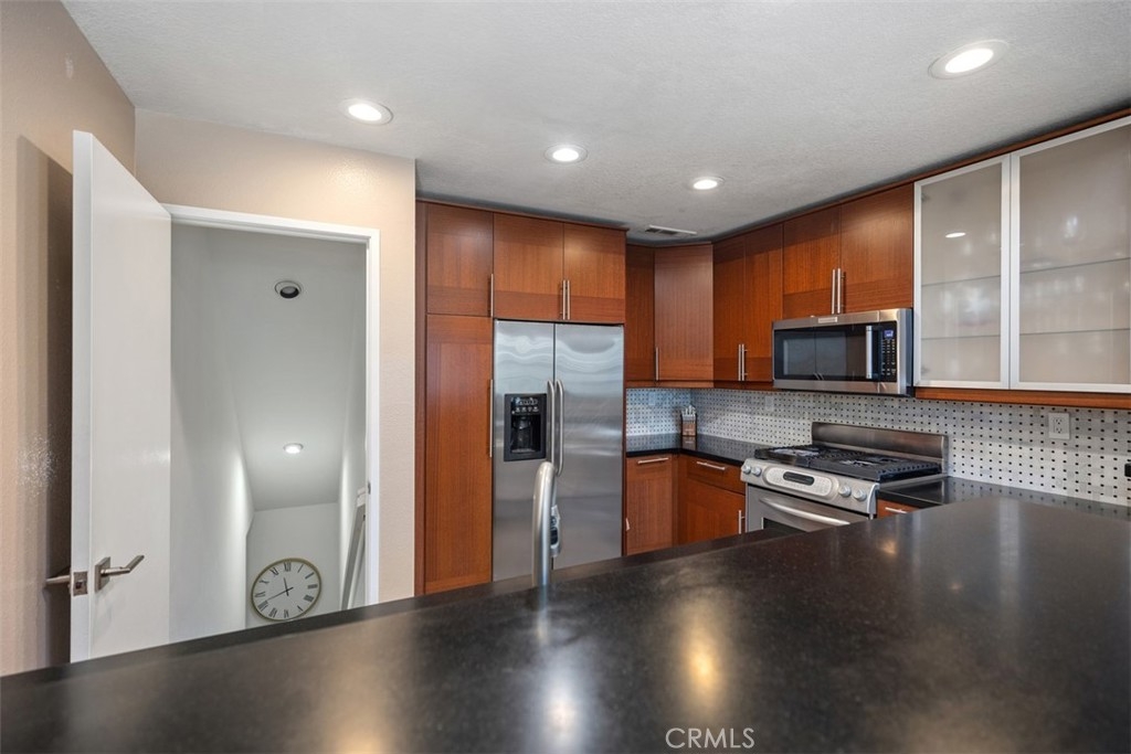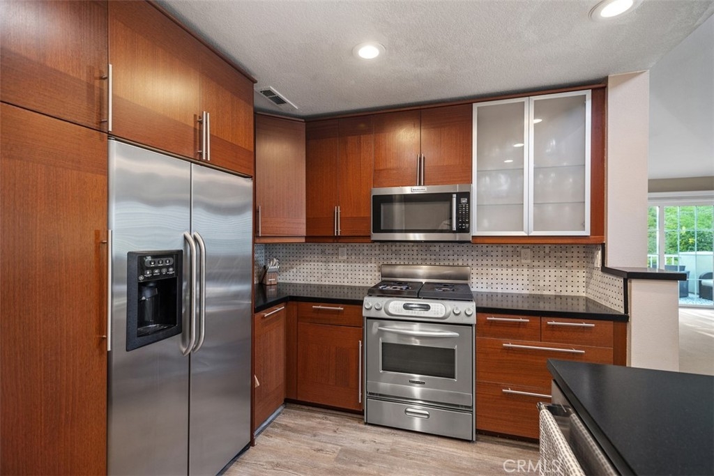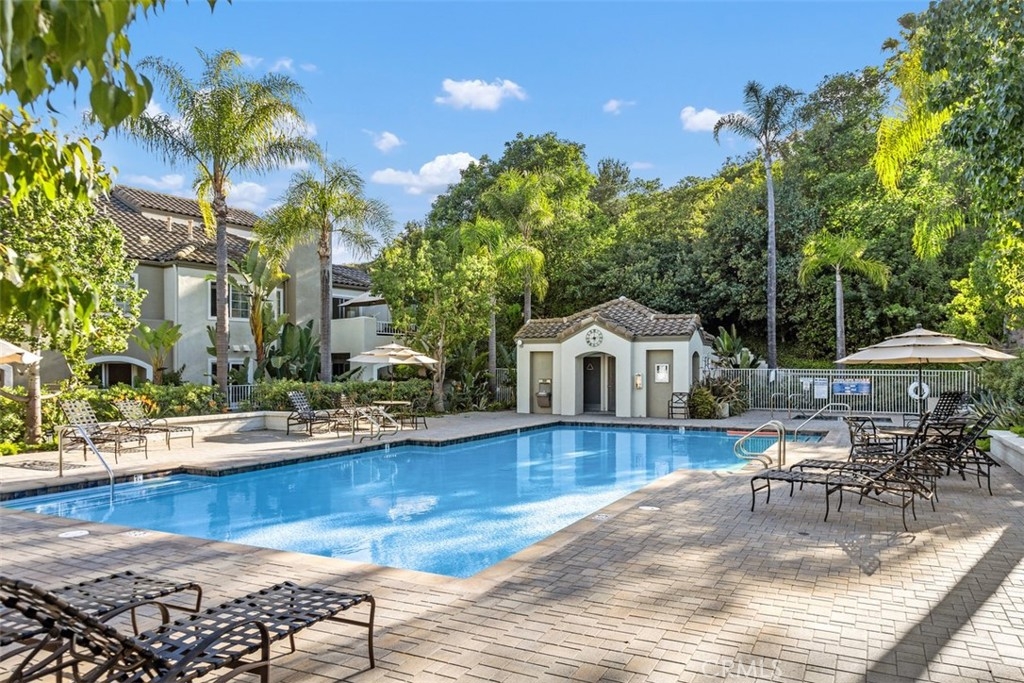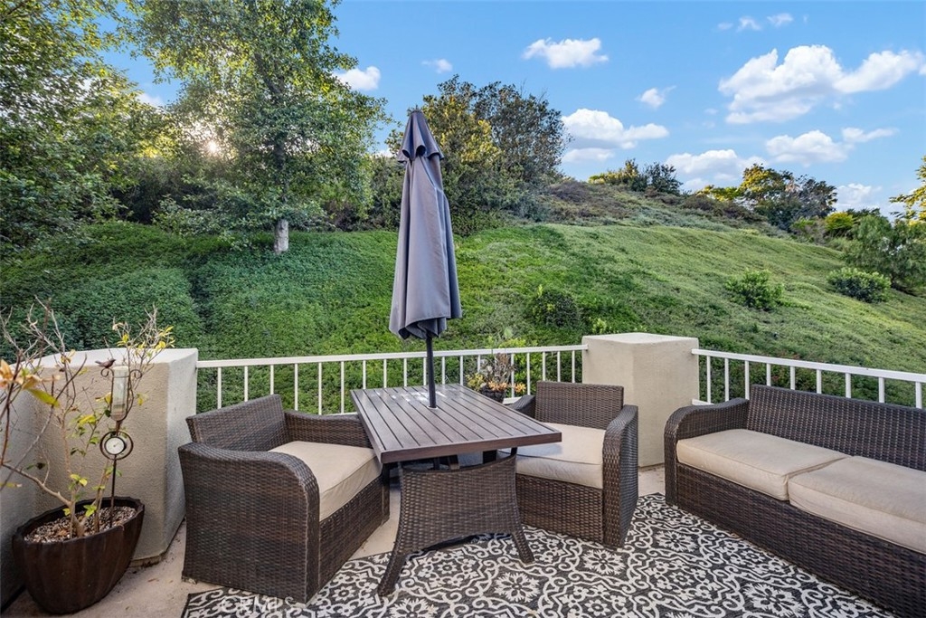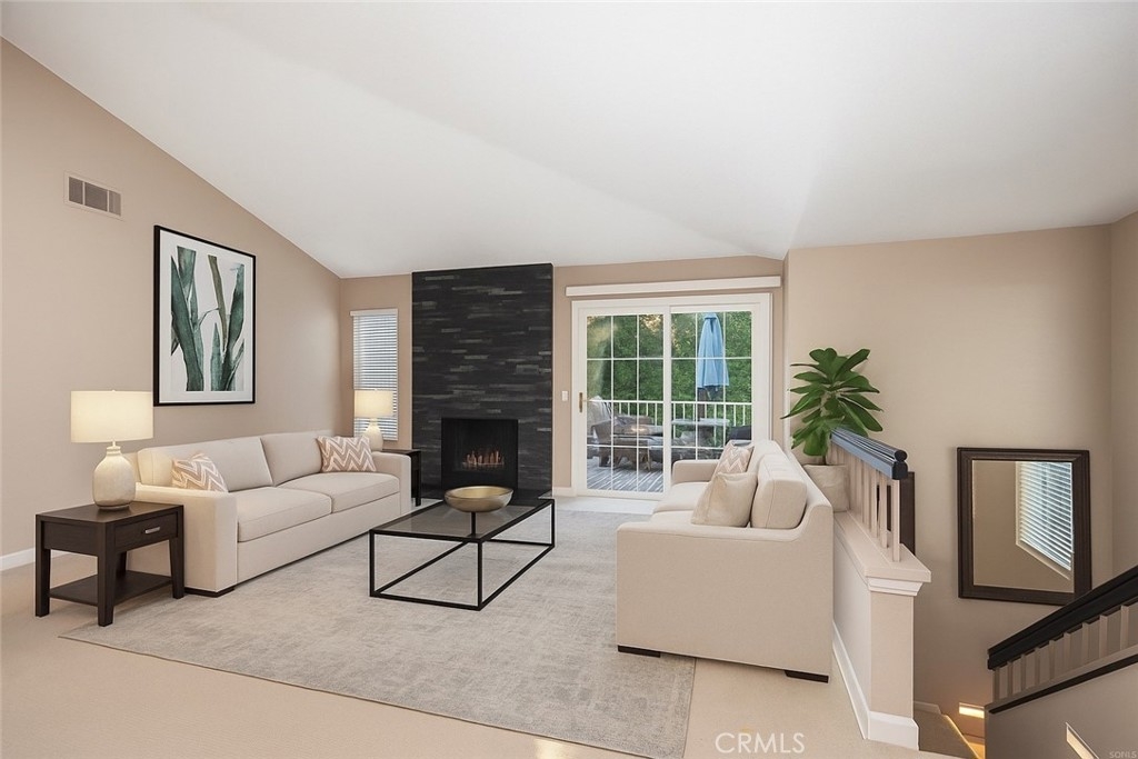 Beautiful corner unit in highly desirable Villas North, Aliso Viejo! This unique condo is one of the few in the community with amazing views of the green belt. Features include an open floor plan, a custom slate gas fireplace with fire glass, and wood-look vinyl flooring in the kitchen and bathrooms. Step out to a spacious private patio with tranquil views of trees and the hillside, perfect for relaxing! The kitchen offers honed granite countertops, stainless steel appliances, a new backsplash, and direct access to the oversized 2-car garage with laundry hook-ups and built-in storage. Recent upgrades include a new sliding patio door, dishwasher, microwave, garage door opener, faucets, garbage disposal, switches, plugs, door handles, and a stylish sliding barn door for the primary bathroom. The primary suite includes a walk-in closet and an en-suite bathroom with a beautiful glass mosaic tile shower. A third-story loft provides a flexible space ideal for a home office, guest room, or additional living area. Located just down the road from Aliso Viejo Middle School and close to parks, hiking trails, and Aliso Town Center with shopping, dining, and entertainment. Don’t miss this rare opportunity to own a move-in ready home in one of Aliso Viejo’s most desirable neighborhoods!