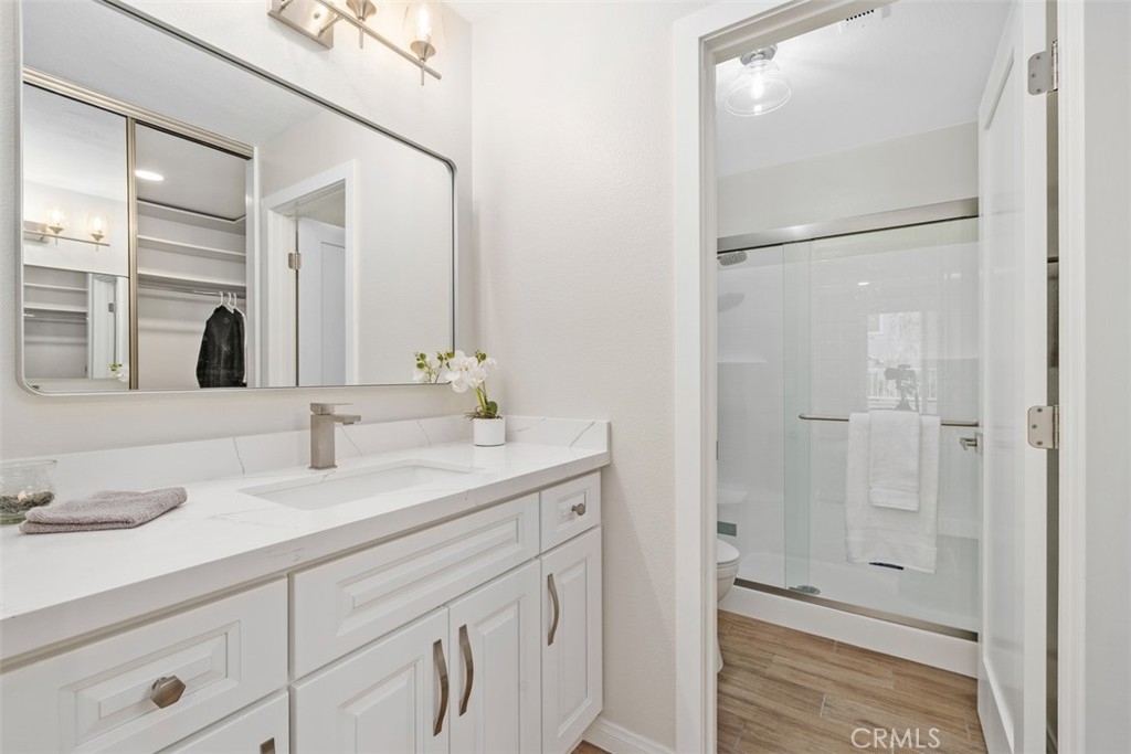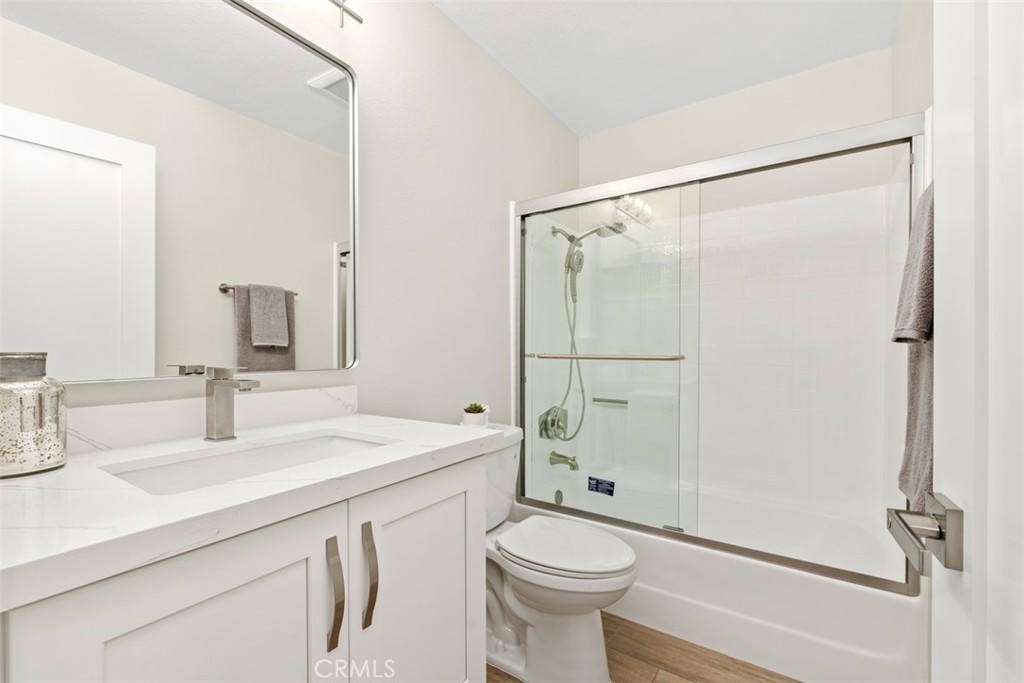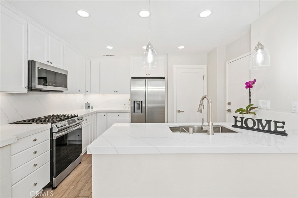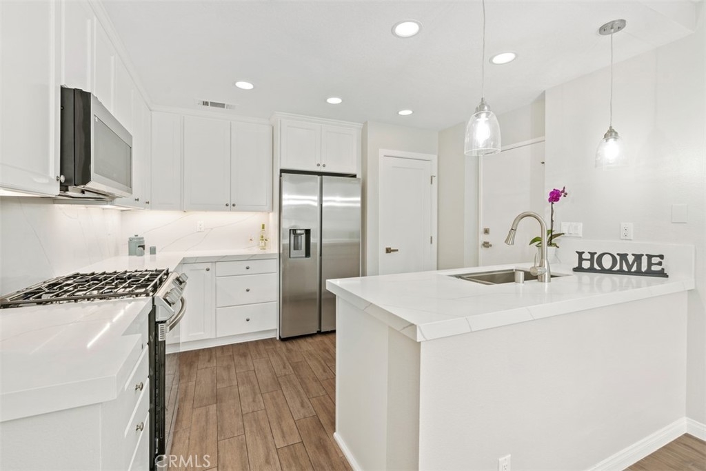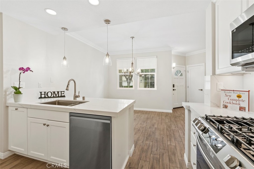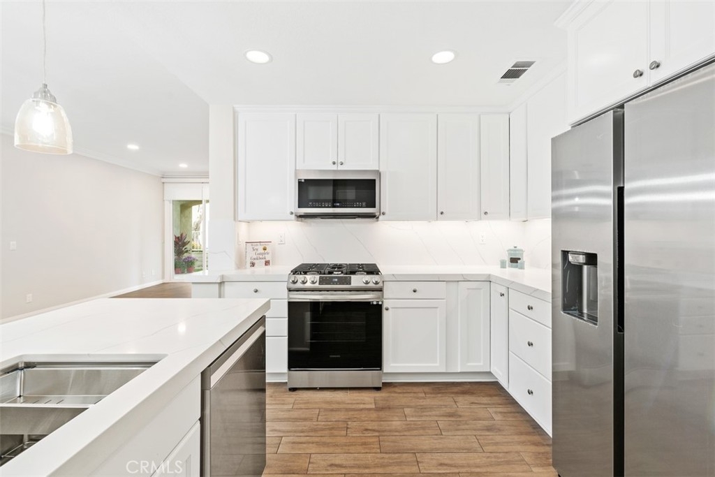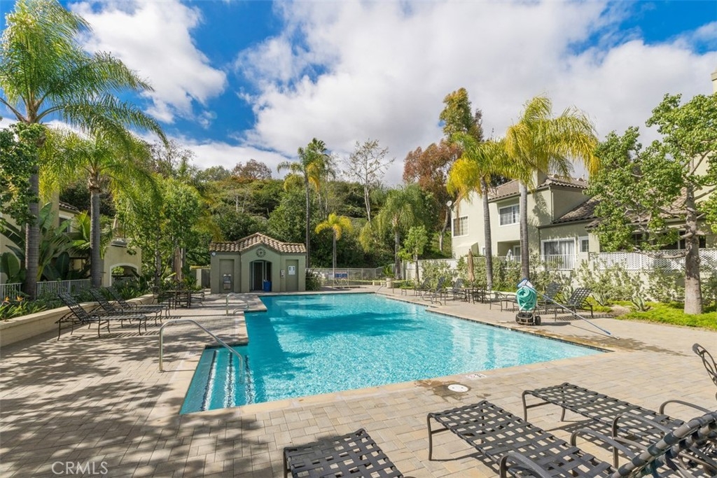 ABSOLUTELY BEAUTIFUL NEWLY REMODELED home in the highly desirable Villas North tract. The Villas have a LOW property tax rate, NO Mello Roos plus it is a Quiet & Serene tract with an Open feeling community. This tract is not crammed in! Discover the carefree lifestyle that you have been seeking in this extensively upgraded, TURNKEY home. When you open the front door, you will SEE each UPGRADE is QUALITY workmanship. A nice surprise is the entry closet! Not your every day coat closet. On chilly winter nights cozy up to the warmth of the designer stone fireplace with a custom mantle. The Living room has crown molding and wood-look TILE flooring. The home is freshly painted with VINYL windows throughout. The Living Room sliding glass doors with CUSTOM window coverings, open to a peaceful and private COVERED PATIO and a low maintenance yard. And a SECOND patio outside the Master Bedroom! A wonderful place to entertain! All windows have CUSTOM shade coverings. Enjoy QUARTZ counters throughout the kitchen and baths. Recessed lighting in all rooms. The Chef's style kitchen has NEW stainless steel Samsung appliances- 5 burner Gas Stove /Oven, Microwave, New Refrigerator, and stainless steel sink with a cutting board. In the hallway is extra storage with an abundance or linen and storage cabinets. Mirrored wardrobe sliding doors enhance the closets in the secondary bedroom and the Master Ensuite. Both bedrooms have new plush carpeting. The hall bath has a resurfaced bathtub with a shower, new fixtures and a new quartz vanity countertop. The Master bath has a resurfaced walk-in shower, quartz vanity countertop and new hardware. There is a convenient 1 car DIRECT ACCESS GARAGE with an EPOXY floor, Washer/Dryer hookups plus a NEW roll up door and opener. Also, you will have an ASSIGNED parking space #9-right out front! This quiet interior location is moments from The Villas large pool and spa, community dog parks are just across the street, and Aliso & Wood Canyon Wilderness Park is nearby. Award-winning schools, shopping centers, theaters, business parks, trails, restaurants are nearby. You will be near the 73 Toll Rd and the 133 to the 405 OR go to the Beach! This tract was FHA approved. (Check with your lender). VIDEO LINK***https://tours.previewfirst.com/ml/131714****You can be the first to ENJOY this spectacular home!