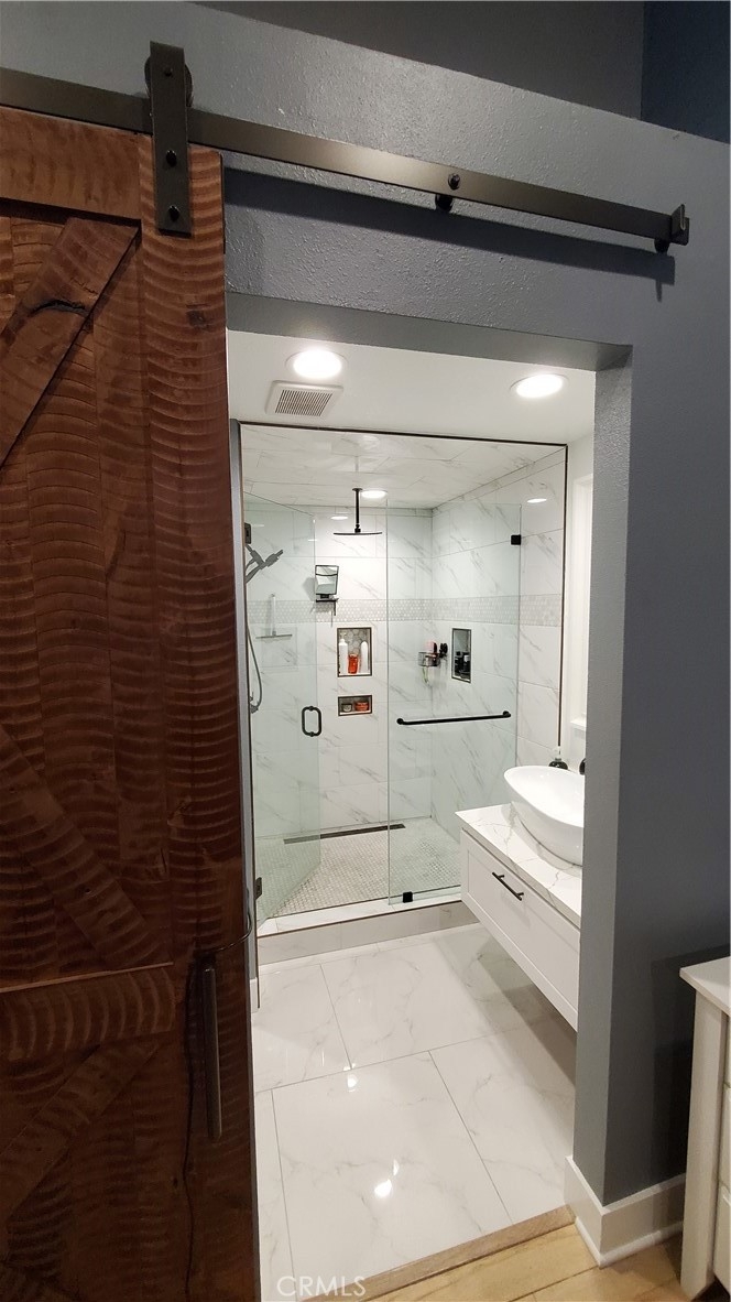 This completely upgraded smart home is tucked away in a quiet hillside community in Aliso Viejo across from a beautiful set of walking trails and a small park with designated pet play areas. Upon entering the unit, you are greeted by a warmly welcoming foyer with direct access to a spacious single car garage. As you ascend the first set of steps on your way to the living area, you will enjoy the view of a gorgeous stone accent wall with warmly lit foot lighting. After reaching the top of the stairs you will be overcome with the openness of the living space, and stunning modern appeal. The kitchen has been completely upgraded with spacious sturdy soft-close white shaker cabinets. This home boasts bright wood-plank tile, black stainless-steel appliances that will appeal to the top-chef in you, while ensuring ease of cleaning. The Brazilian Teak countertop island seats up to 4 comfortably and serves as the perfect focal point of entertainment with a full wine rack built in. As you dine, you have full open view of a cozy living space with upgraded oak mantle above the fireplace that supports ample space for all of your entertainment devices. High vaulted ceilings help create a large open feel, perfectly paired with white plantation shutters that allow an abundance of natural light. A large sliding glass door with white shutters separates the living area from a gorgeous out-side patio with a great view of the surrounding hillside and quiet community. For those working from home, a cozy yet functional small office has been equipped to adequately accommodate single-occupancy workspace with room for up to 2 monitors and sufficient desk space. The completely upgraded guest bedroom has a view of the surrounding hillside. The laundry with its venetian style, has designer tiles from floor to ceiling. The shower/tub combination features steel sliders with curvature to optimize space. As you walk into the master bedroom, your eyes will be drawn immediately to the cape-cod style accent backdrop and the barn-door slider separating the en-suite bath. This room features an enhanced view of the hillside that floods the room with natural light. The expansive wall space has been upgraded to support entertainment of all sorts. The en-suite bathroom features a large walk-in shower with floor-to-ceiling glass and floor to ceiling tile. The toilet is isolated in a private area complete with separate fan control.
