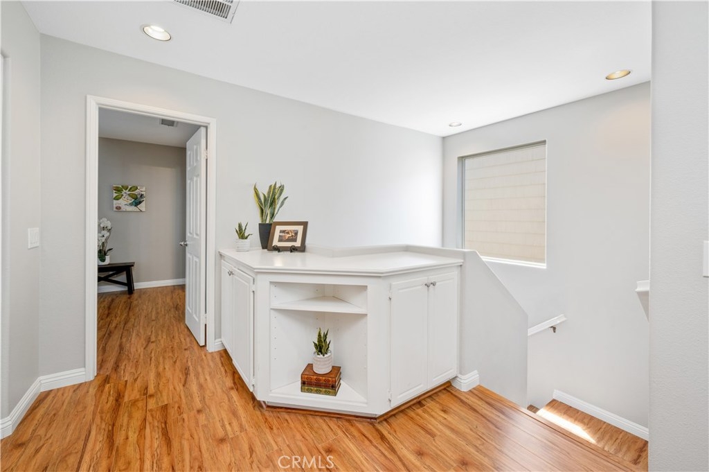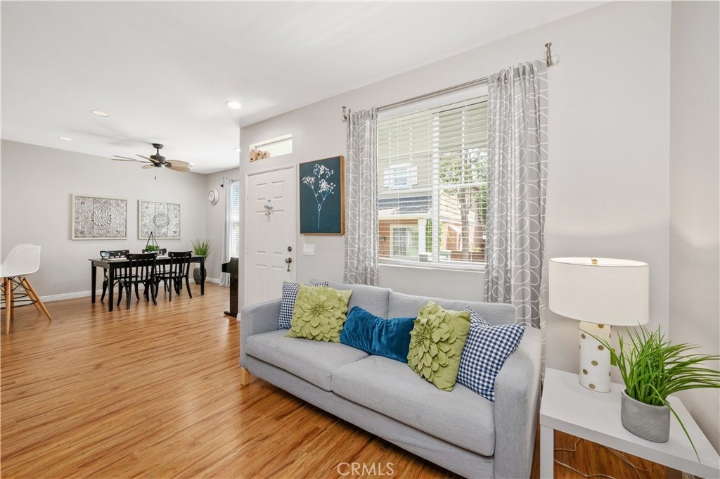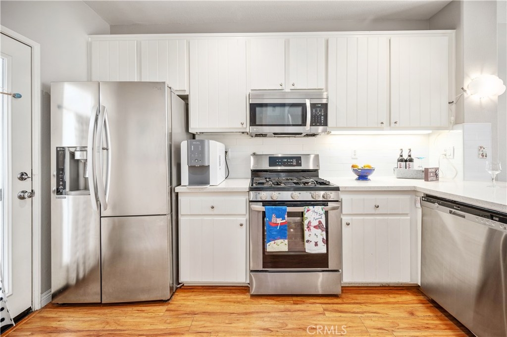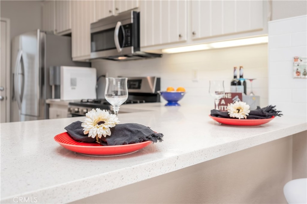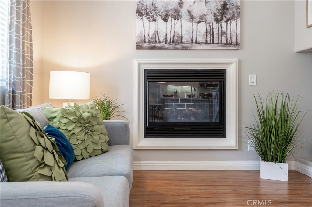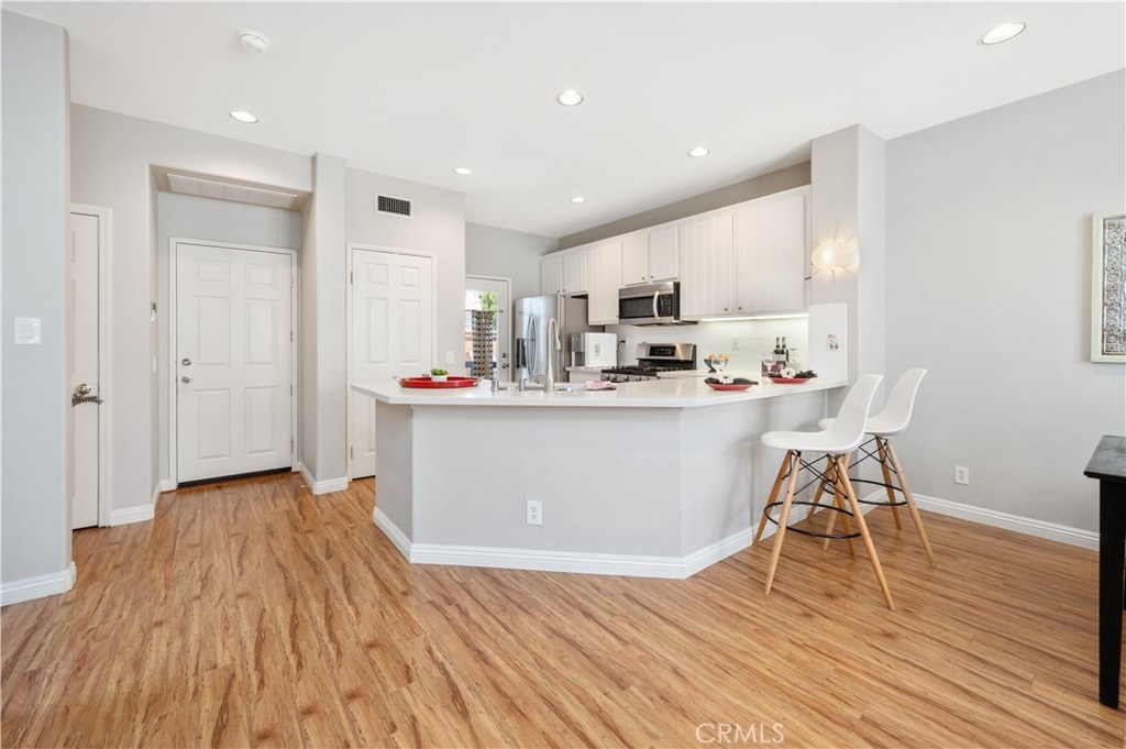DETACHED home, end unit with a stunning kitchen, a front porch & secondary outdoor back patio yard perfect for a BBQ and relaxation. Interested? That's fantastic! This floor plan is a perfect mixture of relaxing & entertaining w/high ceilings, recessed lighting, neutral "greige" palate & white woodwork, wide baseboards & wood laminate flooring on both levels. The kitchen boasts white beaded panel cabinetry w/brushed nickel accents, spacious pantry, full subway tile back splash, quartz counter tops, stainless steel appliances & deep stainless sink w/high arch goose-neck faucet. The extended breakfast bar is perfect for casual dining or conversation. Other downstairs features include; electric gas starter fireplace, media nook, 2 inch blinds, ceiling fan & half bath w/pedestal sink & additional storage closet. The upstairs private master suite has a large walk in closet, luxurious bath w/separate soaking tub & stand up shower w/stainless & clear glass enclosure & two sink vanity. The laundry is upstairs as well as the 2 spacious secondary bedrooms w/a Jack and Jill bath & two sink vanity. This home has newer APEX piping as well. Short stroll to the HOA pool & close proximity to many parks, excellent schools & the Aliso Viejo Town Center. This home has so much to offer & is a must see!