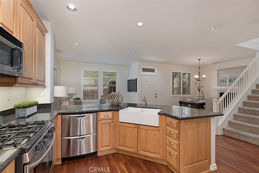 Bluff Cove is nestled in the sought out community of Twelve Picket Lane. Enjoy a nice relaxing evening on your covered front porch. This 3 bedroom 2 bath home has an open floor plan, great for families and entertaining. The living room has beautiful cherry hardwood floors and a welcoming fireplace. The kitchen is complete with maple cabinetry, stainless steel appliances, a 6 burner gas range, a farmhouse sink, granite countertops, a breakfast bar and a nice sized pantry. You'll find plantations shutters throughout the home. Downstairs there's a 1/2 bath, storage area and direct access to the 2 car garage. The master has an en-suite bathroom with dual sinks and a huge walk in closet. The 2 guest bedrooms are nice sized with a connecting bath with dual vanity, shower and tub. Washer and Dryer are included in the upstairs laundry! Enjoy a nice summer day in the HOA pool and spa. This home is located near theaters, shopping, restaurants, The Toll Road, freeways and AWARD WINNING schools. Don't miss out on this fabulous home!