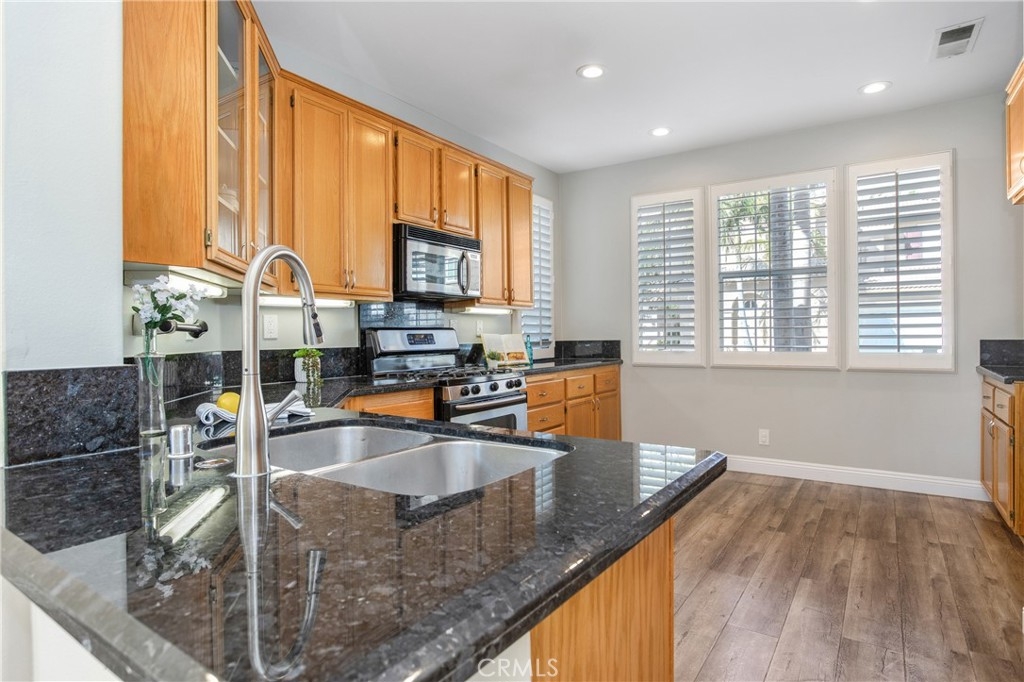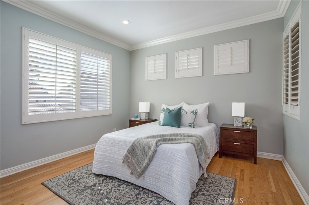 22 Halcyon is located in the highly desirable gated community of the Village Cottages. This 3 bedroom detached home has so many great features! The open floor plan downstairs has newer luxury vinyl laminate flooring, an eating area in the kitchen, granite counters in the kitchen, a dining area that leads to the pavered backyard and a living room with a fireplace and coved entertainment area built in - it even includes the TV!! The ceilings are very high in the living room to let in lots of natural light. Plantation Shutters and Crown Molding throughout too! Upstairs you will find oak flooring that leads to 3 bedrooms. One of the rooms has glass doors that would make it a perfect office for those that may be working from home. The master bedroom is very large also with high ceilings and a walk in closet. The master bathroom has two separate vanities, a free standing shower and seperate large bathtub! The secondary bathoom upstairs has dual sinks and there is also a laundry room upstairs. This home was also repiped a few years ago! You will love the easy care backyard with brick pavers and astroturf. The orange tree is also great! There is a community pool, a short walk to Oak Park, Canyon Vista Elementary and Soka University. It's also a very short drive to the toll road.