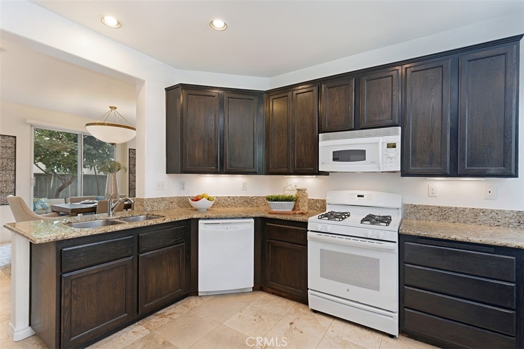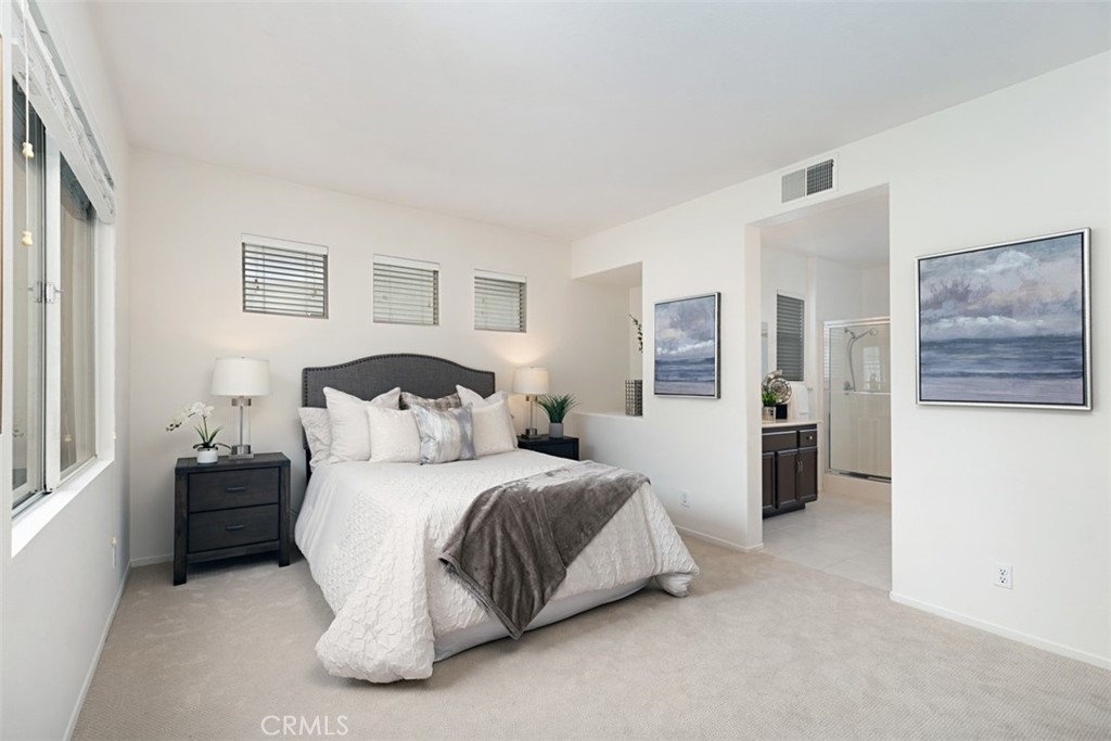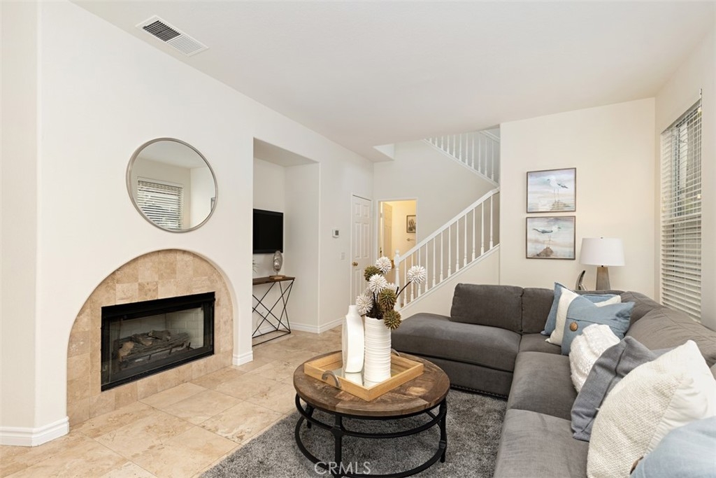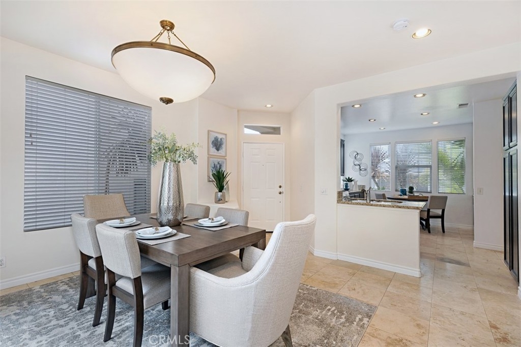 4 Allaire is a 3-bedroom detached home in the highly desirable community of Village Cottages. As you pass through the portico and in through the front door, you will see a bright and open floor plan united by travertine flooring throughout the downstairs. The eat-in kitchen opens to the dining room, and has granite counters and recessed lighting. The dining room, in turn, opens to both the kitchen and the living room, has both recessed lighting and a designer bowl chandelier, and has a cove space perfect for storage, working at home, or a homework area. The living room has plenty of seating area and windows that let in a ton of light. The light master bedroom has new carpet, a walk-in closet, and an en suite bathroom. The master bathroom includes separate vanity areas, a separate tub and shower, recessed lighting, and tile floors. The secondary upstairs bathroom has dual sinks with plenty of room to serve the two secondary bedrooms. Both secondary bedrooms have new carpet and offer a blank canvas for making them your own. The full-sized laundry room upstairs includes a full utility sink and plenty of cabinetry. Rounding out the home is a nice-sized backyard with room for relaxing or entertaining. 4 Allaire is in Village Cottages, a highly sought-after gated enclave that has a community pool, and is a short walk to Oak Park, Canyon Vista Elementary, and Soka University.
