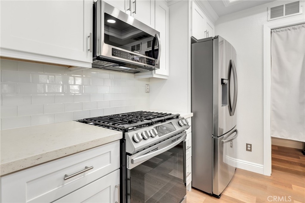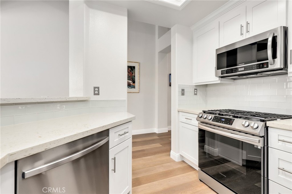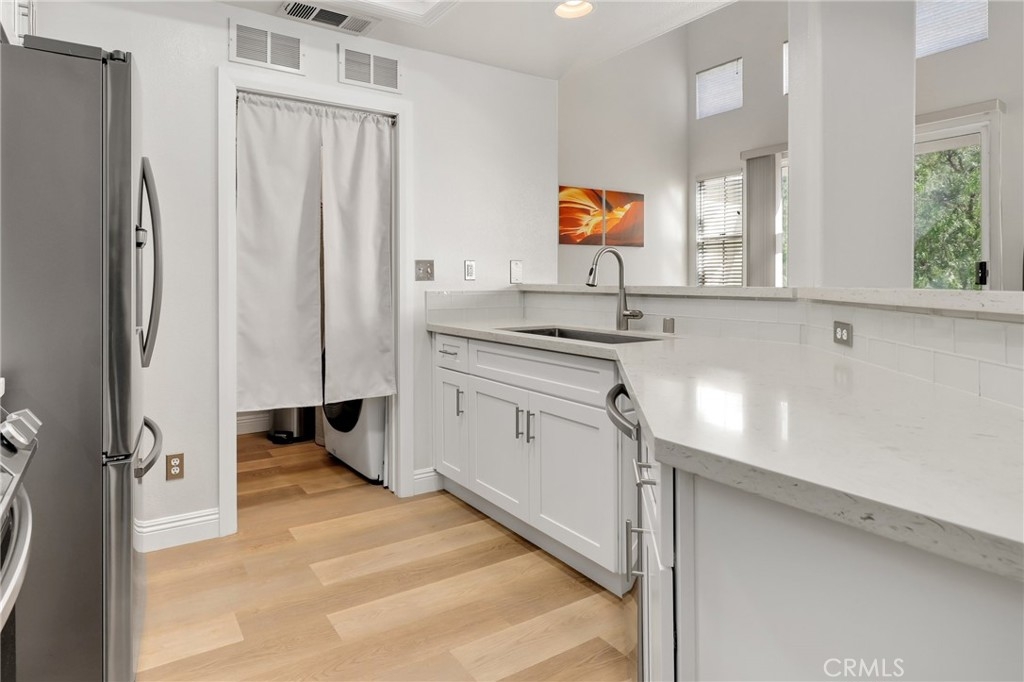 Welcome to Aliso Viejo's Vistas Community, a premier neighborhood perched on a hilltop with great views of the Saddleback Mountains, access to riding/hiking trails, and much more. 4 Woodcrest Lane #324 is 1 bedroom, 1 bath, plus LOFT, top level home that has been generously updated thru-out. Gorgeous wood look flooring welcomes you in, cool designer paint adorns the interior and the high ceilings are filled with tons of natural sunlight throughout the day. At the entry is the bedroom with an en-suite bathroom that has been totally remodeled. Stone countertops, newer vanity, tiled flooring & shower walls, upgraded light fixtures and a modern barn door glass entry into the shower tops it off. Upstairs you have the loft that is currently being used a bedroom which can be also be used as an office. The kitchen features quartz countertops, tiled ceramic backsplash, shaker style cabinets, and a stainless steel appliance package (freestanding range, microwave, refrigerator and dishwasher). And here's the best part, the washer/dryer is inside the unit in the pantry/storage area right off the kitchen! No need to go outside to do laundry! Another perk of this home is the private location on the backside of 4 Woodcrest. You have a private balcony off the living area where you can enjoy your morning coffee or just sit and relax. This home comes with a 1 car garage, 1 designated parking space and 1 guest parking pass. HOA amenities include pool, spa, exercise room & more. Don't let this great opportunity pass you by! Come and see it soon before its too late.
