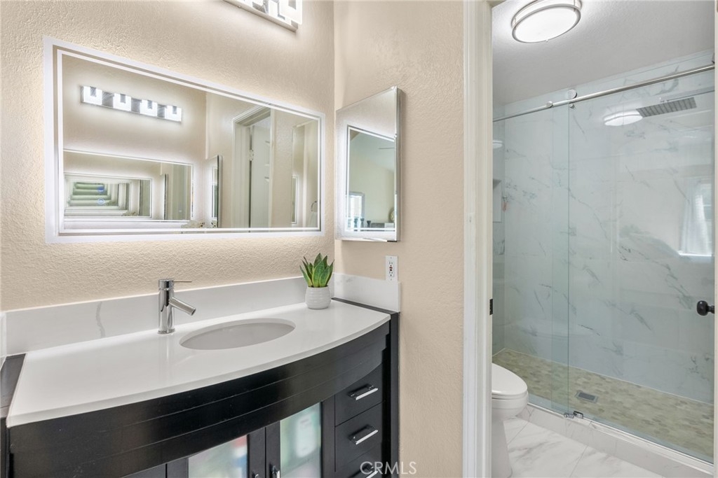 BEAUTIFUL TURN-KEY 2BR / 2BA END CARRIAGE UNIT IN THE GATED WINDFLOWER COMMUNITY – NO NEIGHBOR ABOVE OR BELOW, WALKING DISTANCE TO ALISO VIEJO TOWN CENTER & COSTCO Nestled in the TRANQUIL, GATED COMMUNITY OF WINDFLOWER, this MOVE-IN READY home blends COMFORT, STYLE, and PRIME LOCATION. Step inside to discover an OPEN, AIRY FLOOR PLAN with HIGH CEILINGS, WALLS OF WINDOWS, and LUXURY VINYL FLOORING that flows seamlessly throughout. The spacious LIVING ROOM with FIREPLACE opens to a PRIVATE PATIO, perfect for INDOOR-OUTDOOR LIVING and ENTERTAINING. The REMODELED KITCHEN showcases MODERN WHITE CABINETRY, MARBLE COUNTERTOPS, GLASS BACKSPLASH, STAINLESS-STEEL APPLIANCES, and a BREAKFAST BAR overlooking the DINING and LIVING AREAS. The PRIMARY BEDROOM boasts a VAULTED CEILING, CUSTOM WALK-IN CLOSET BY “CLOSETS BY DESIGN,” and a LUXURIOUS ENSUITE BATHROOM with DUAL VANITIES. The SECONDARY BEDROOM is versatile and well-sized, with the UPDATED SECOND FULL BATH conveniently located nearby. Additional highlights include an ATTACHED GARAGE + ASSIGNED CARPORT WITH EXTRA STORAGE, a SEPARATE LAUNDRY NOOK, NEW TANKLESS WATER HEATER (2020), and PEX RE-PIPING (2019). Enjoy PICTURESQUE GLIMPSES OF SADDLEBACK MOUNTAIN and RESORT-STYLE AMENITIES including a COMMUNITY POOL, SPA, BBQ AREA, PLAYGROUND, and LUSH GREENSPACE. With WALKING ACCESS TO COSTCO, ALISO VIEJO TOWN CENTER, RESTAURANTS, SHOPS, AND ENTERTAINMENT — plus EASY ACCESS TO HIGHWAY 73, NATURE TRAILS leading to LAGUNA BEACH, COMMUNITY EVENTS like SUMMER CONCERTS & 4TH OF JULY FIREWORKS, and ORANGE COUNTY’S BEST BEACHES just a short drive away — this home offers the PERFECT BLEND of CONVENIENCE, LUXURY, and ACTIVE LIFESTYLE.