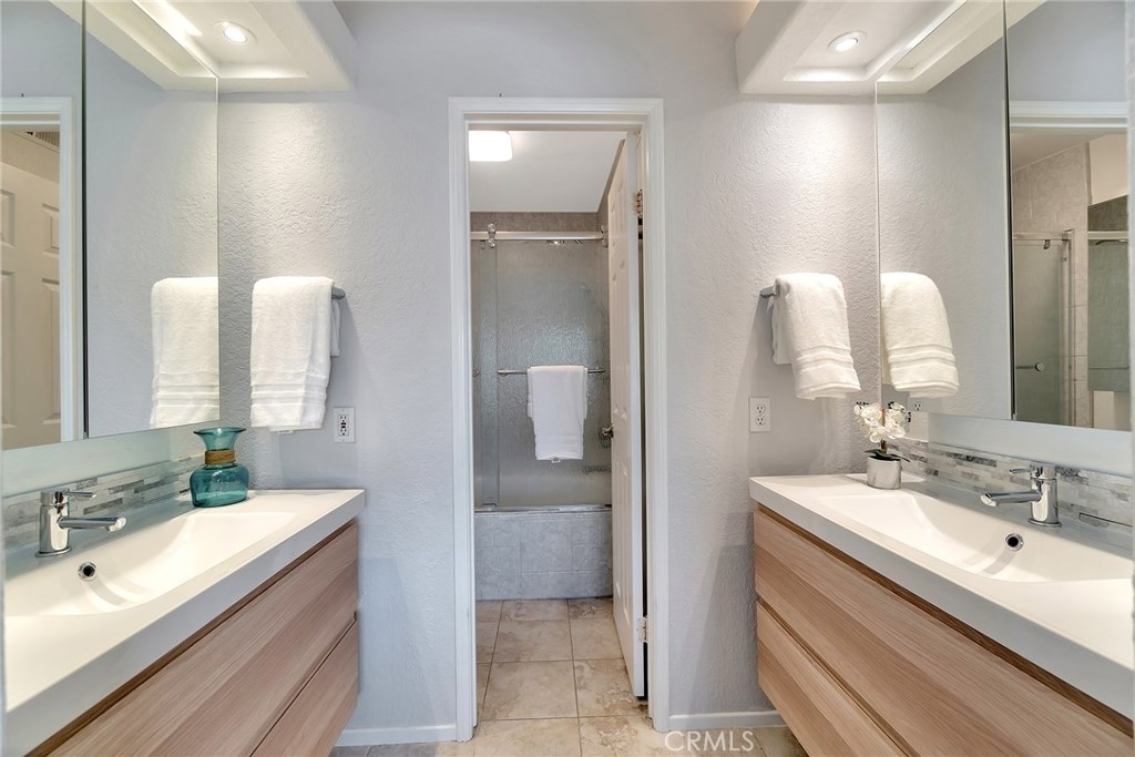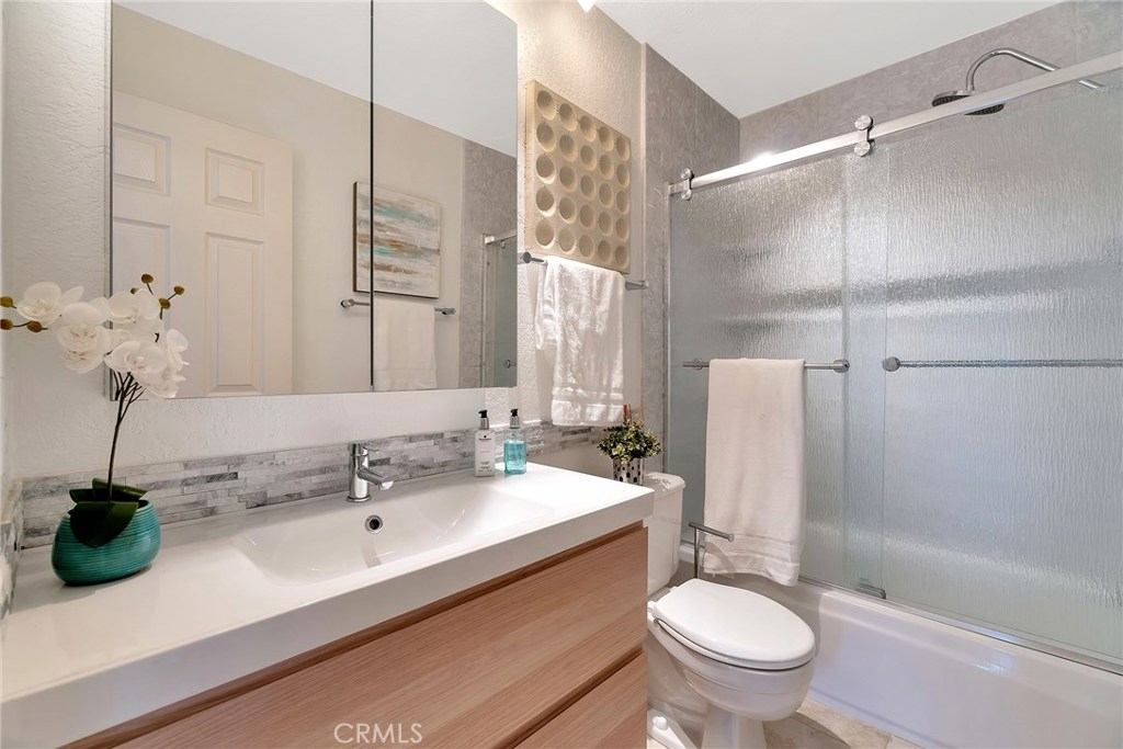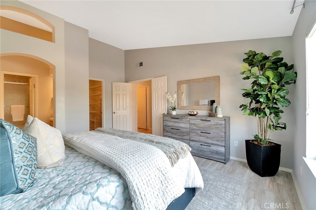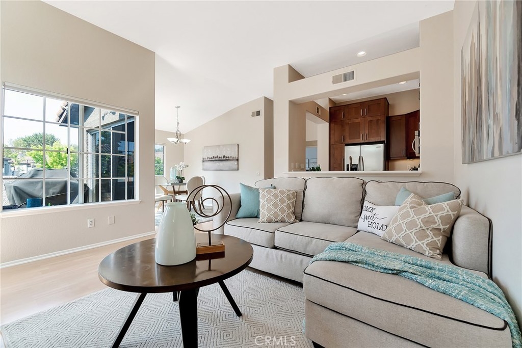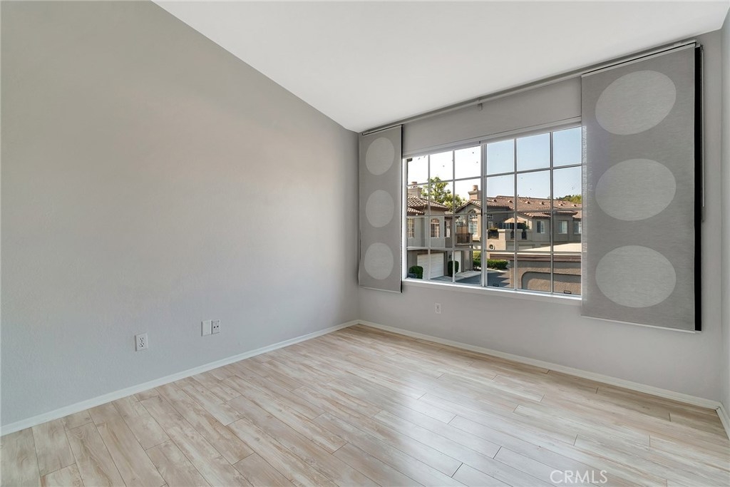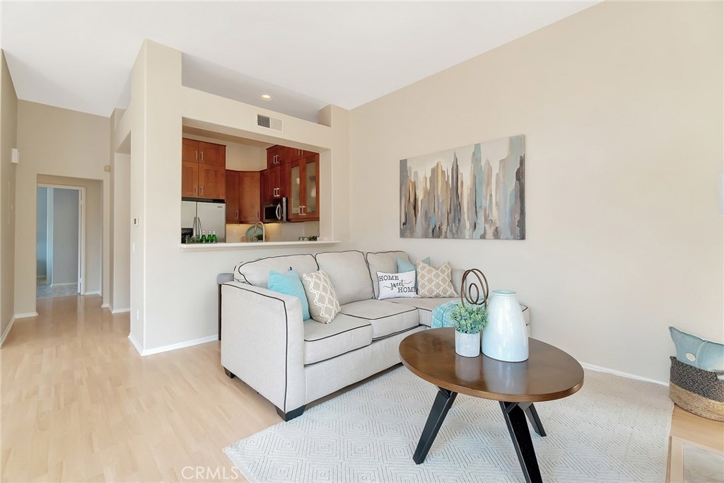 END UNIT CONDO WITH ATTACHED GARAGE IN A GATED COMMUNITY! Welcome to the highly sought after Windflower neighborhood in Aliso Viejo. This rare 2 bed 2 bath end unit condo is situated on a corner lot with plenty of open grass just out your front door for added value. The light and bright unit has been completely remodeled with fresh designer paint, coastal pine pergo flooring, and an extra large balcony for entertaining. Soaring vaulted ceilings greet you upon entry and the 2 car garage with covered carport give plenty of options for parking. The kitchen has been custom built with additional storage space, transitional cabinetry, smart enhancements, and stainless appliances. Nobody above or below you and the guest bedroom features plenty of space for large furnishings. Both bathrooms showcase updated showers and stunning vanity sinks. Your master bedroom has dramatic ceilings and is designed with open space and natural light in mind. The entire complex has been re-piped with new plumbing. Centrally located for easy access to all Aliso Viejo shopping, dining, and entertainment. Don't miss the opportunity to own a truly move in ready unit.