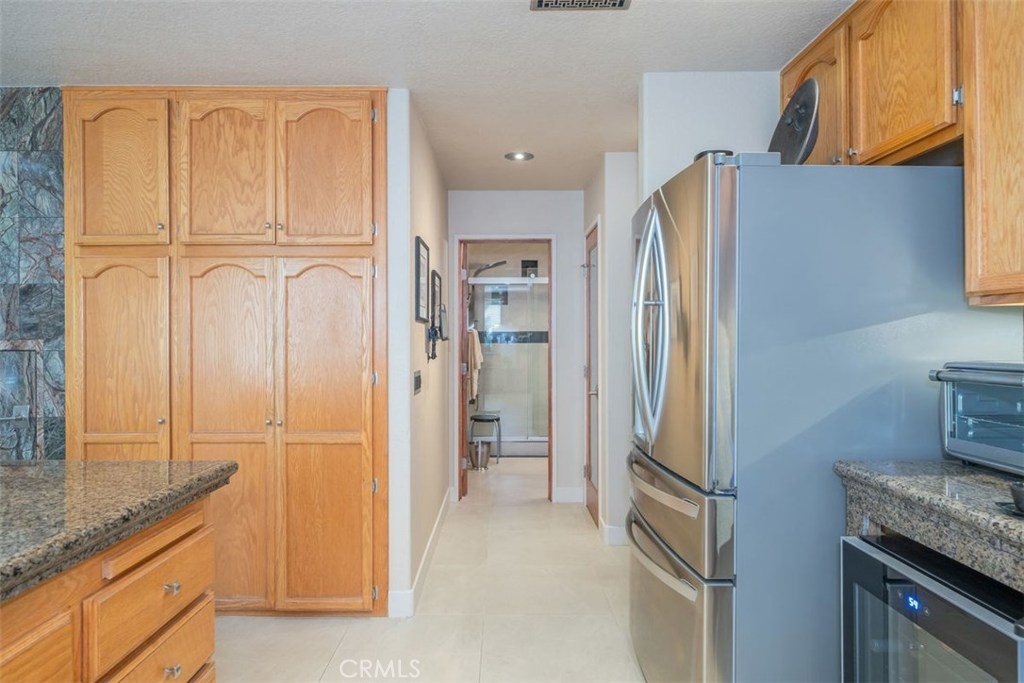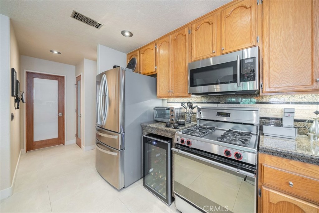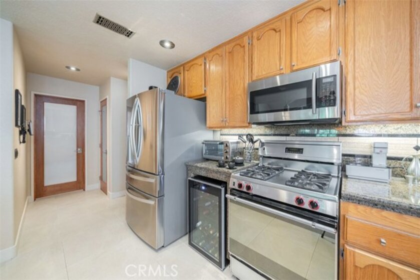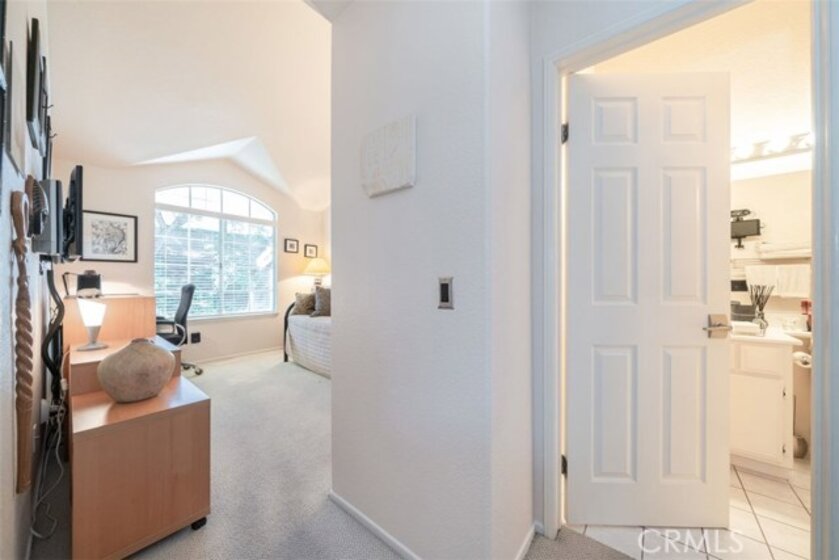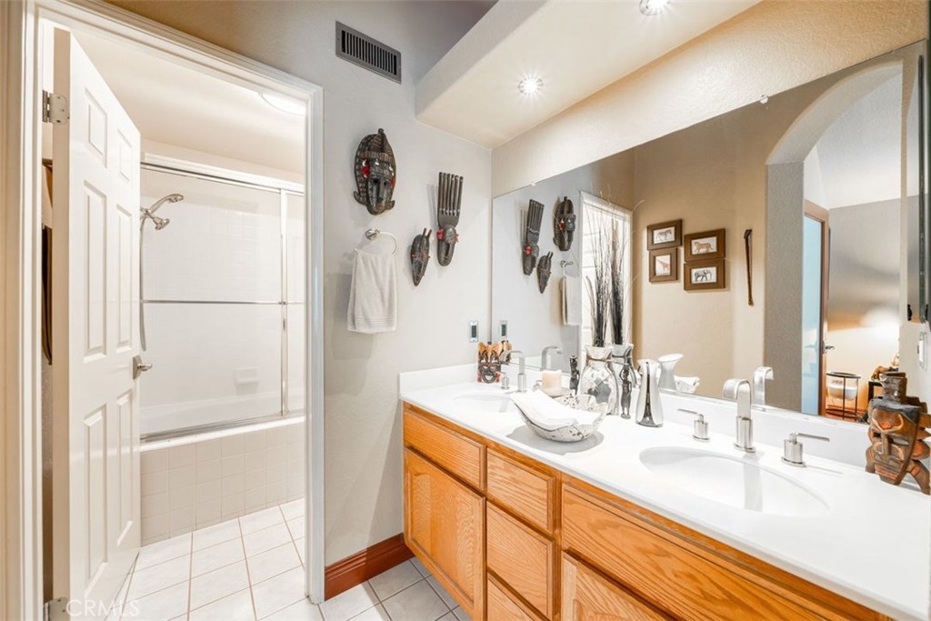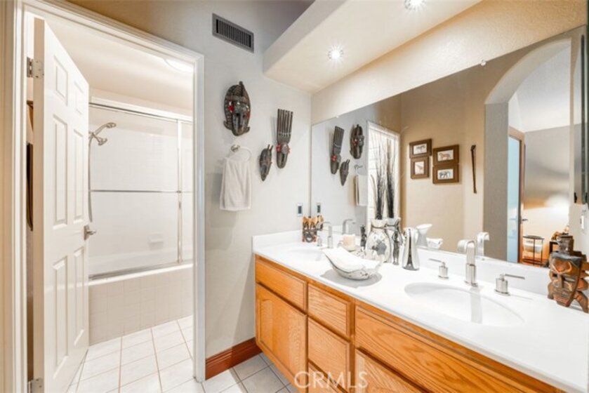 This home is a must see gem! This lightly lived in 3 bed/3 bath dual-master home in a gated community shows like a model and features rare main floor bedroom with full bathroom with custom tile, body shower system, stainless vanity and stone vessel sink, European toilet, LED backlit mirror and Bluetooth speakers create a spa-like atmosphere! With over $80,000 in detailed, quality, meticulous upgrades and extras. Recent upgrades – PEX plumbing, modern fixtures, window coverings, newer A/C, hardware, LED lighting/accent lighting with dimmers for ambiance, granite counters with customized backsplash, Italian porcelain floors, fossilized rainforest marble from Southern India accents the walls, Italian limestone fireplace and mantle, frosted glass interior doors, Samsung microwave, Bosch dishwasher, chef’s sink, 4 door refrigerator! Upstairs features master bedroom with custom lighted entertainment center, dual sinks, shower/tub. Wi-Fi enabled garage door opener, built-in and Gladiator cabinets in garage, newer water heater, and a water softener. Patio has bib for gas BBQ and two retractable screen doors. Highly desired location that faces sloped greenbelt for privacy and beauty. Western exposure with shade trees that make this home naturally energy efficient (light UV tint strategically placed on window that ensures interior belongings are protected from fading) while high vaulted ceilings and atrium windows in kitchen/dining area create open brightness throughout the day.