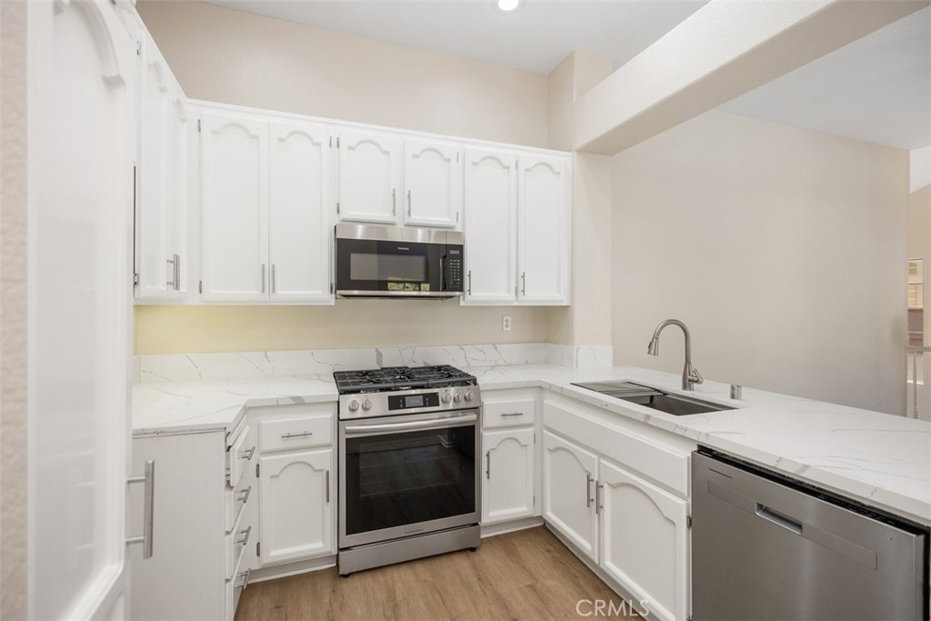 LIGHT, BRIGHT & CLASSY CARRIAGE UNIT WITH NO ONE LIVING ABOVE OR BELOW YOU! WINDOWS GALORE TO BRING IN THE SUNSHINE. DIRECT ACCESS TO YOUR OWN GARAGE. THIS ONE HAS IT ALL! Amazing entry with an impressive curved staircase leading to a very spacious living room and separate dining area. Wonderful oversized patio adjacent to the living & dining rooms for easy entertaining. This patio is truly large! Remodeled kitchen with brand new stainless steel appliances, brand new quartz counter tops and a new stainless steel sink, faucet and garbage disposal. Lots of counter space as the kitchen is open to the living room. Very large master bedroom with double sink vanities & a walk-in closet. Attached garage and an assigned covered parking space are nearby. The garage has room for storage as well as ample space for a large washer and dryer. This particular floorplan and this home's location is ideally located in a lovely and well-manicured gated community with a heated pool, spa, BBQ and play area located just across the street from the wonderful Aliso Viejo Town Center with its movie theaters, restaurants & great shopping. Terrific award-winning schools nearby, easy access to the toll roads and other major freeways plus close by hiking, biking and nature trails. Another real plus - it is a very short and lovely drive to downtown Laguna Beach. This home is not only beautiful but it is ideal for someone who enjoys being within walking distance to great shopping, restaurants and Trader Joes!