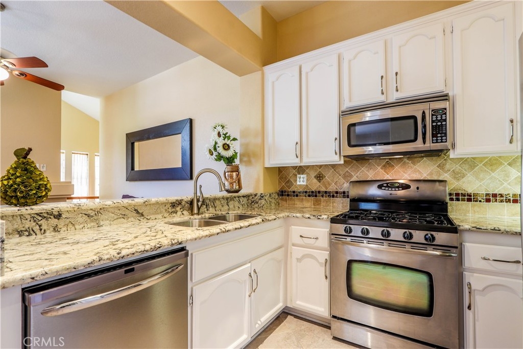 Upper Corner -End unit , with no one above or below you. Located in highly sought after gated community of Windflower. Nice and bright with lots of windows. Formal living room and dininning room with sliding door to large spacious patio/deck, vaulted ceilings with ceiling fans. Custom window coverings. Upgraded kitchen, new granite counter tops, stainless steel appliances. Large master bedroom, vaulted ceiling, dual vanities, with huge walking closet. Oversize attached one car garage with laundry hookups and storage and one assigned carport with storage unit . The community itself has been totally re-piped with PEX. Close to the Community pool and spa and walking distance to Aliso Viejo Town Center that provides many dining and shopping options and entertainment.